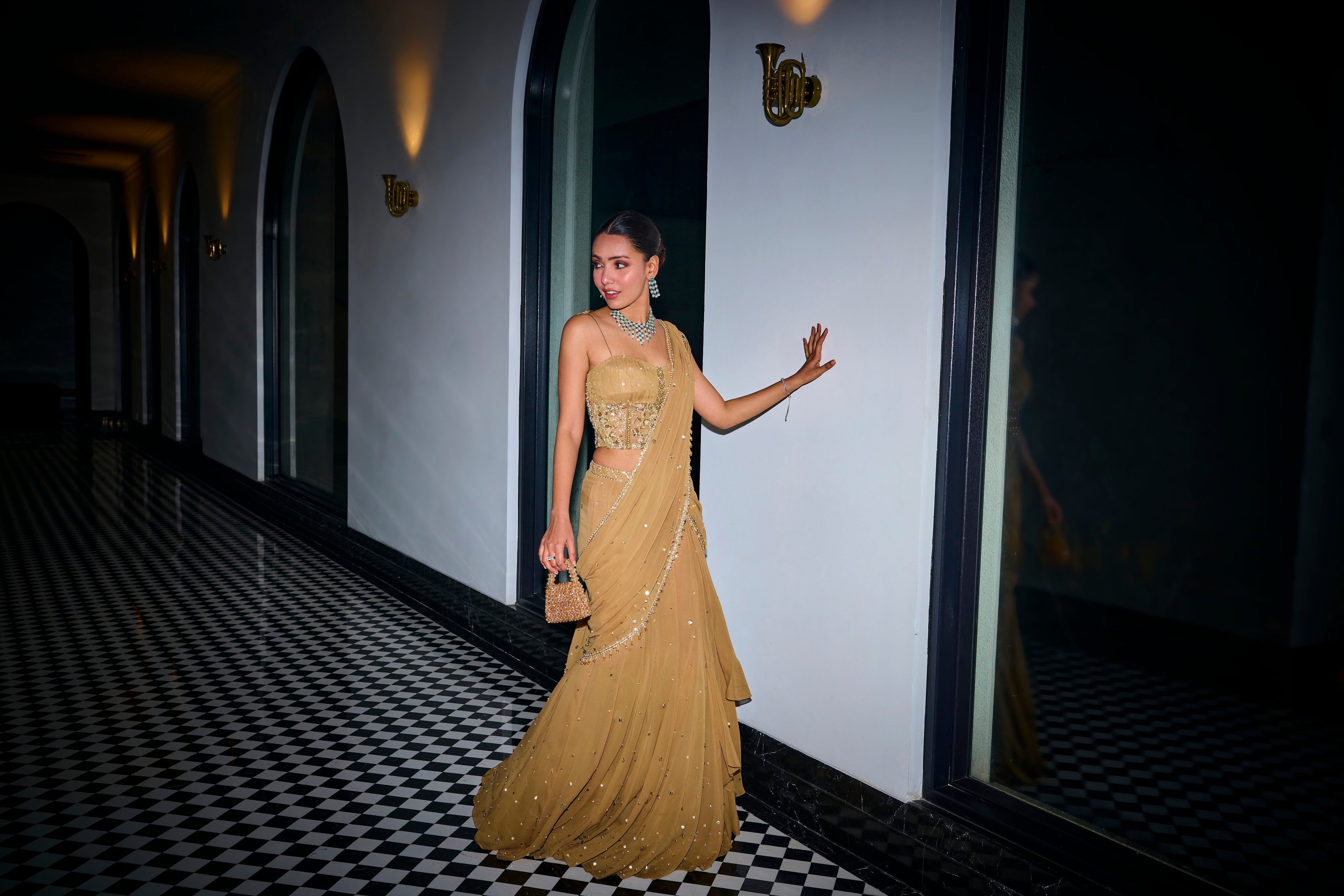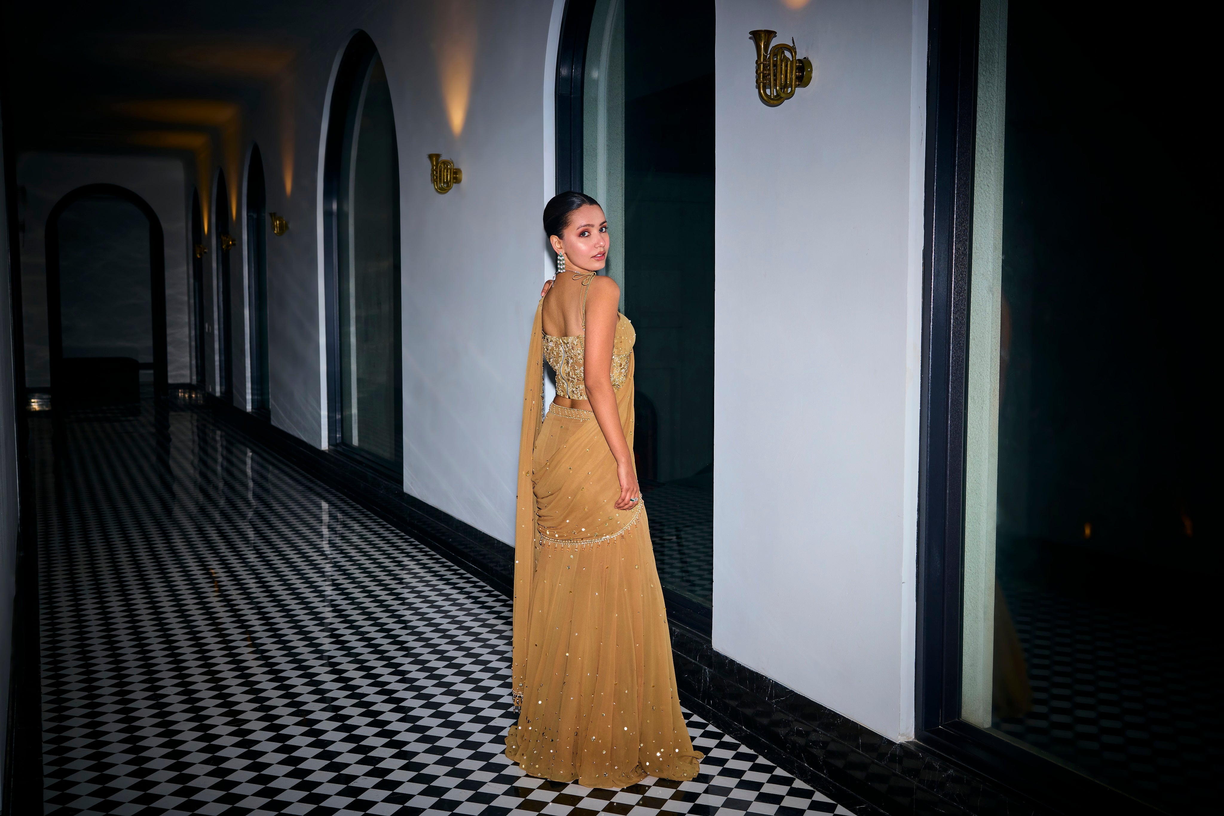 | Gold sequins embroidered tiered saree in georgette base, it has sequins cheeta all over the skirt and palla. The palla also has hand embroidered borders and tassel detailing. It is paired with a hand embroidered ruching detail corset with tie-ups |