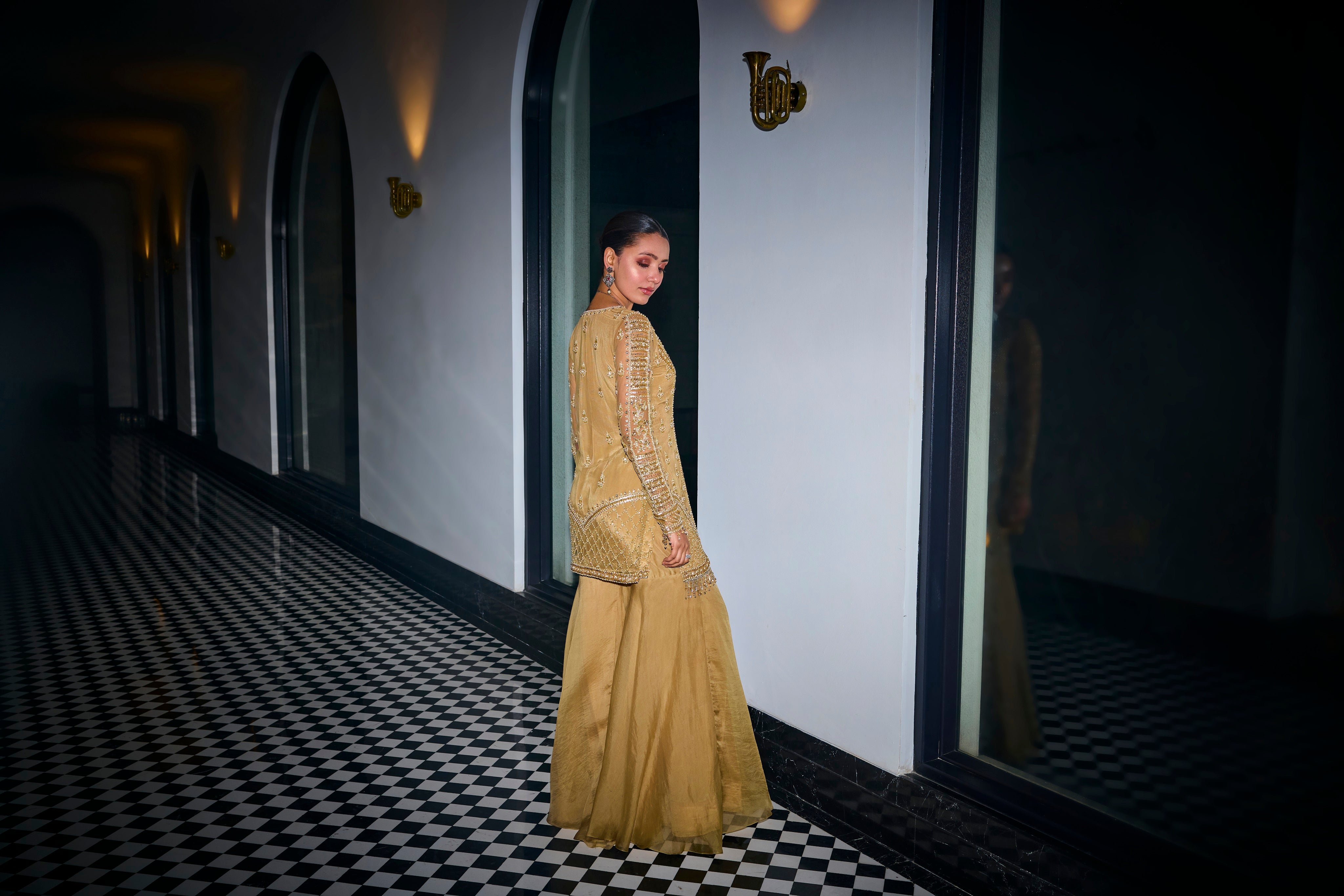 Gold tonal hand embroidered full sleeves kurta with organza sharara and matching net dupatta.