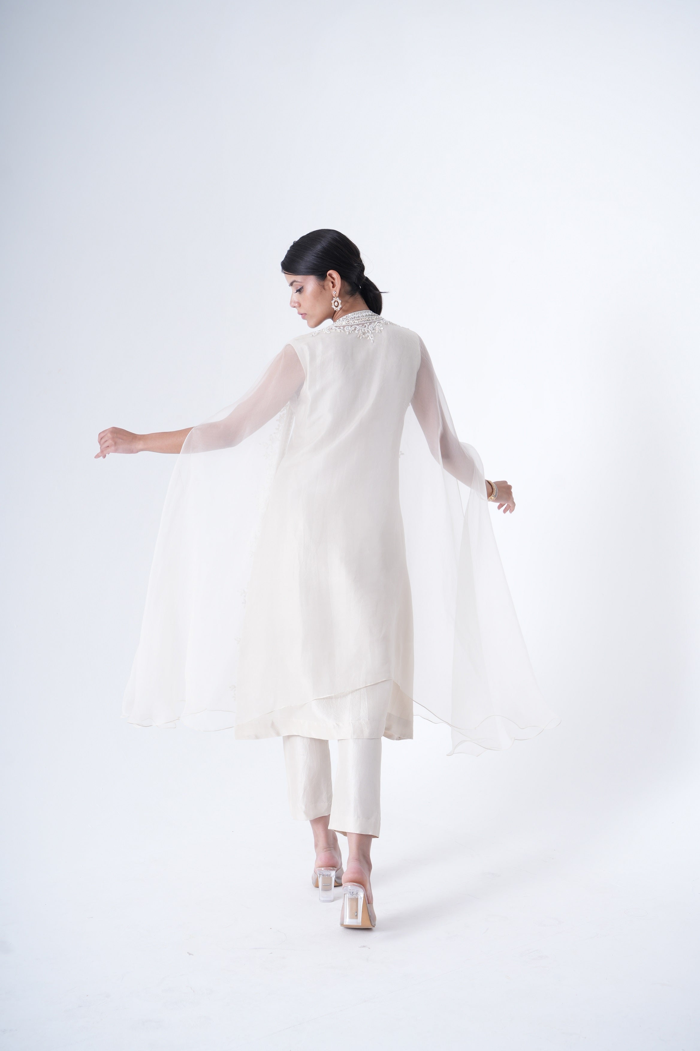 | Heavy embroidered long jacket paired with full embroiderd bustier and satin skirt which has embroidery detailing on the belt. |