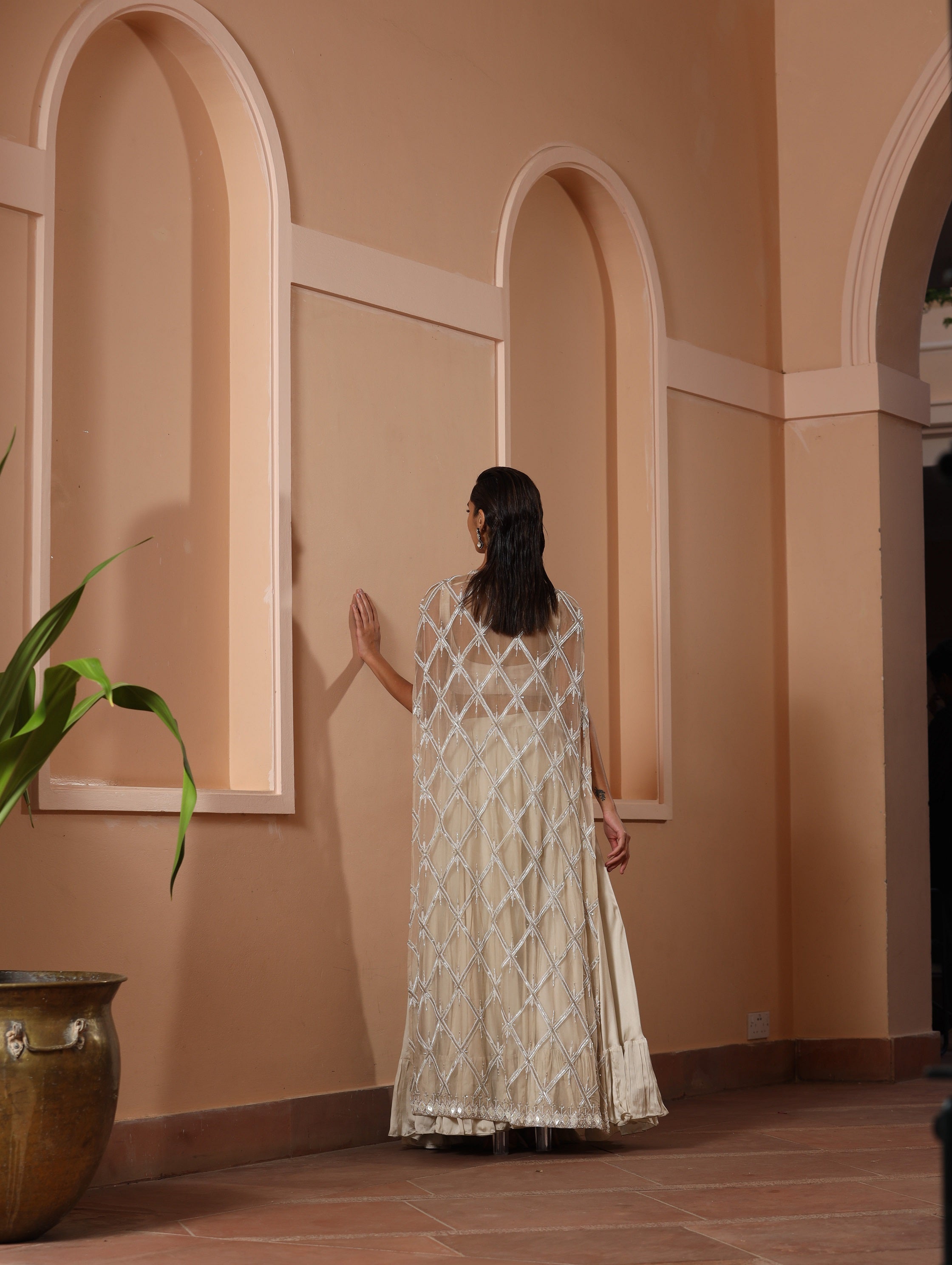| Fully embroidered long jacket. The outfit is paired with a beautiful bustier adorned with intricate embroidery on its front and back. |
