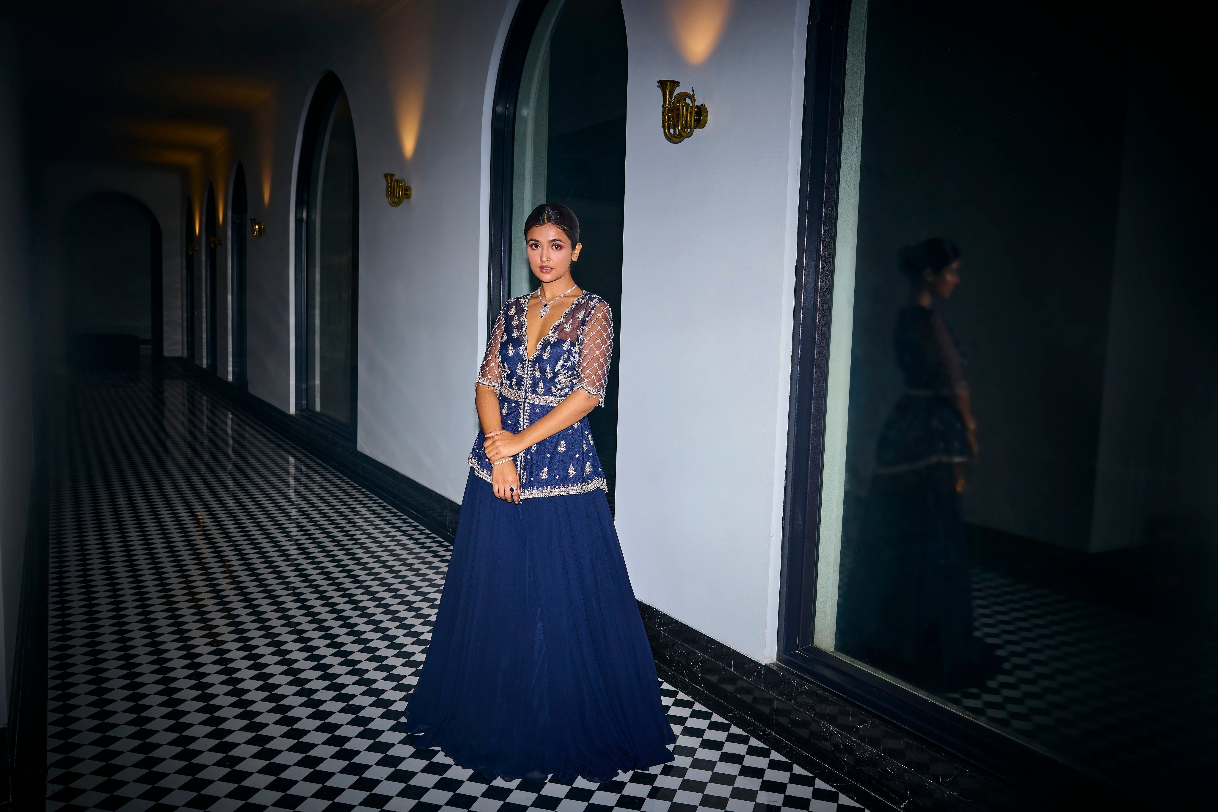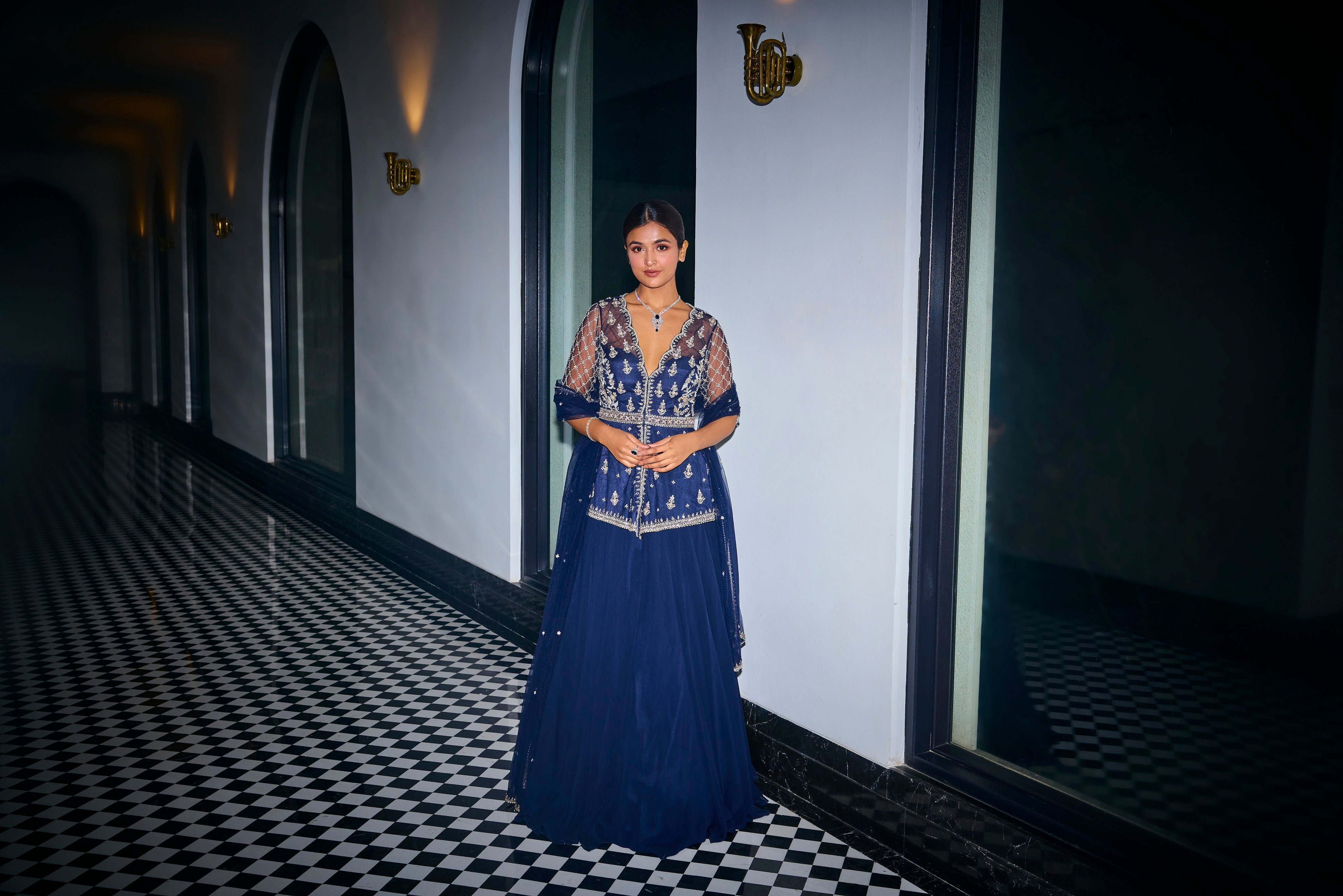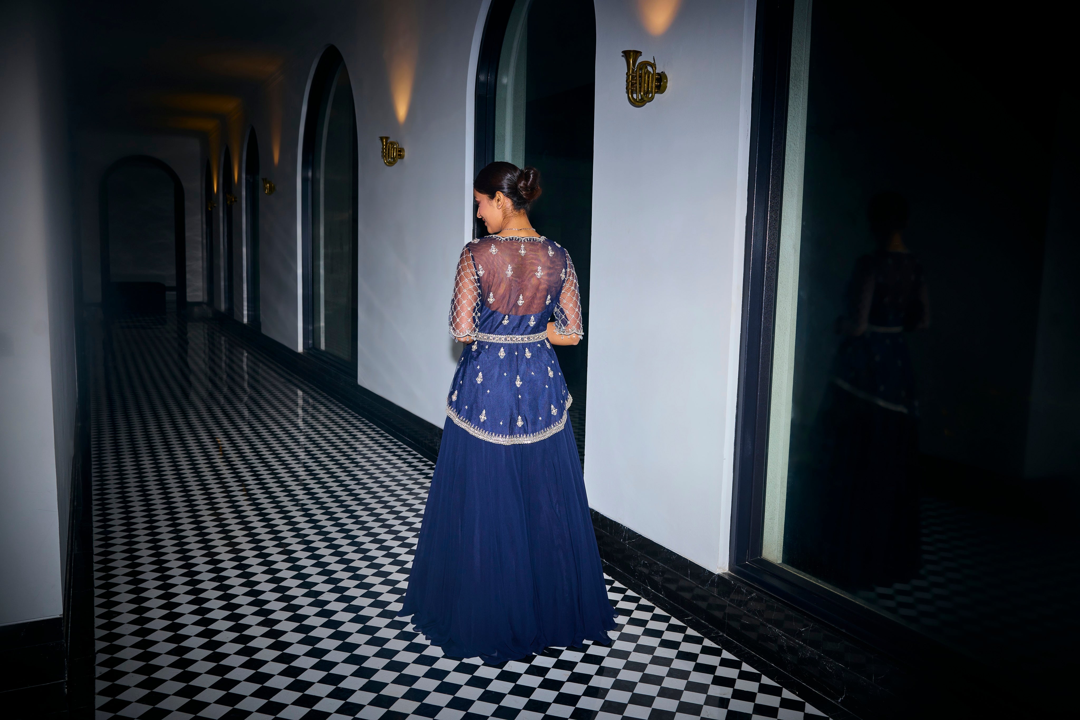 | Midnight blue hand embroidered asymmettric peplum. It is embroidered with sequins, stones and beads, features a V neckline and handmade tassels at the sleeves. It is paired with a georgette flowy skirt and a net dupatta. |