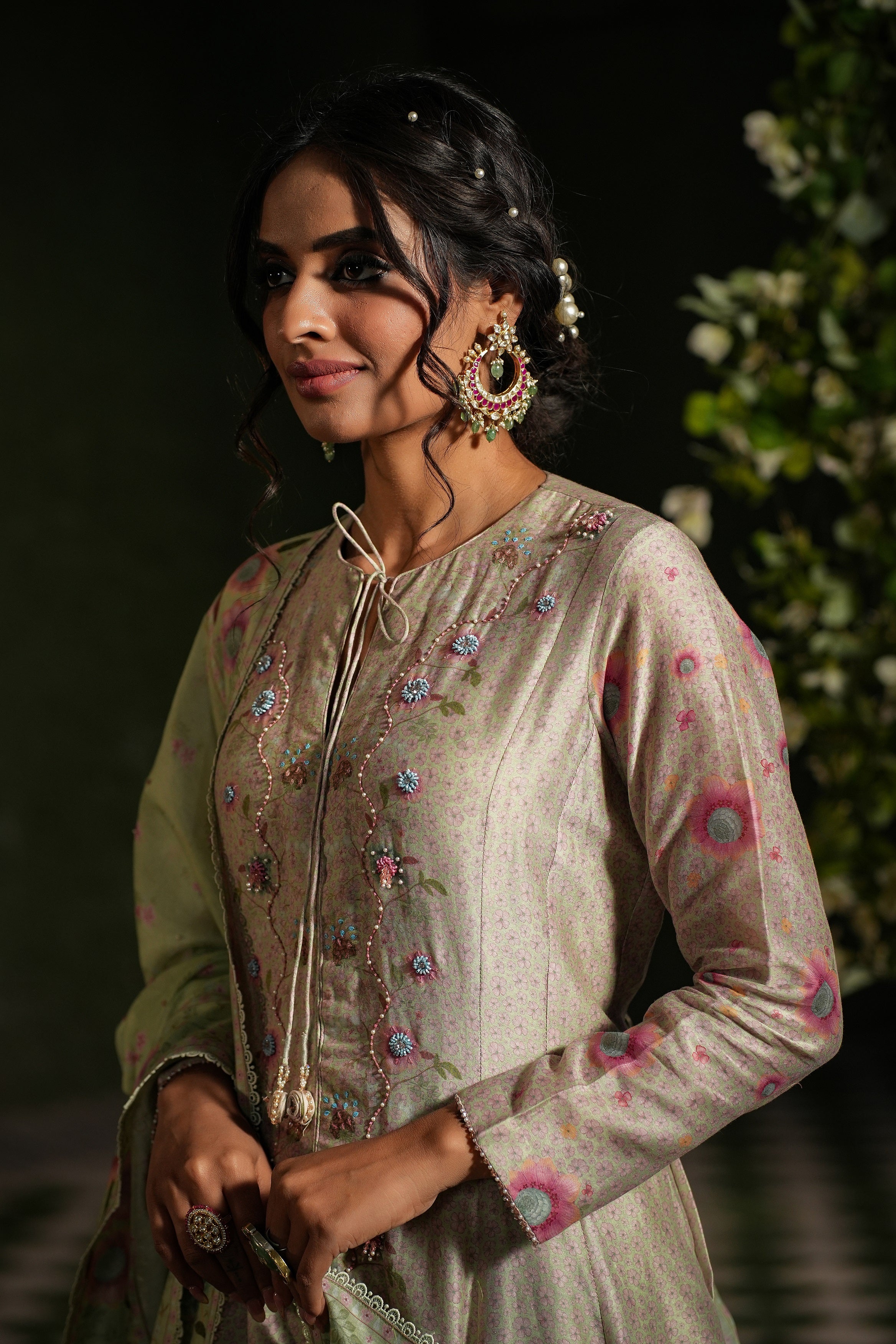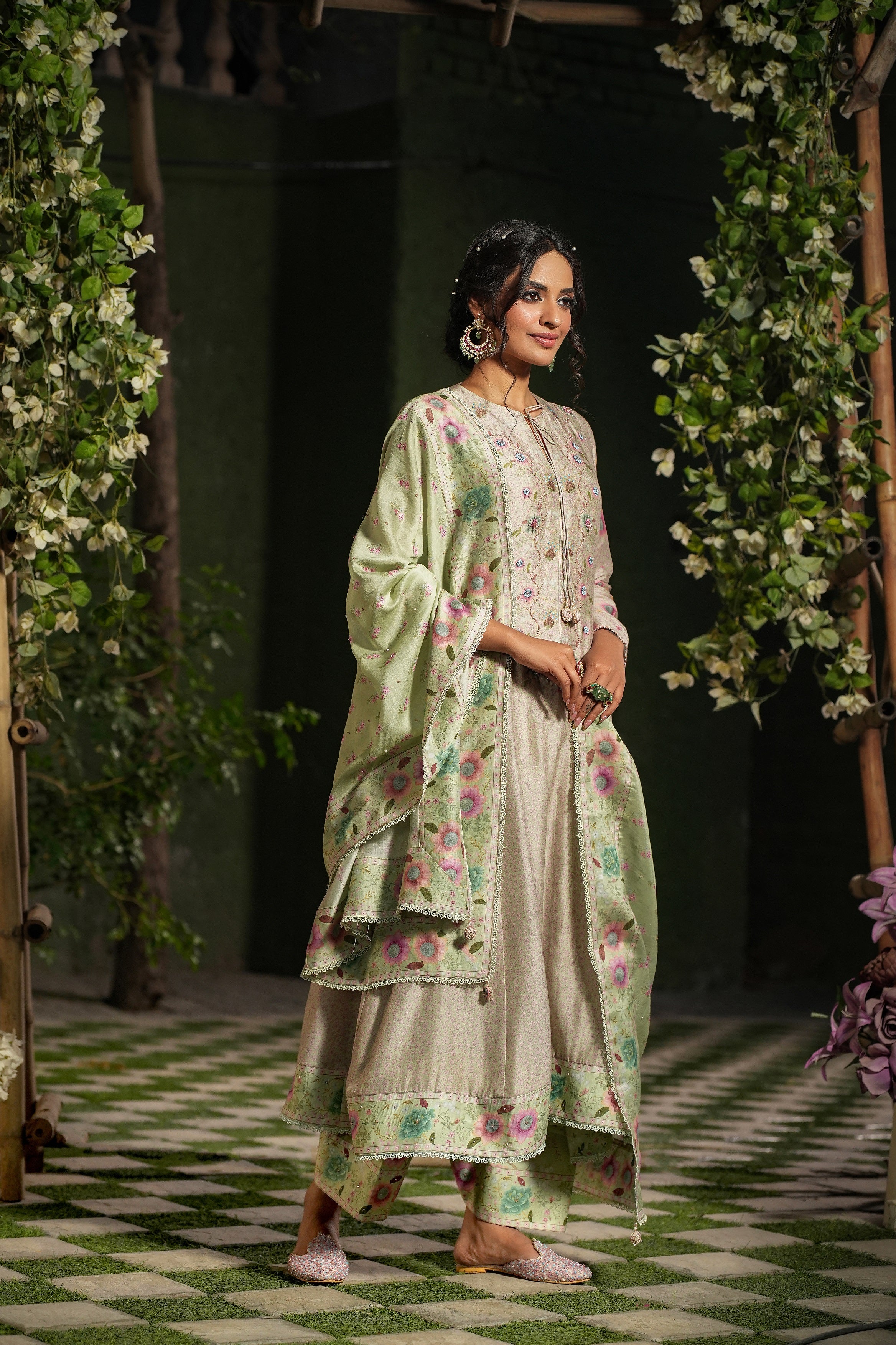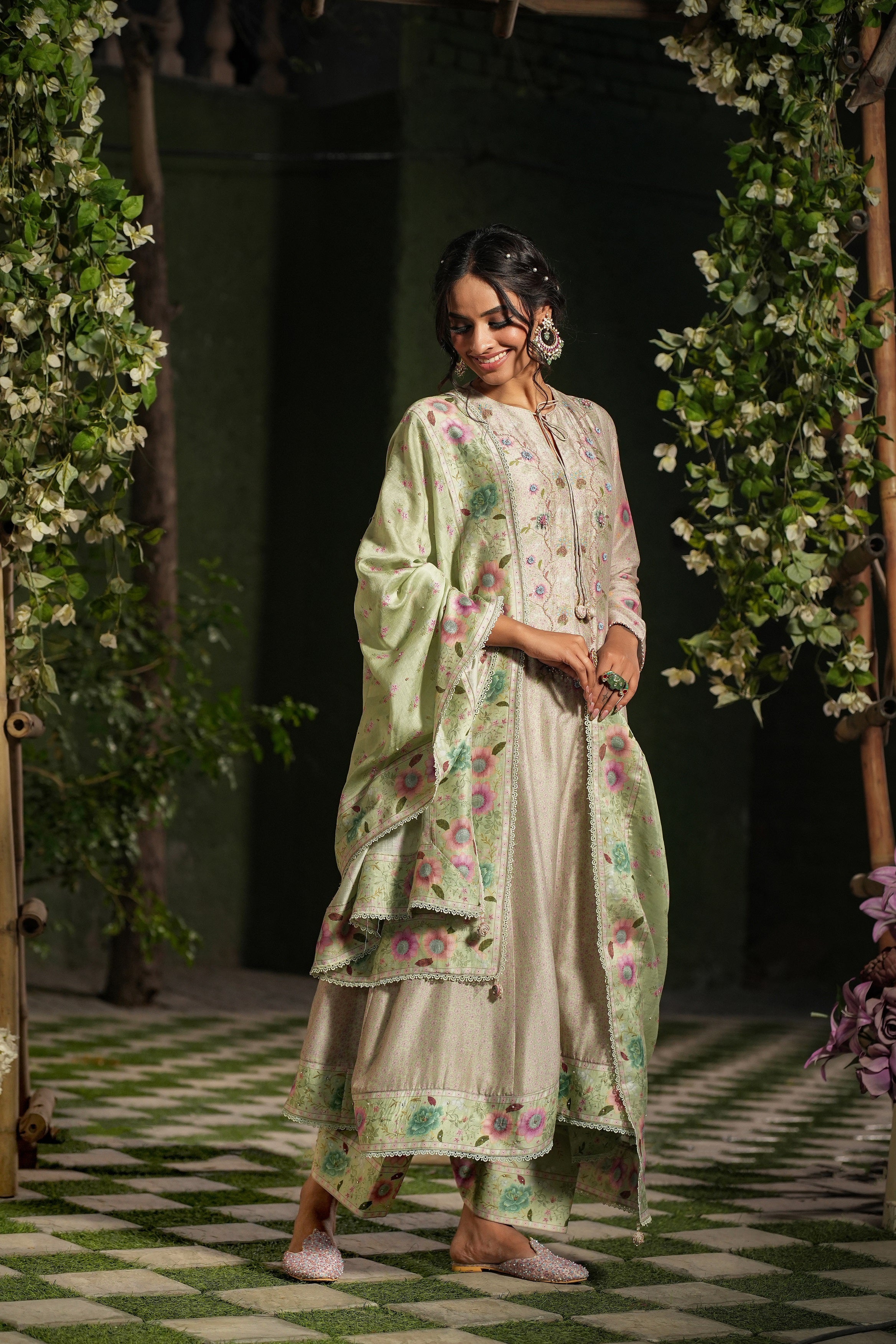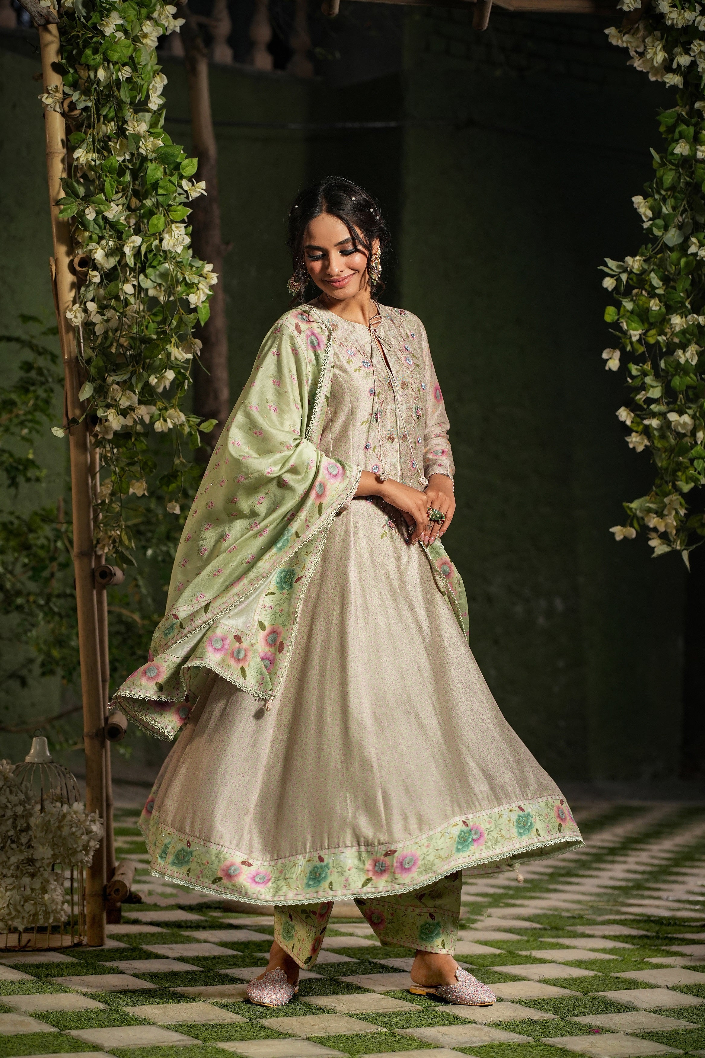 | This 3pc printed kalidar kurta set comes with heavily embroidered neckline and hem line . Also paired with salwar and dupatta with embroidery and lacey details |