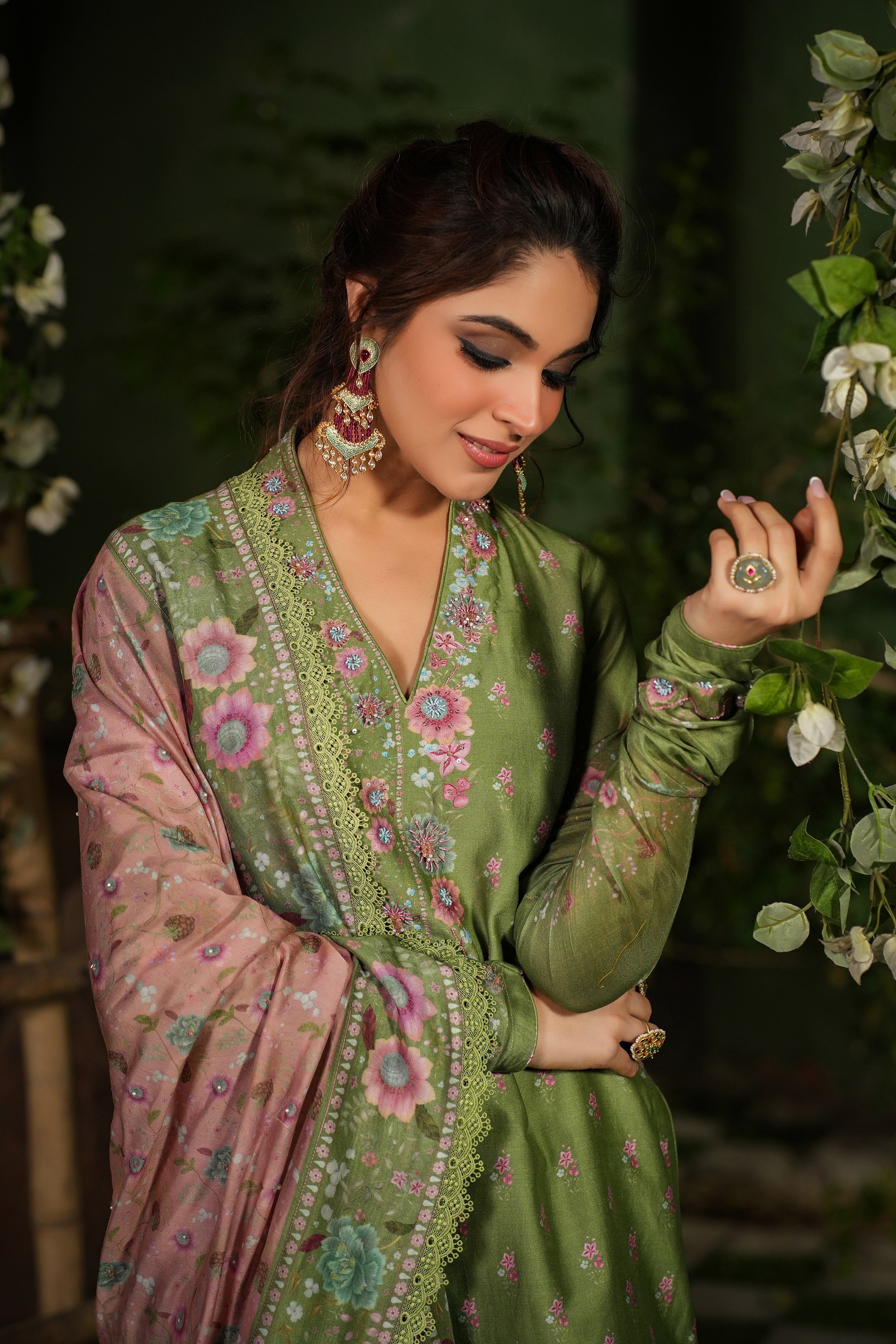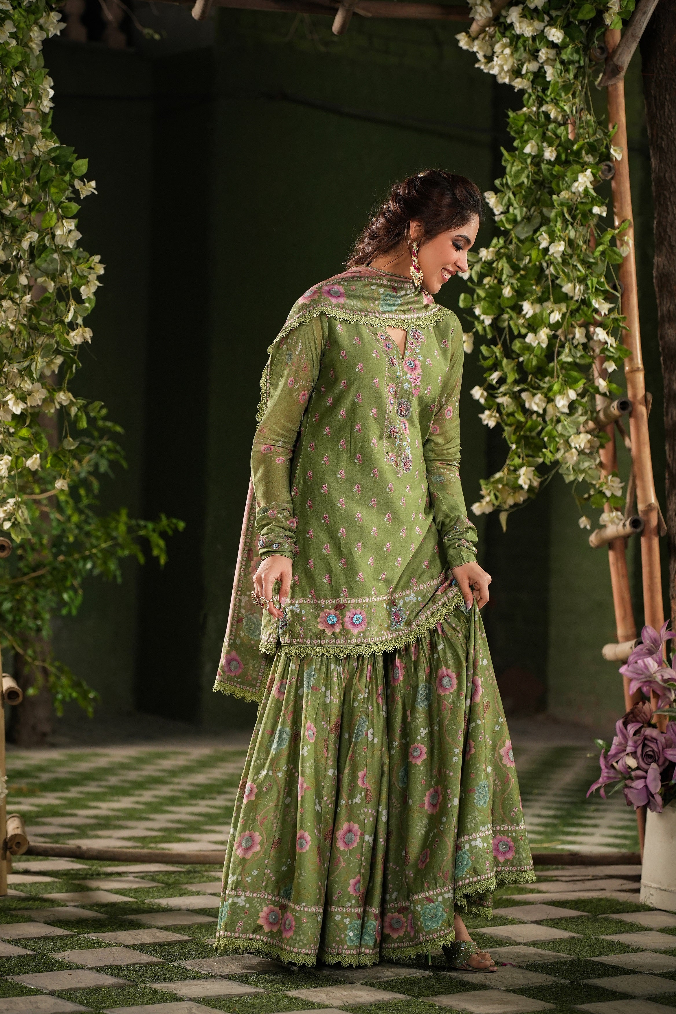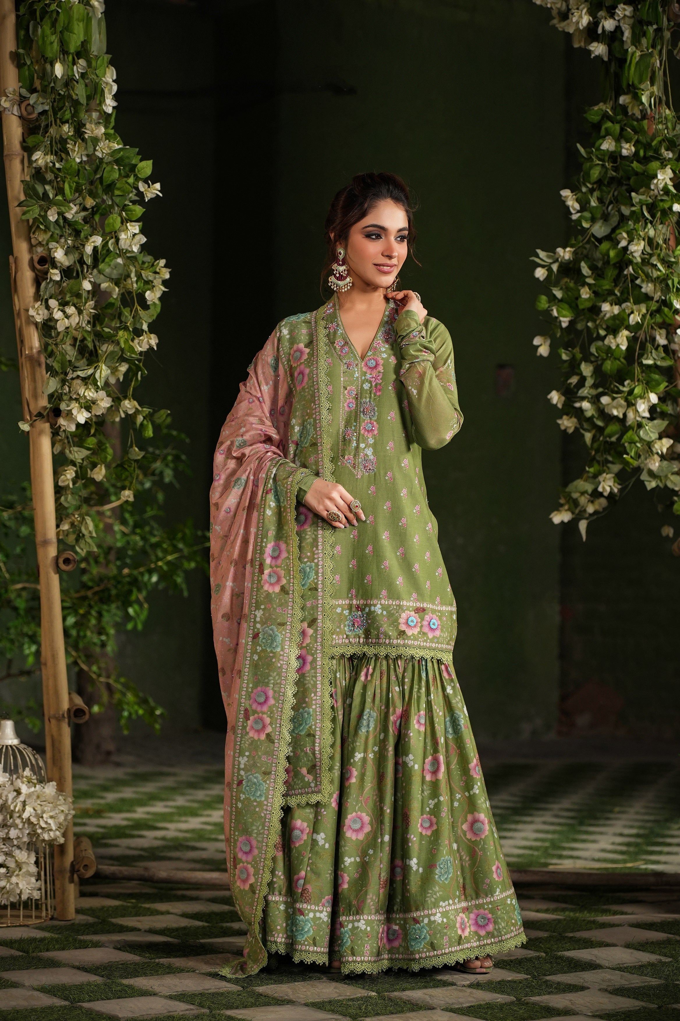 This 3pc all over printed sharara set comes with embroidered neckline, hem line and churidar sleeves. The sharara border is delicately sprinked with cheentas . It is also paired with dupatta with embroidery and lacey details .