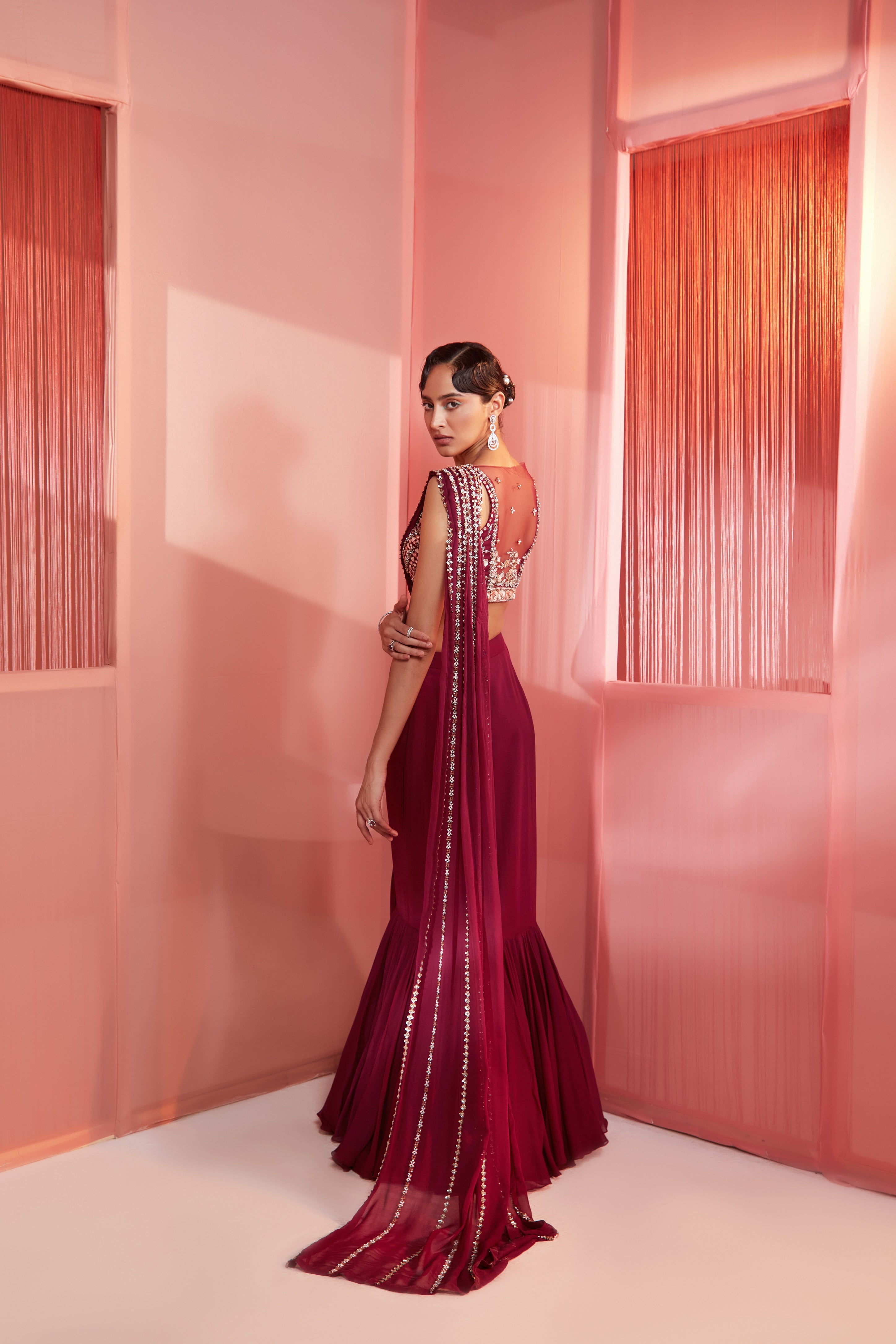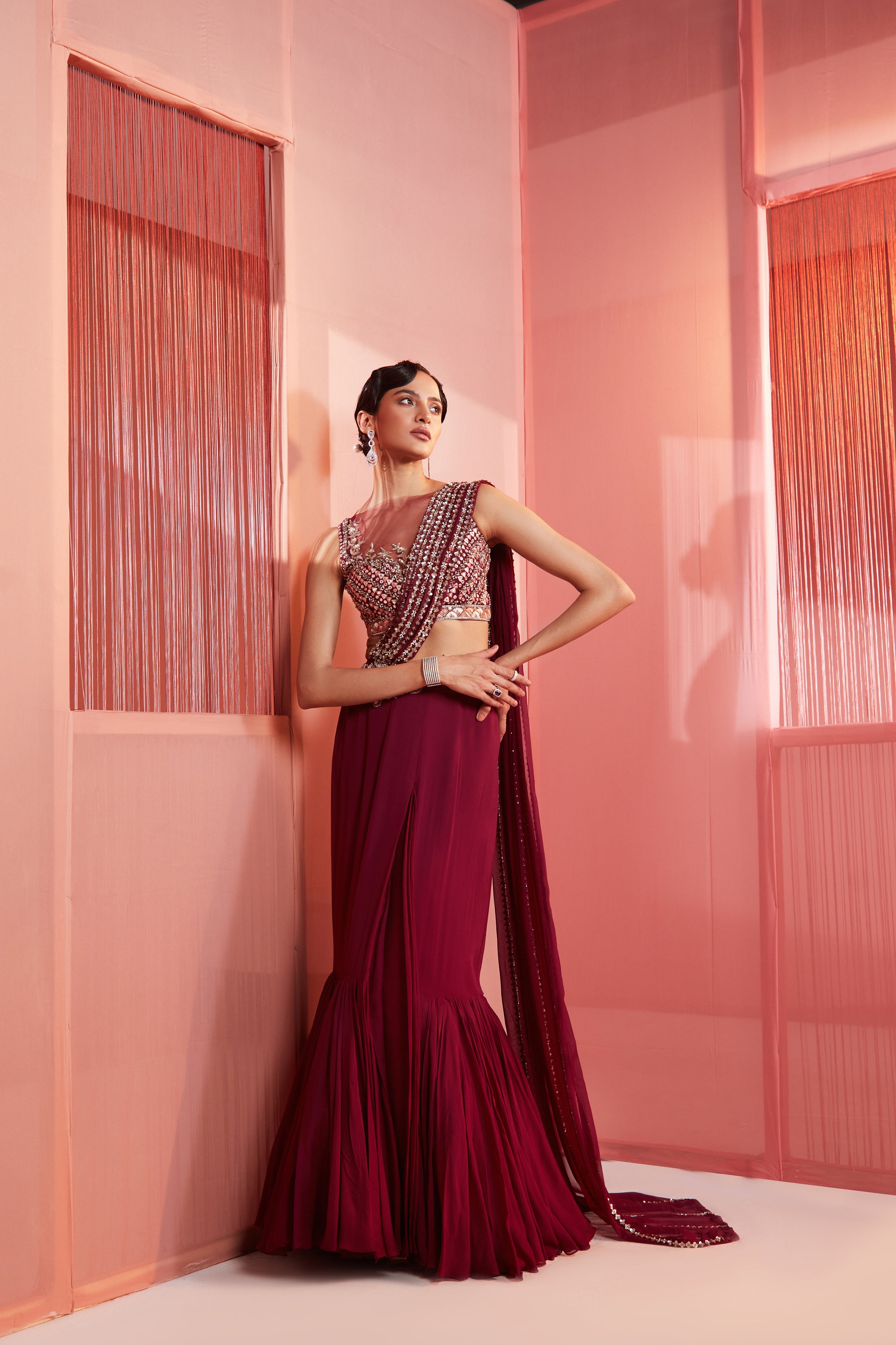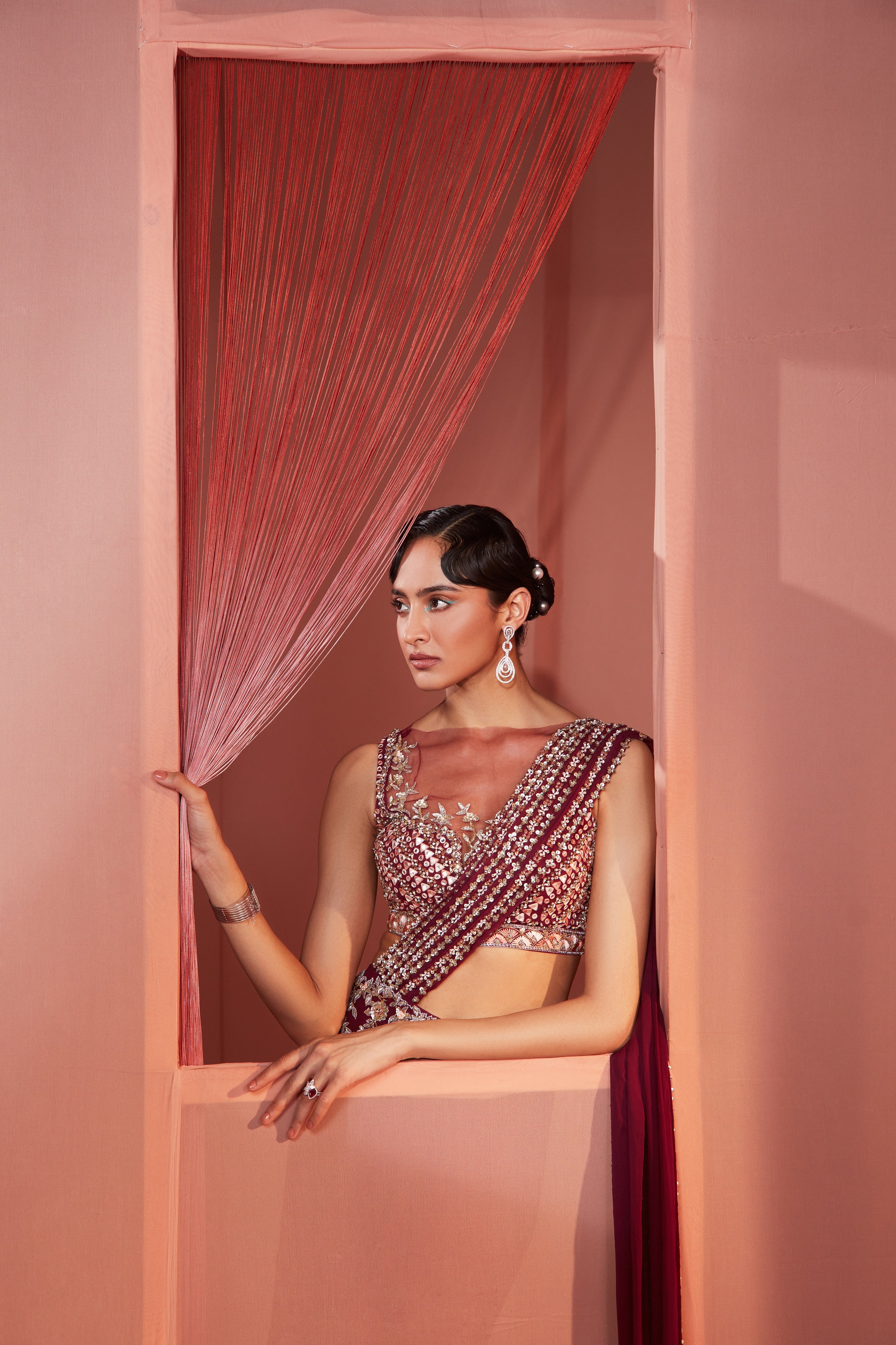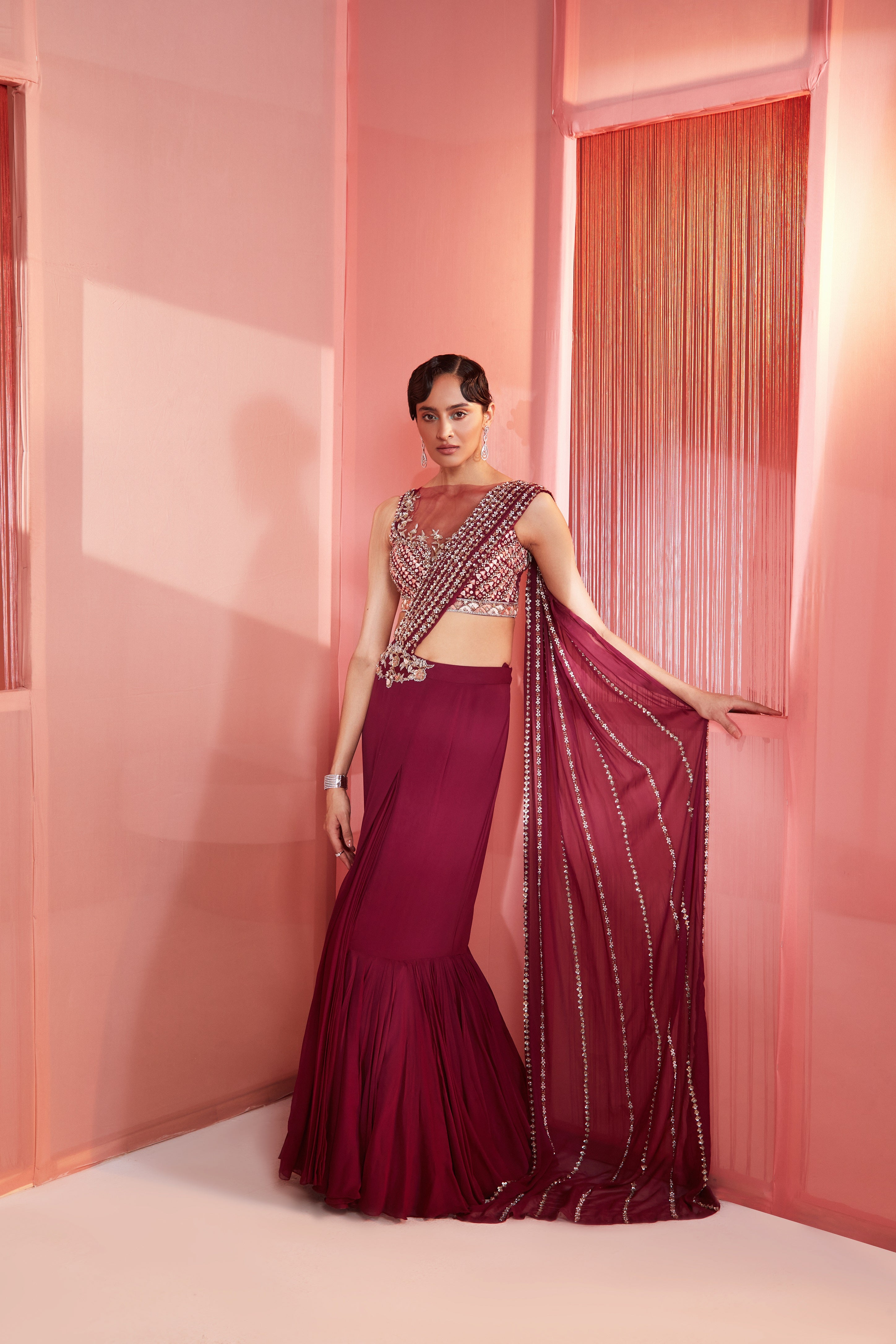 | Plum Pre-stitched saree with an embroidered palla, it has beautiful sequins and stone embroidered stripes. It is paired with a multi-color resham and mirror embroidered blouse. |