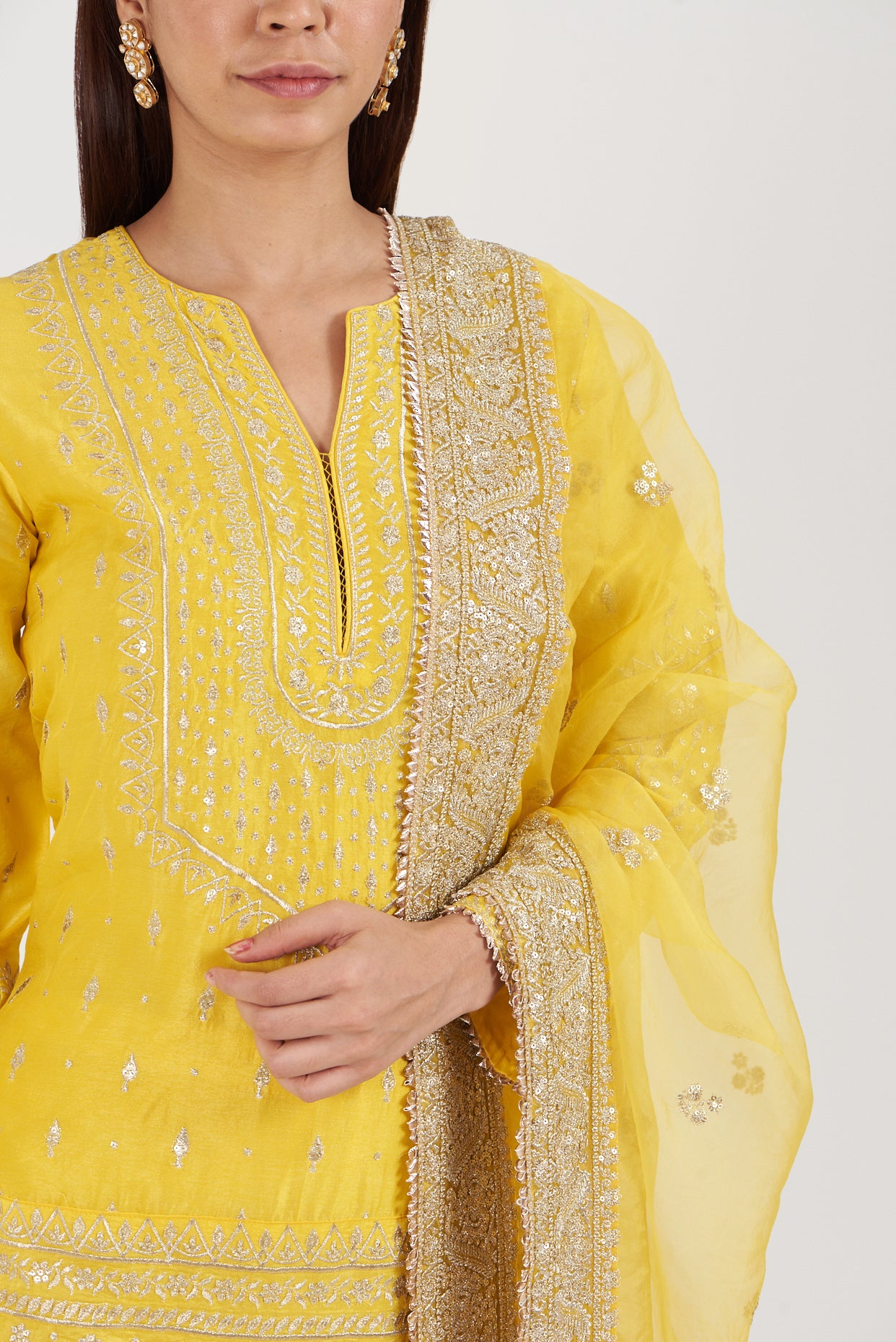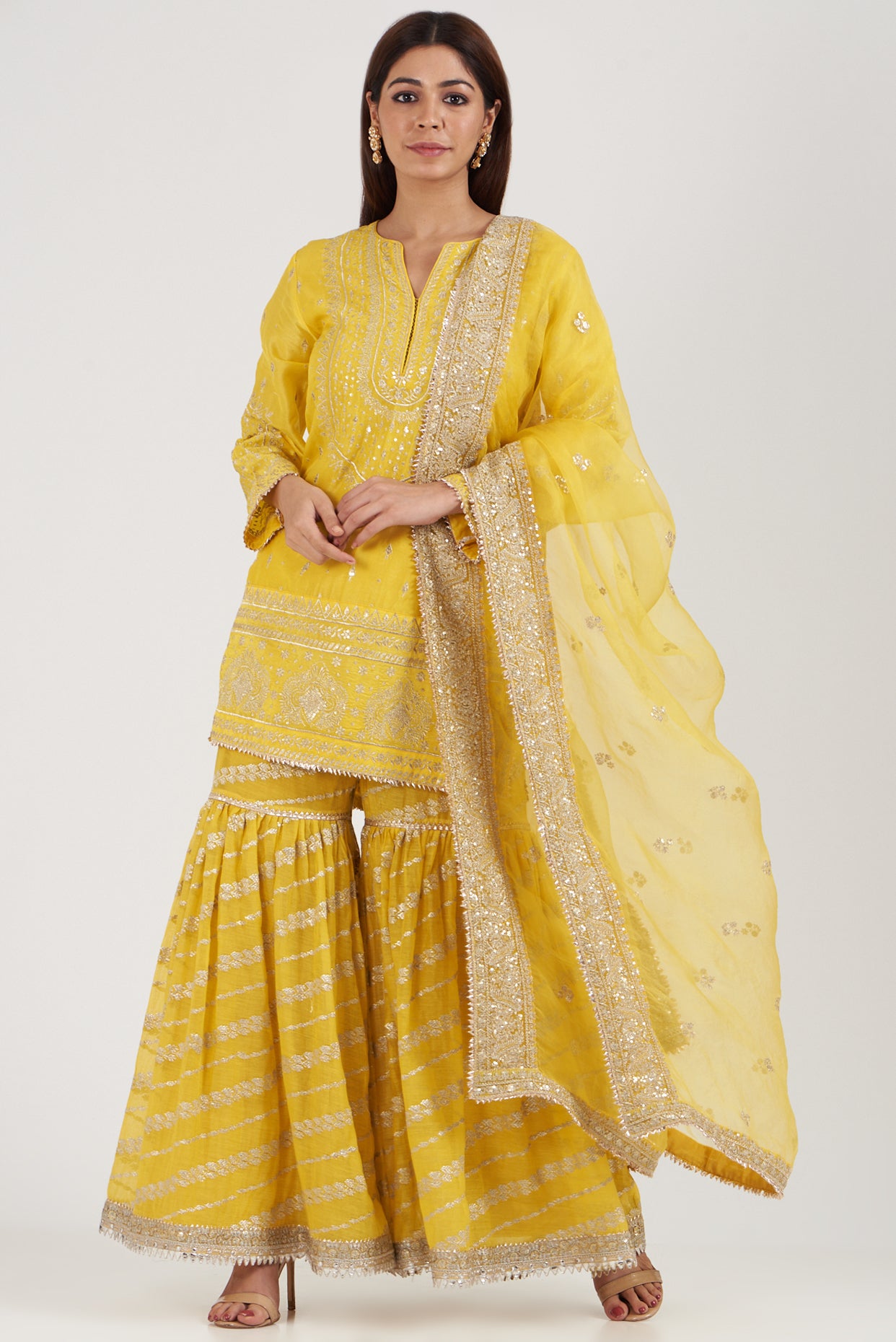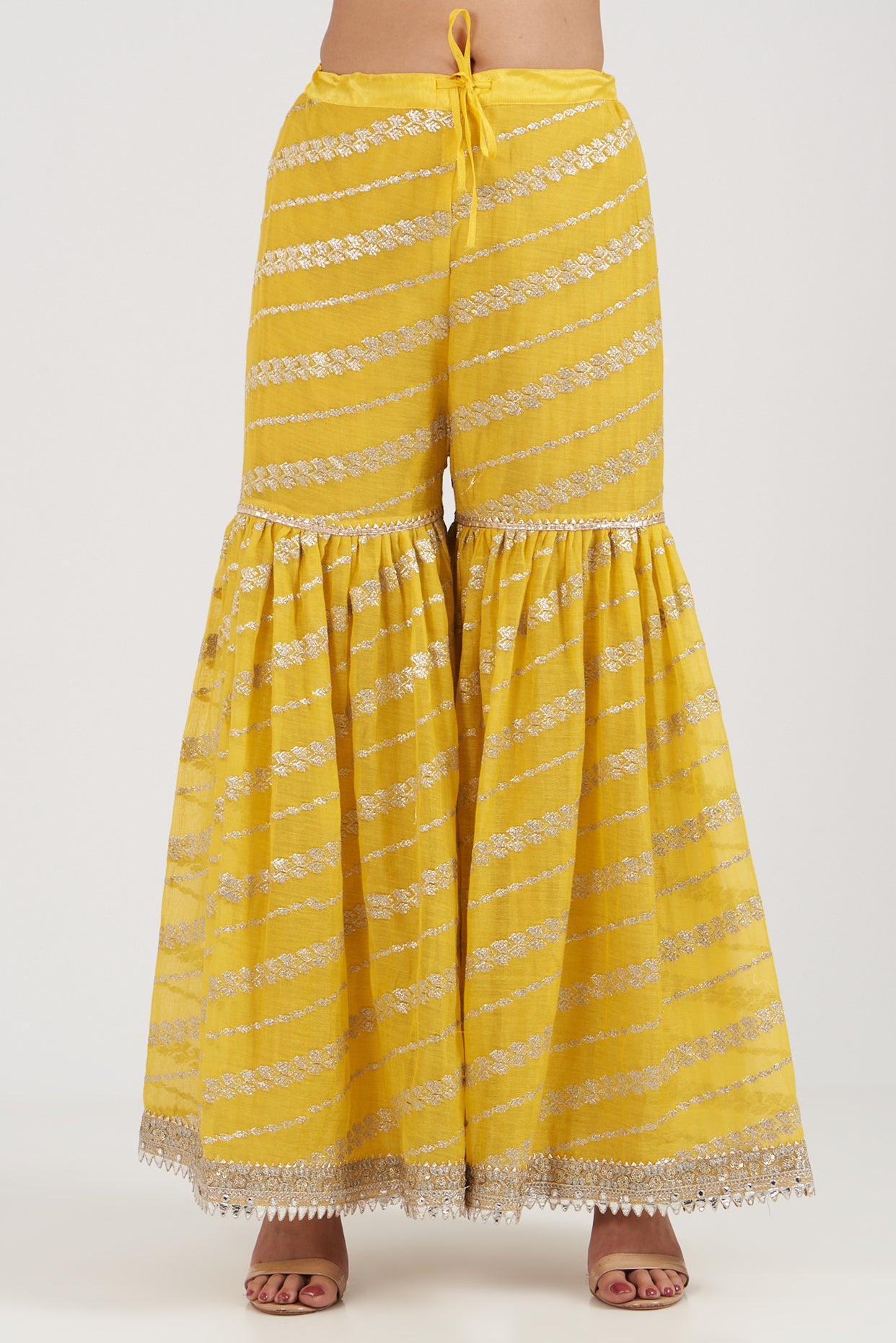 Jamdani sharara Set with rich trim make this collection a- go to for the season of weddings! it is embellished with gota and thread work, paired with sharara and dupatta.