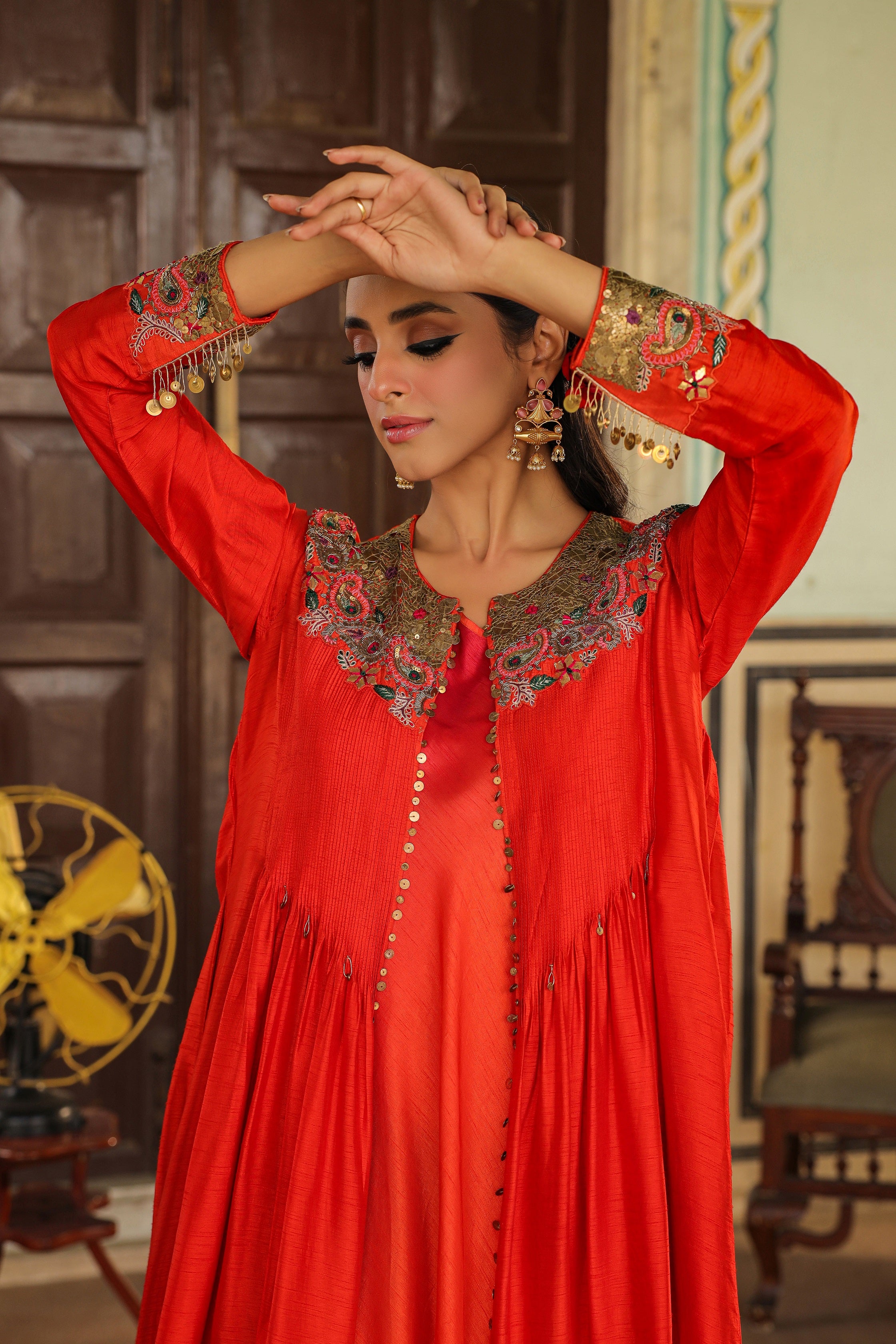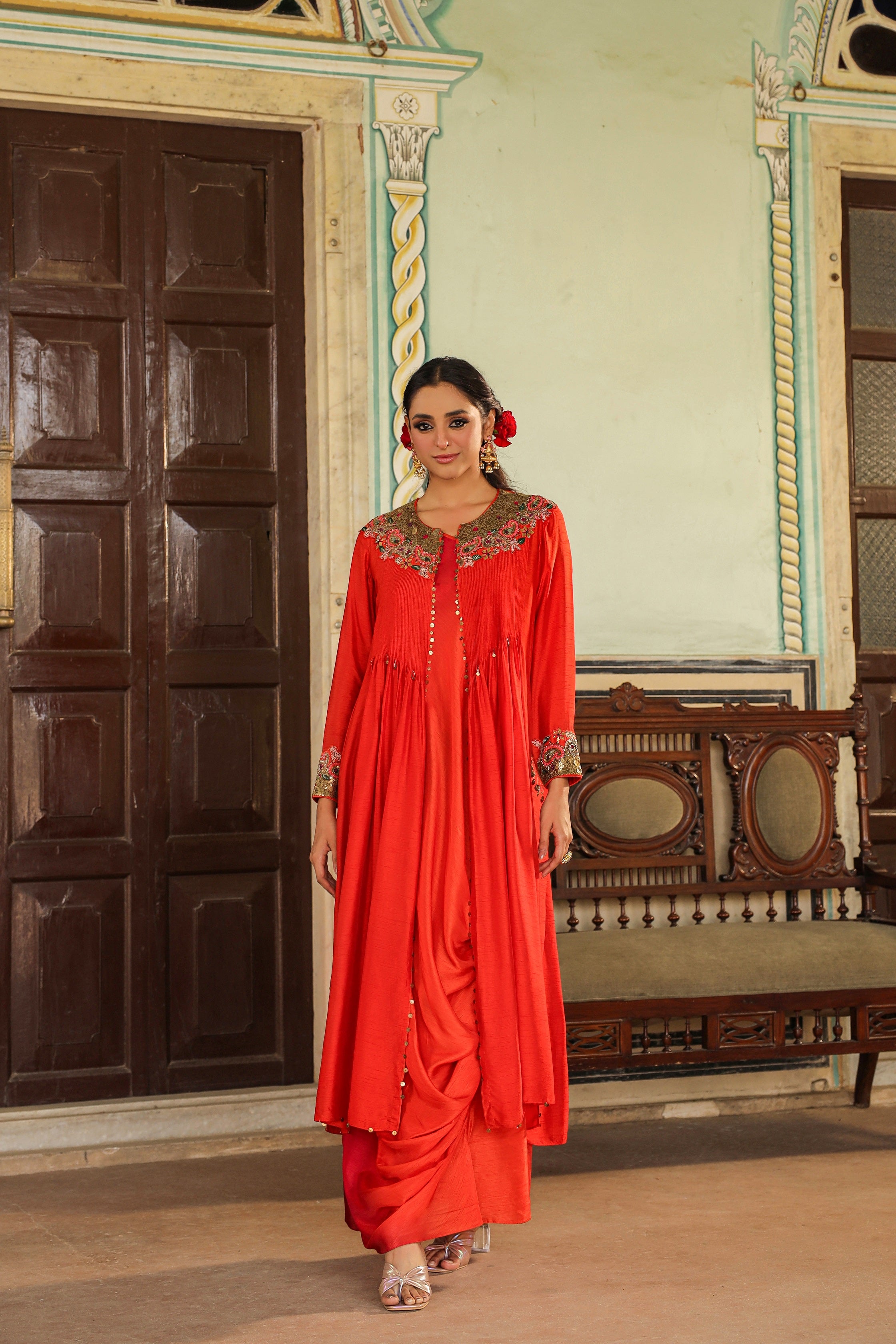 | This 2 pc set comes with a heavily embroidered Jacket worn over a one shoulder ombre cowl dress. The neck of the Jacket is heavily embroidered with paatra tikkis, kasab and resham paisleys with gota flowers. The cuff of the jacket is also embroidered with an interesting paatra tikki detail for that extra drama. |
