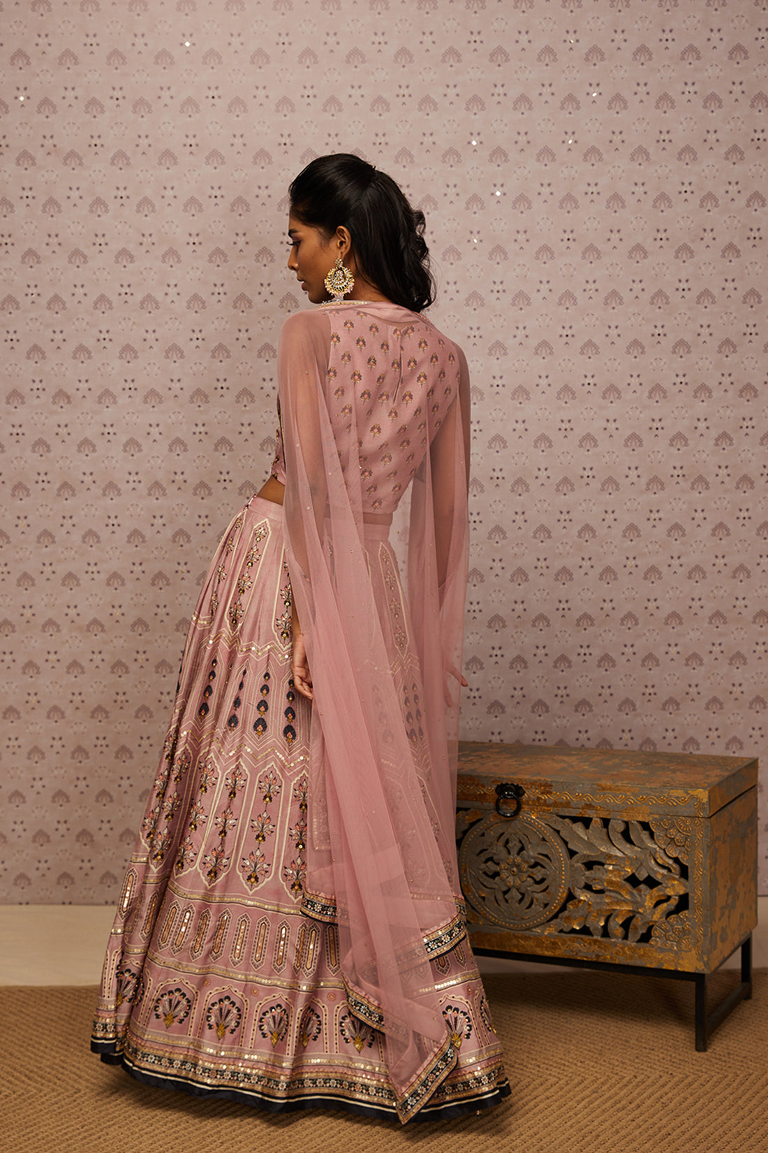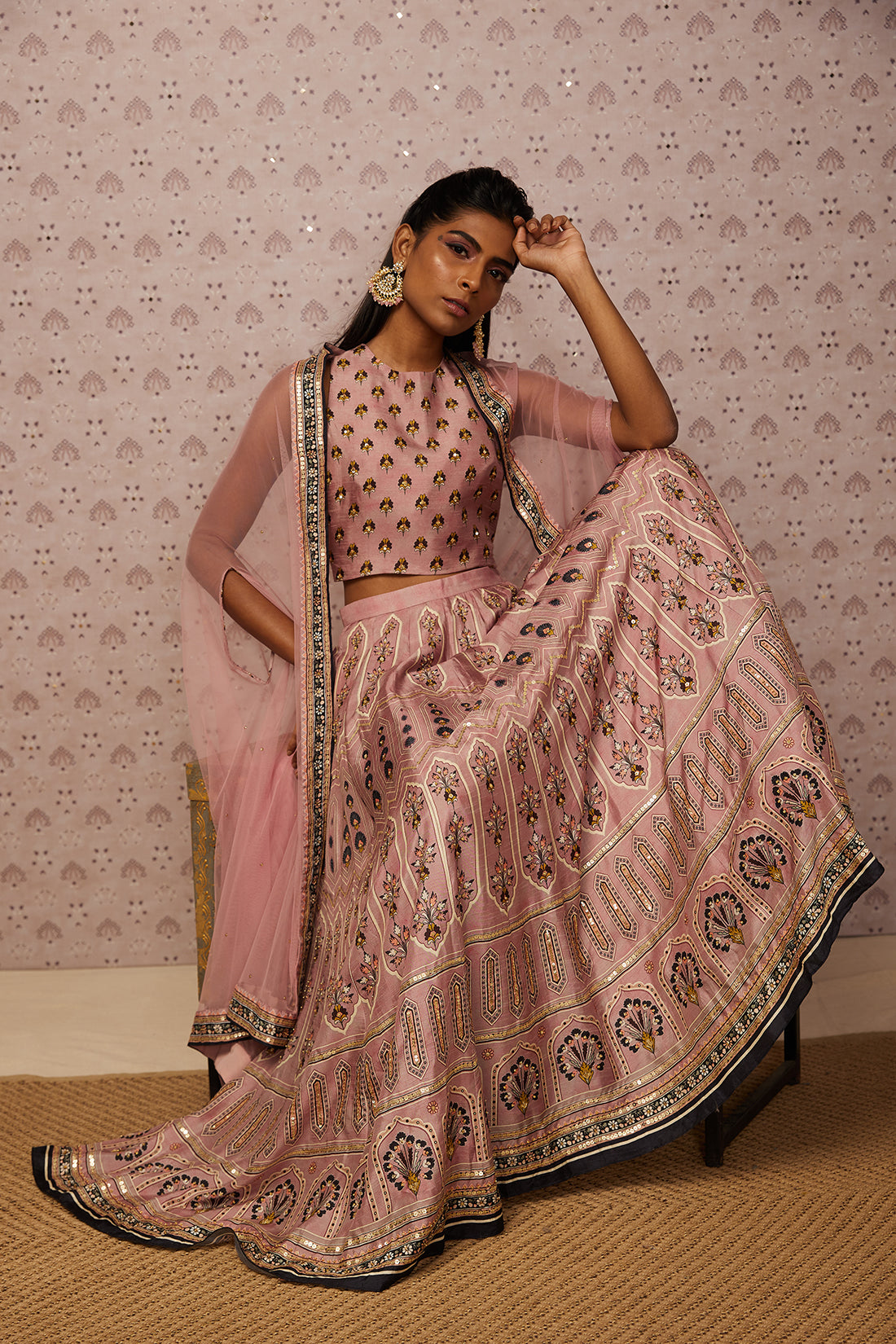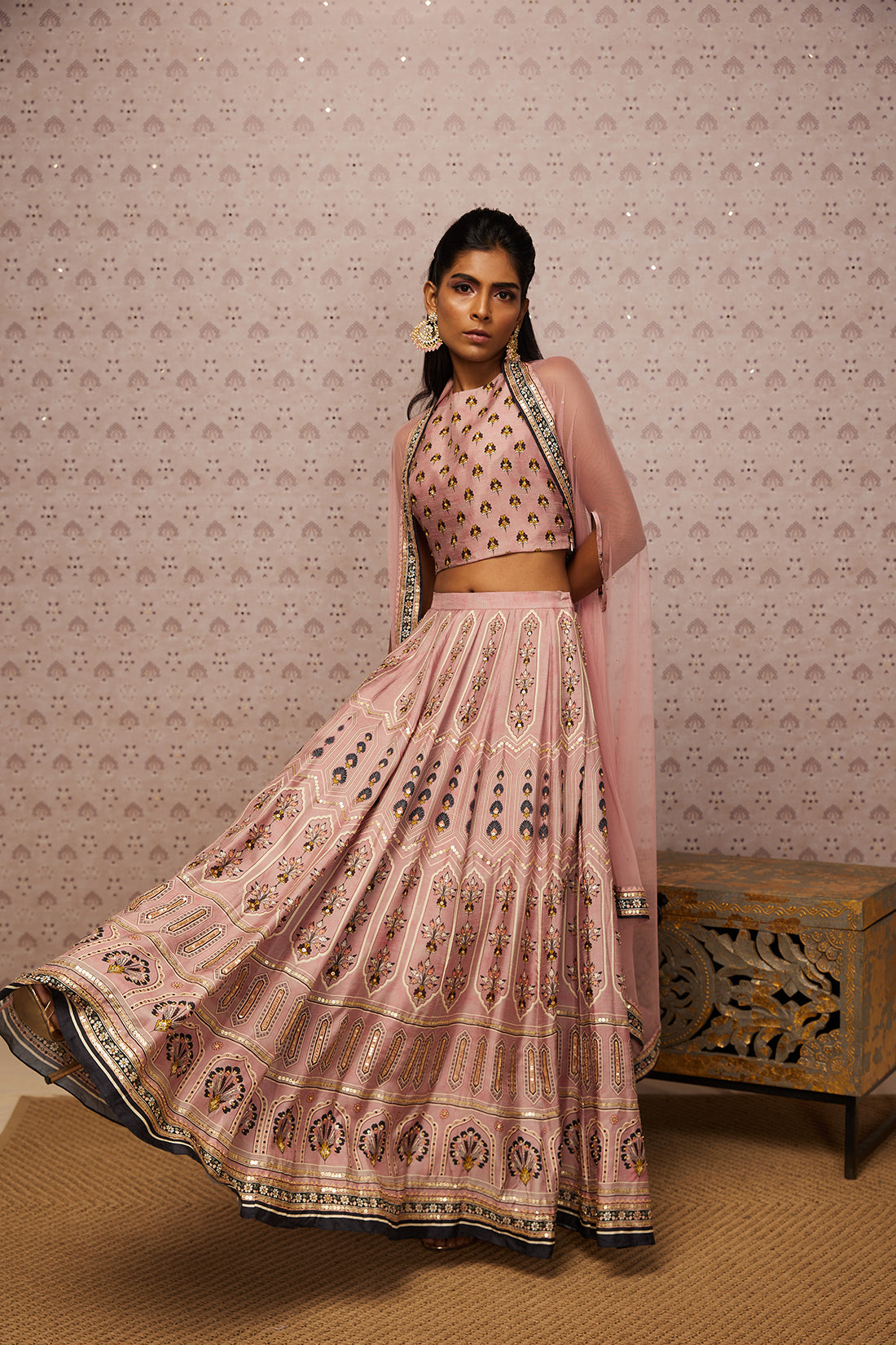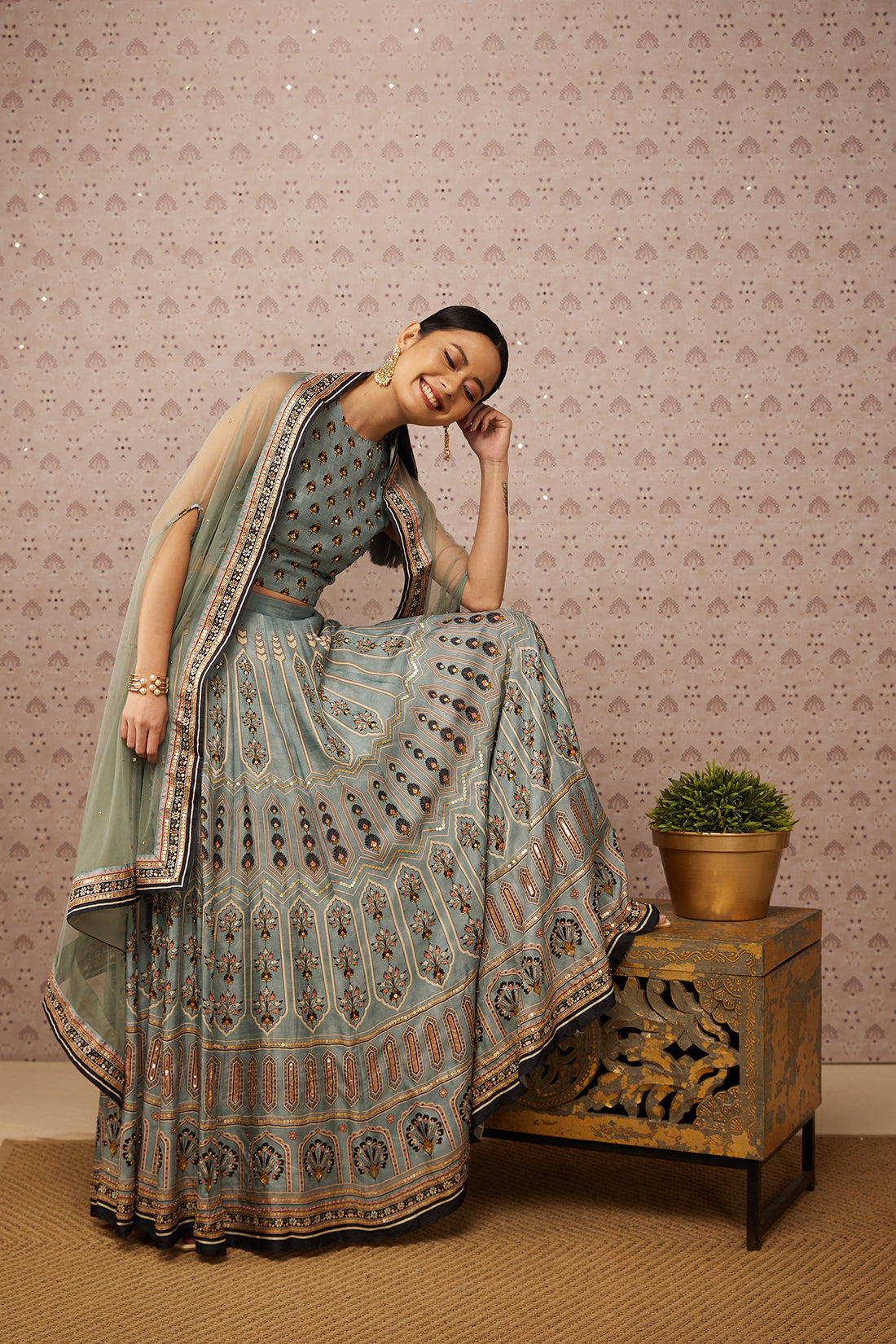 Satin georgette ombre lehenga in sequin and pearl detail.