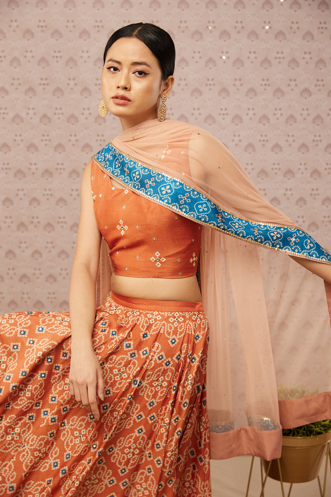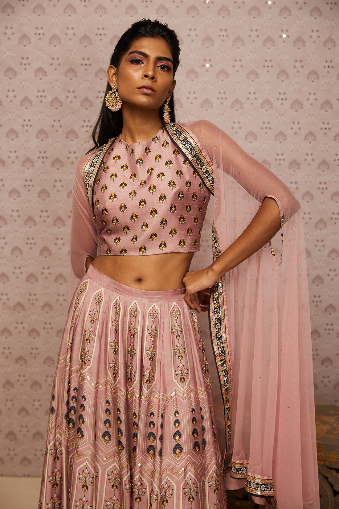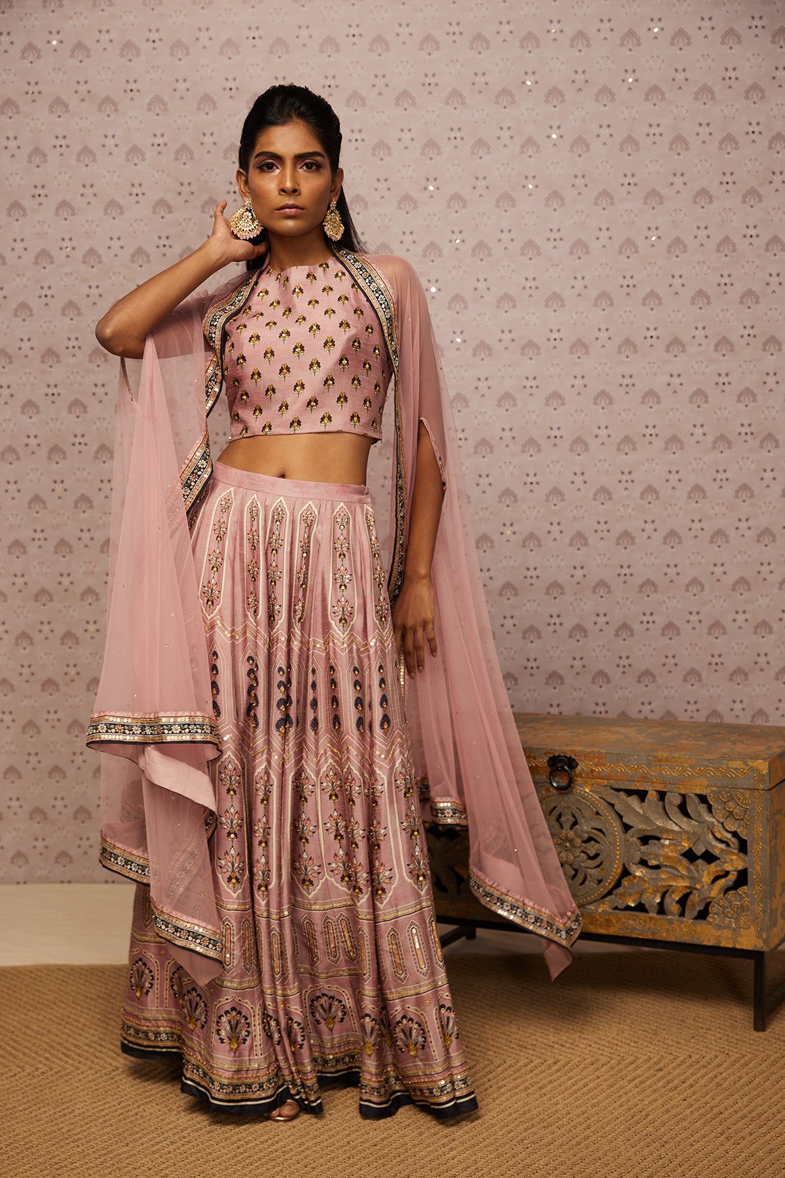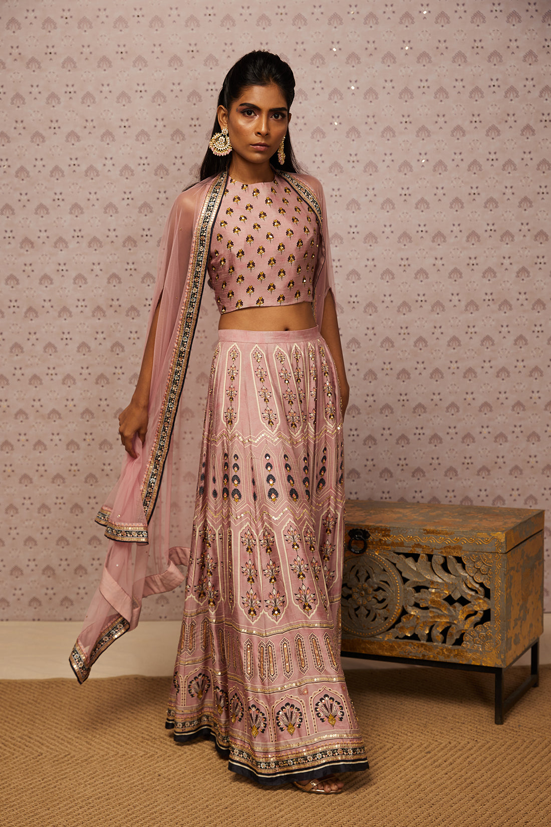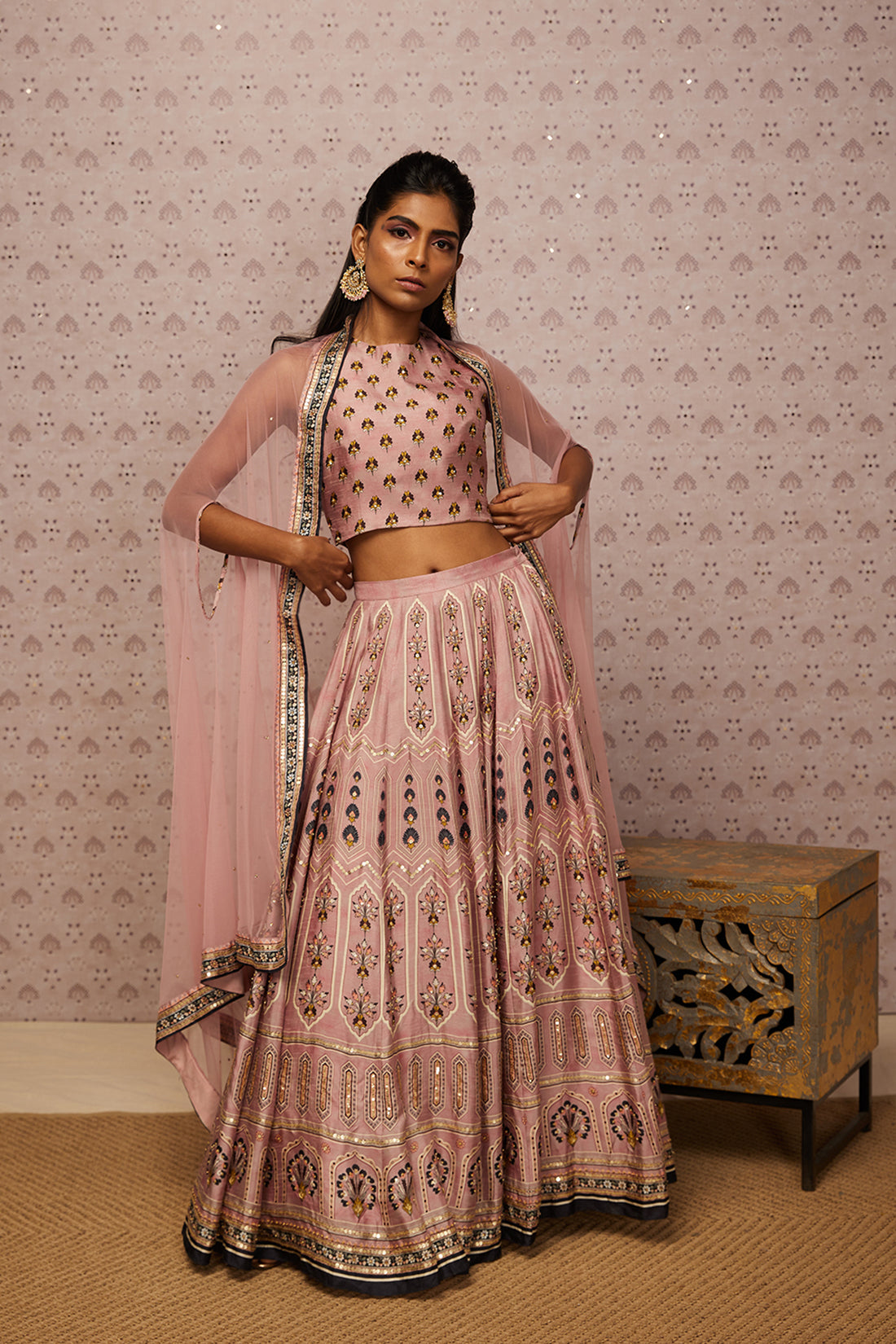 Satin georgette ombre lehenga in sequin and pearl detail.