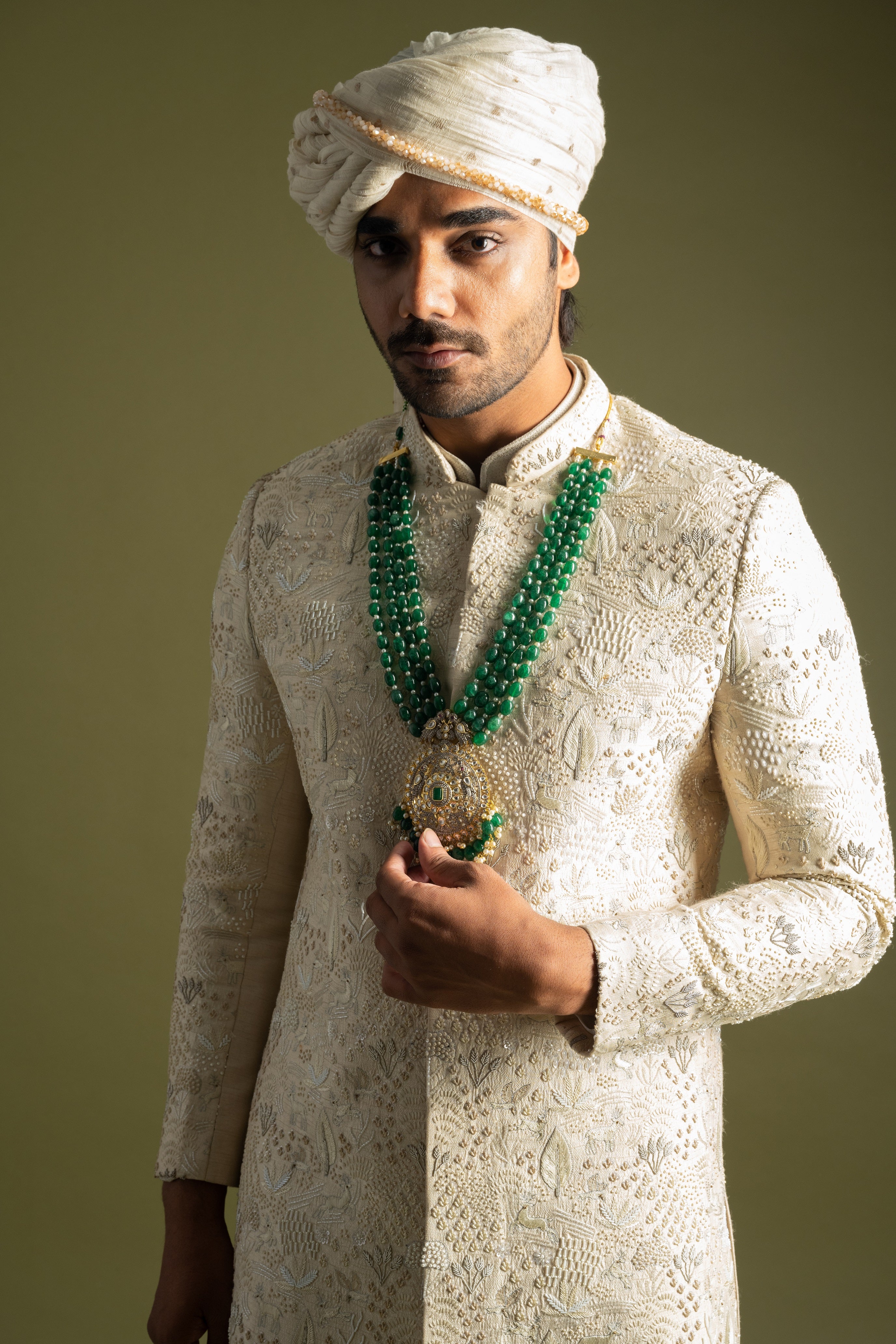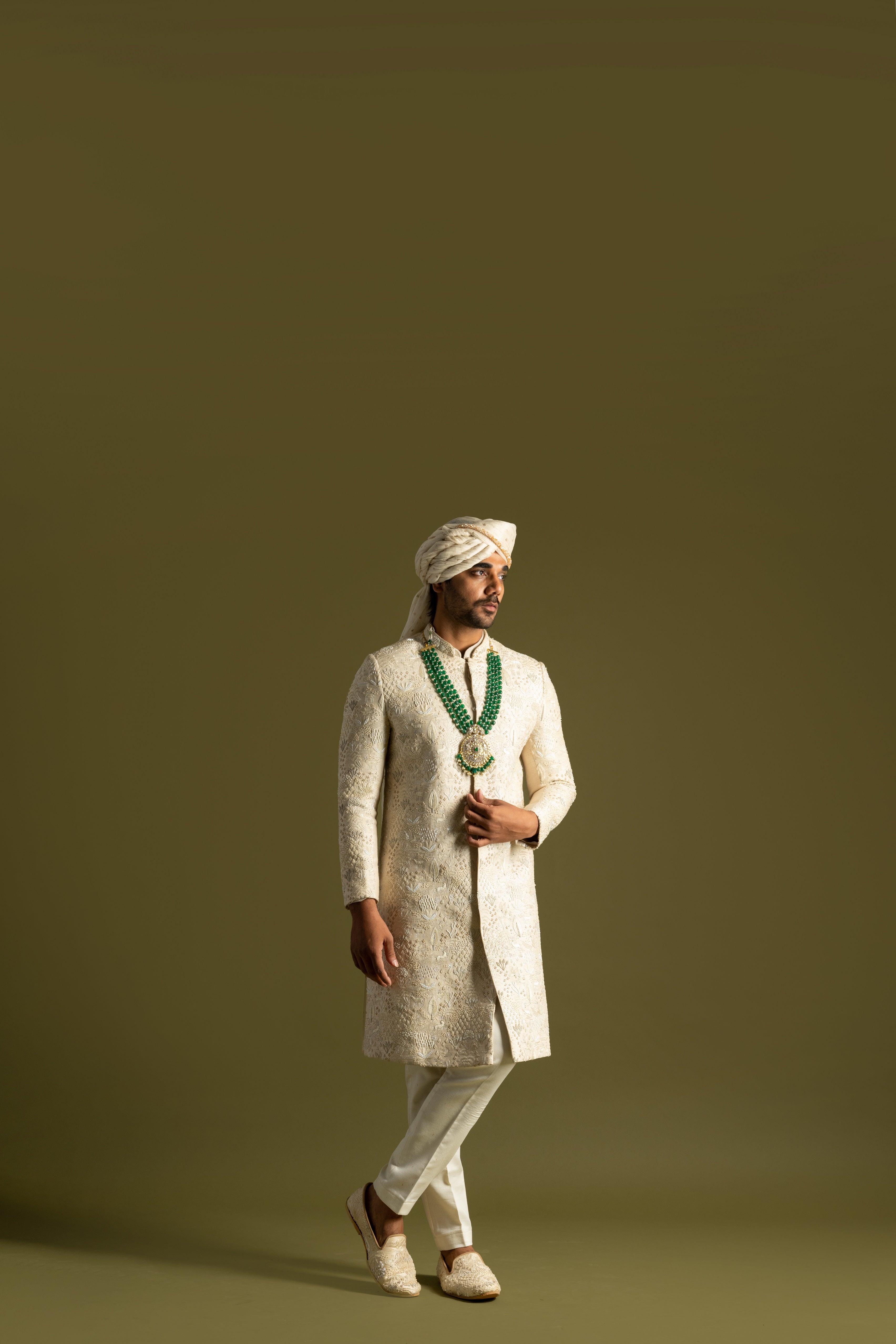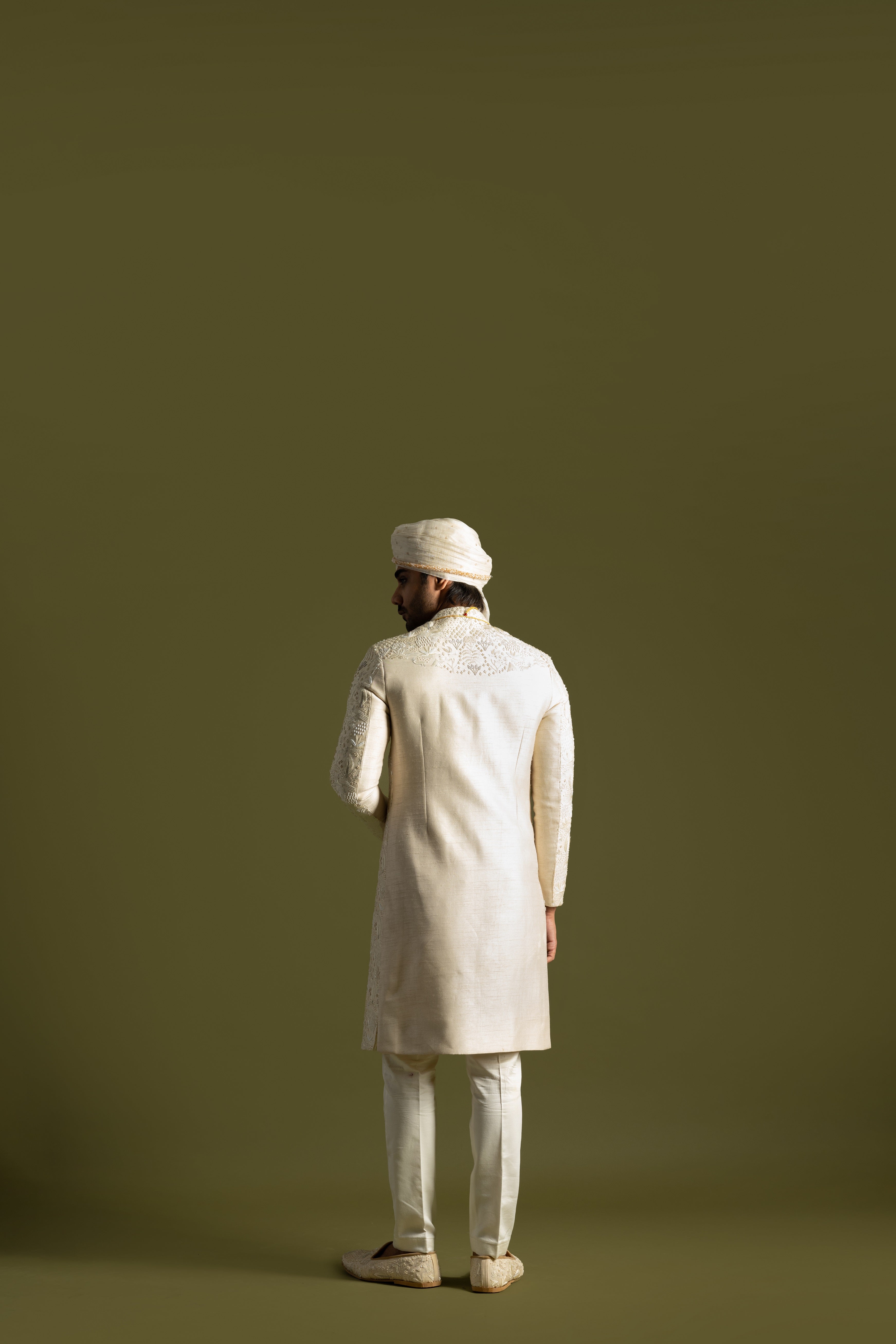 | Cream sherwani set on Bamberg silk base, highlighted with intricate tonal embroidery using multiple techniques of threadwork and embellishments. Paired wit a straight cut kurta and slim fit pants. |