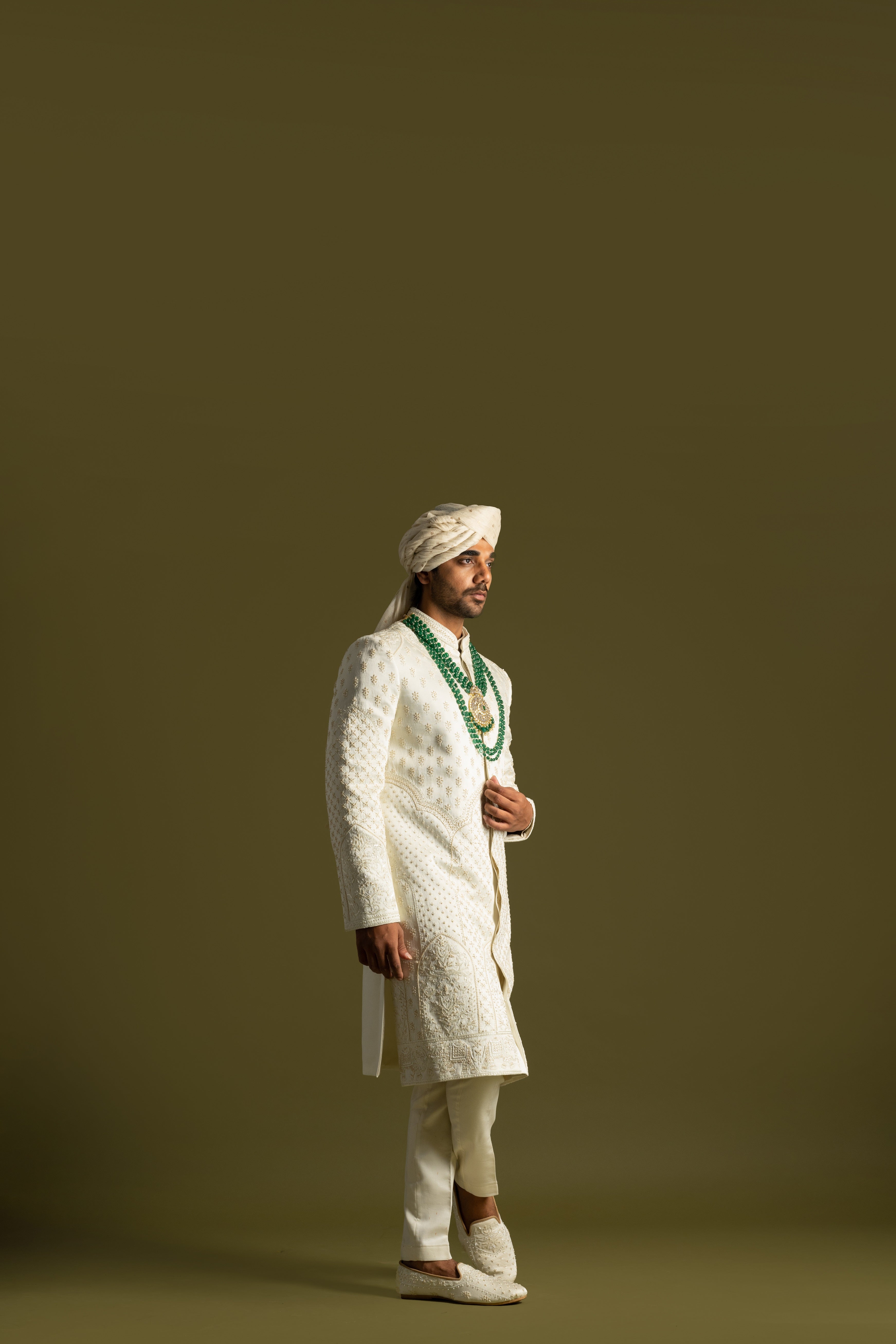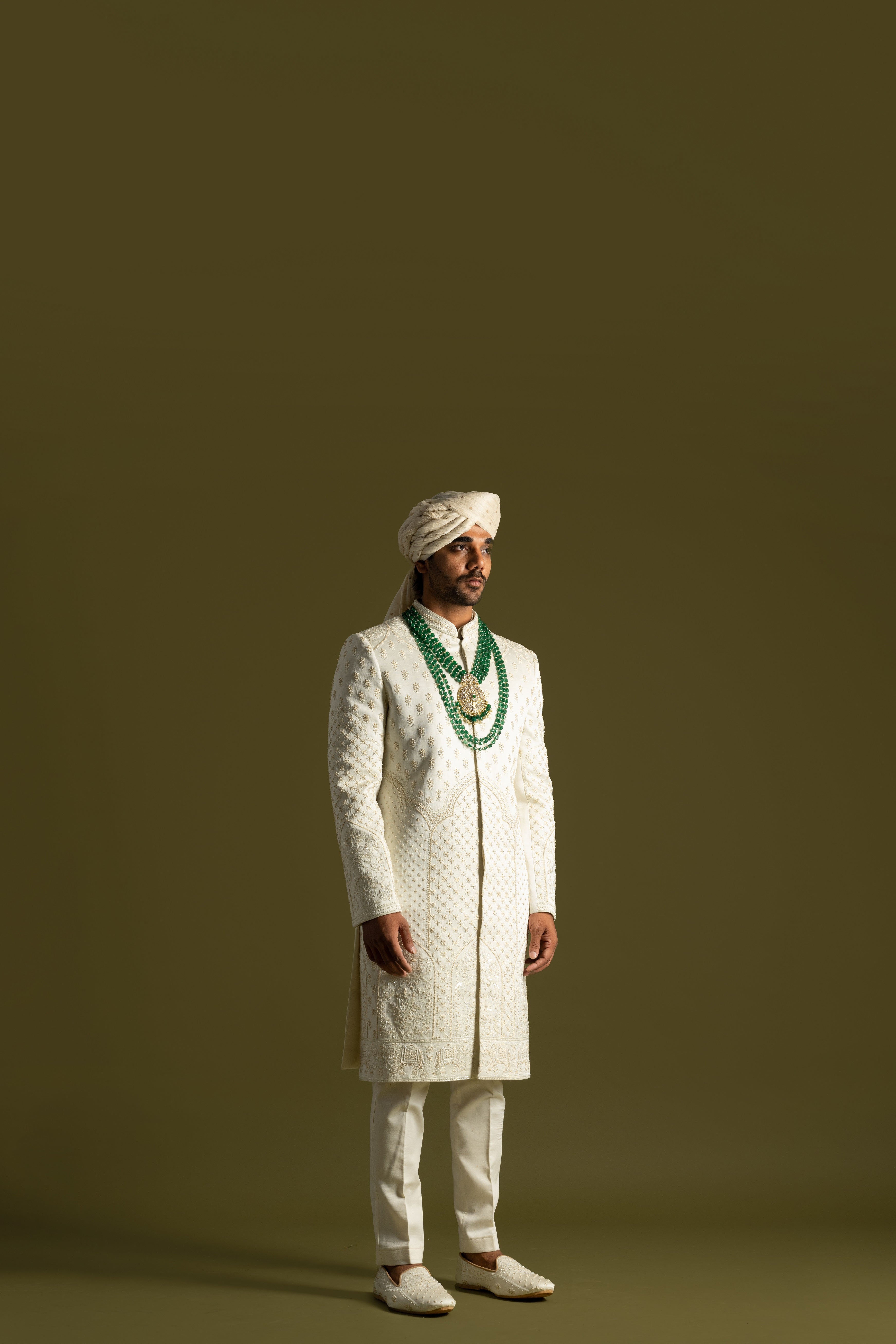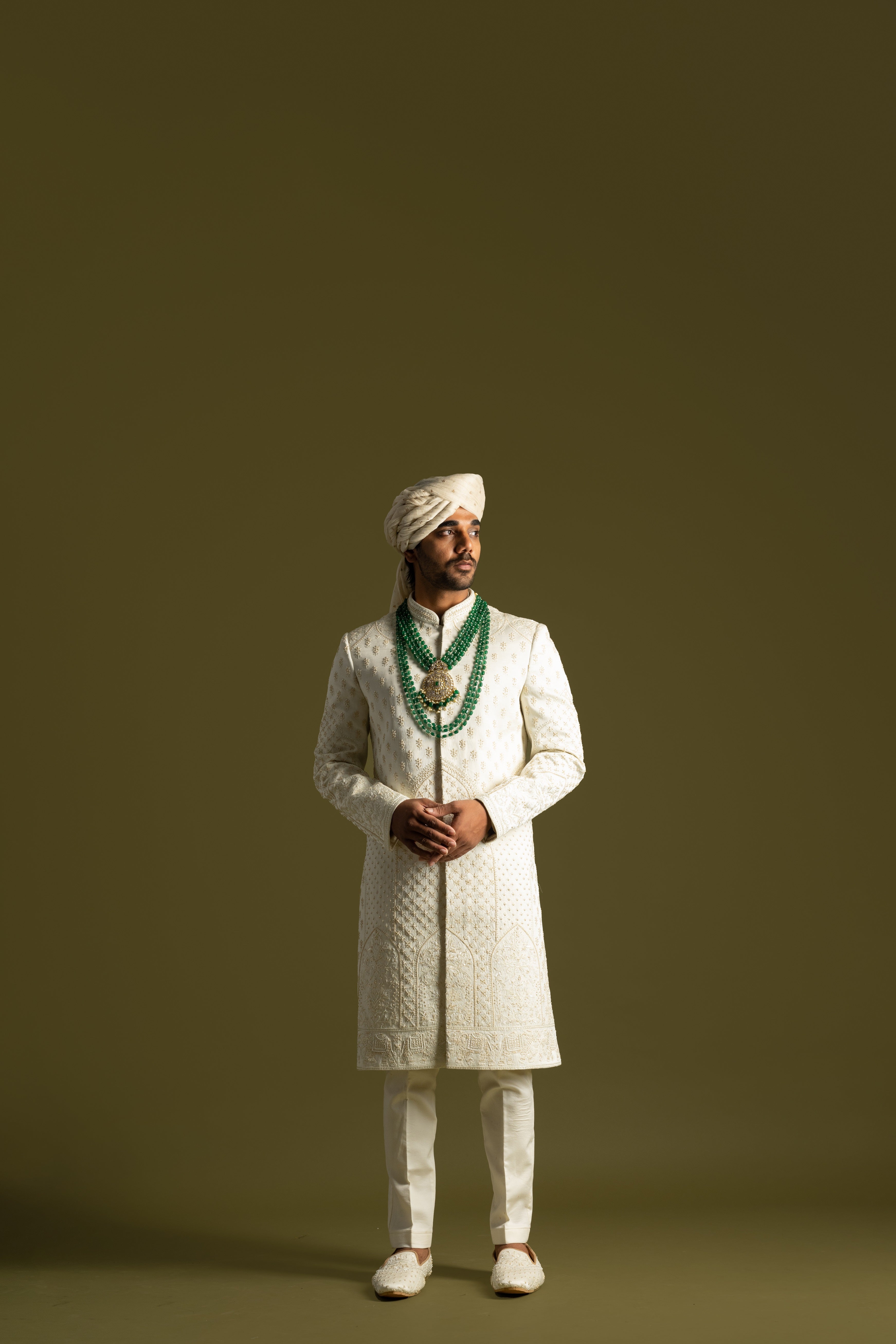 | IVORY SHERWANI SET WITH TONAL THREAWORK AND HIGHLIGHTS OF KATDANA, MAAL WORK AND CHIRWORK. PAIRED WITH A STRAIGHT KURTA AND PANTS. |