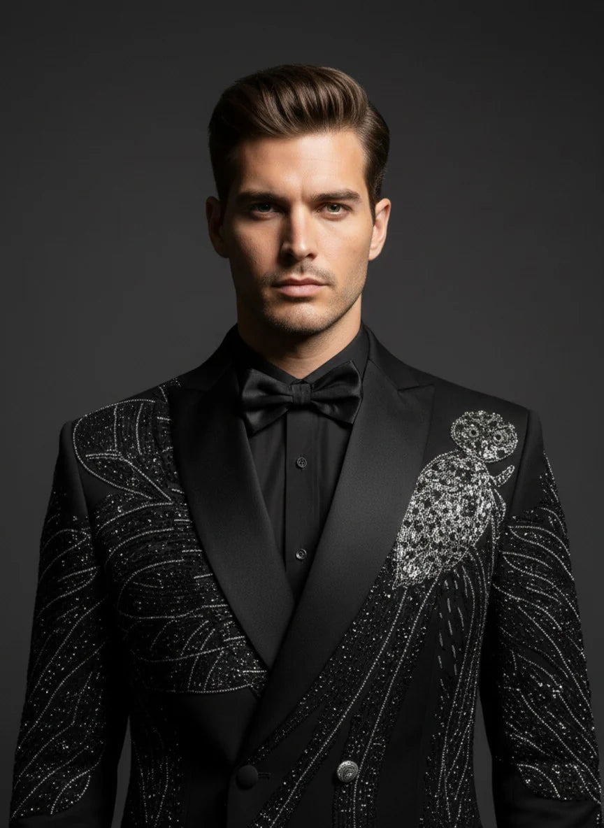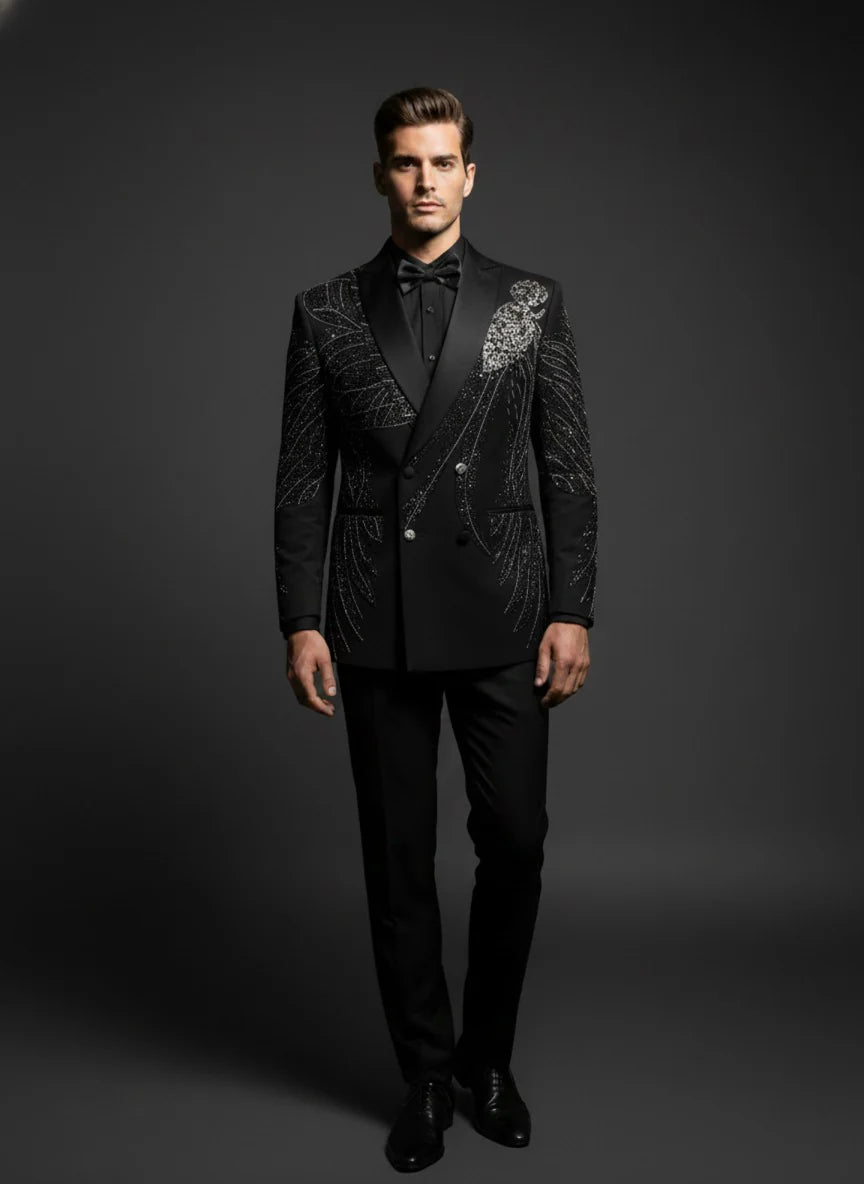 Make a bold statement with this Luxury Black Embellished Tuxedo Suit, designed for men who appreciate refined elegance with a modern edge. Crafted for premium occasions, this tuxedo features intricate crystal-style embellishments arranged in a sweeping, artistic pattern across the blazer, adding a touch of glamour without overpowering its classic silhouette. The tailored blazer comes with satin peak lapels, a structured fit, and double-button detailing that enhances its formal appeal. Paired with sleek black trousers, this ensemble delivers a sharp, confident look perfect for red-carpet events, weddings, receptions, gala dinners, and high-end parties.