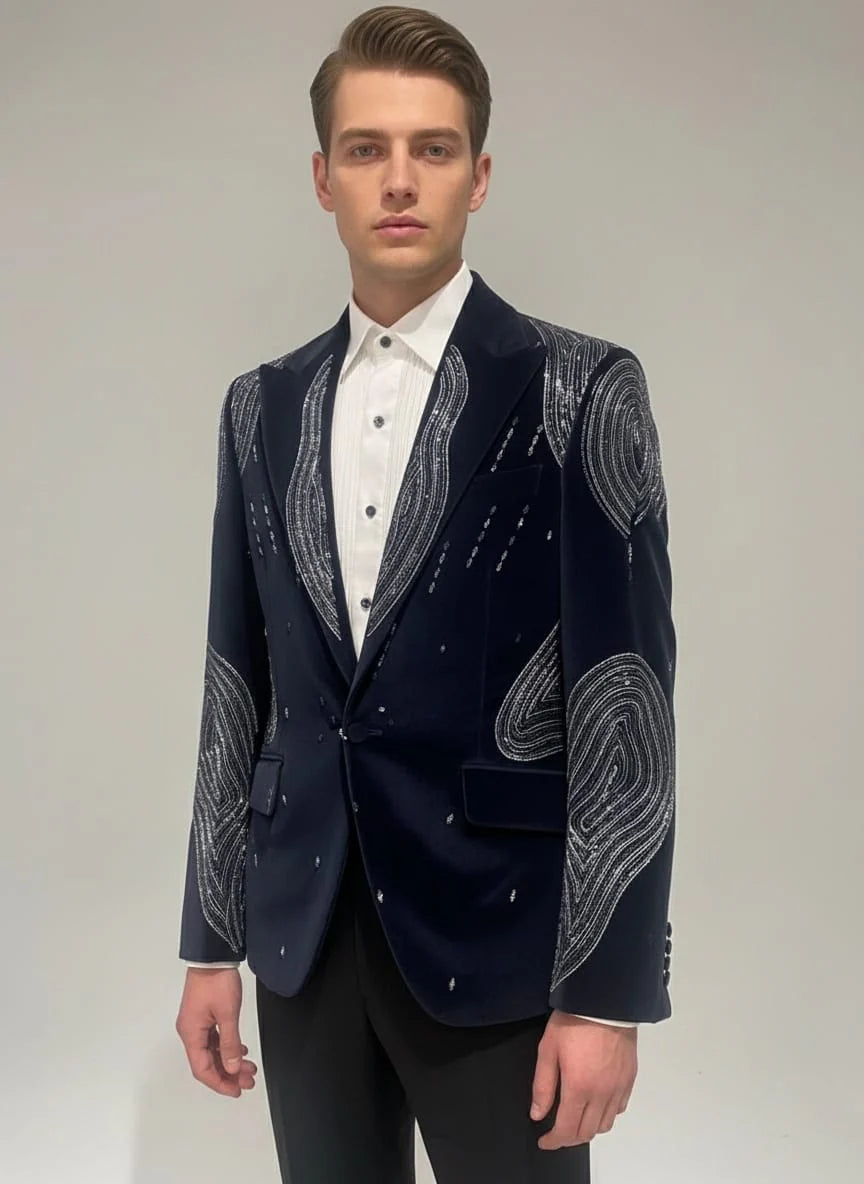 Make a powerful style statement with this Midnight Navy Two-Piece Tuxedo Suit, crafted from luxurious cotton velvet fabric for a smooth texture and refined sheen. Featuring intricate contrast detailing on the blazer and a sharp tailored silhouette, this tuxedo is designed for elite evening occasions. Perfect for receptions, cocktail parties, red-carpet events, and formal celebrations, it blends classic sophistication with modern elegance.