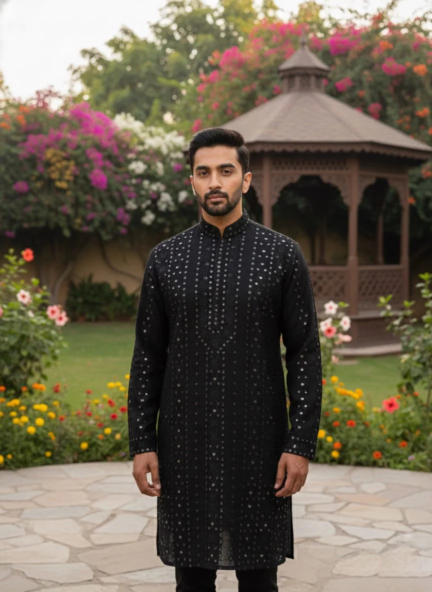 Add timeless elegance to your ethnic wardrobe with this Black Italian Fabric Kurta Pajama Set. Crafted from high-quality Italian fabric, this outfit offers a smooth texture, soft touch, and excellent drape, ensuring both comfort and style. The kurta features a classic straight-cut silhouette with a refined collar, full sleeves, and minimal detailing, making it perfect for festive occasions, weddings, poojas, and formal gatherings. The matching tailored pajama complements the kurta beautifully, providing a relaxed yet sophisticated look.