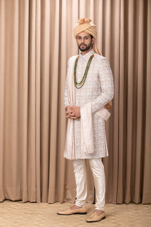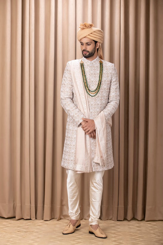 | Featuring a traditional hand embroidered beige and ivory sherwani with intricate detailings. Perfect for a classy wedding. This comes with an ivory cotton silk kurta, beige embroidered stole and ivory churidaar. |