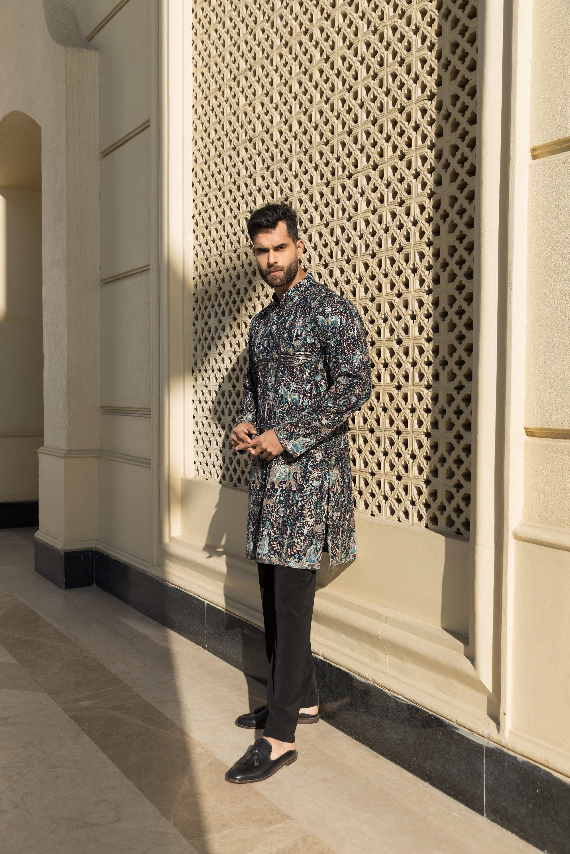 The teal blue kurta with pyjama, meticulously crafted from luxurious georgette fabric, is a sophisticated blend of contemporary style and traditional craftsmanship. The kurta boasts a fluid, graceful drape that enhances the overall silhouette, offering both comfort and elegance. The smooth texture of georgette ensures breathability and ease of movement, making it ideal for long celebrations or cultural events. Paired with a matching pyjama, this ensemble exudes understated charm with a touch of modern flair, making it the perfect choice for anyone looking to make a statement at weddings, festive gatherings, or formal occasions.