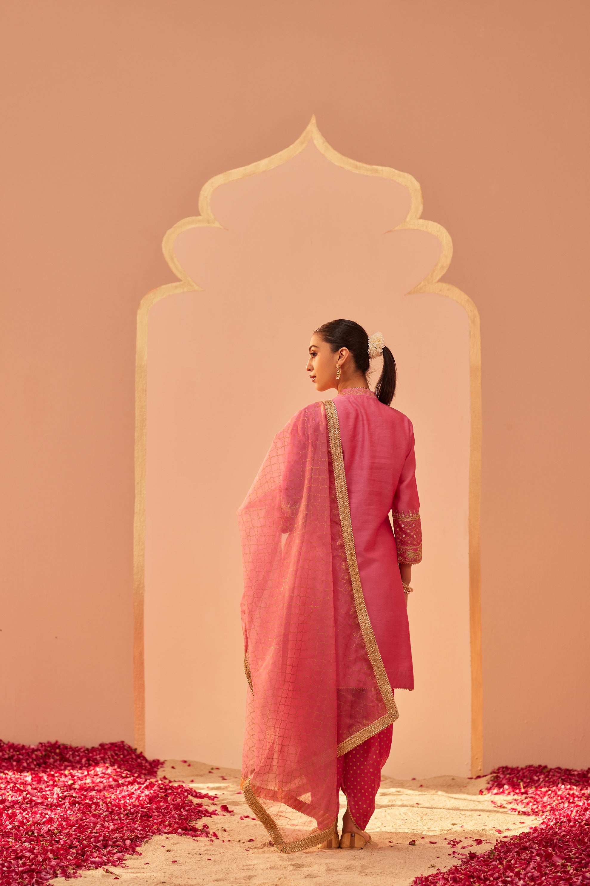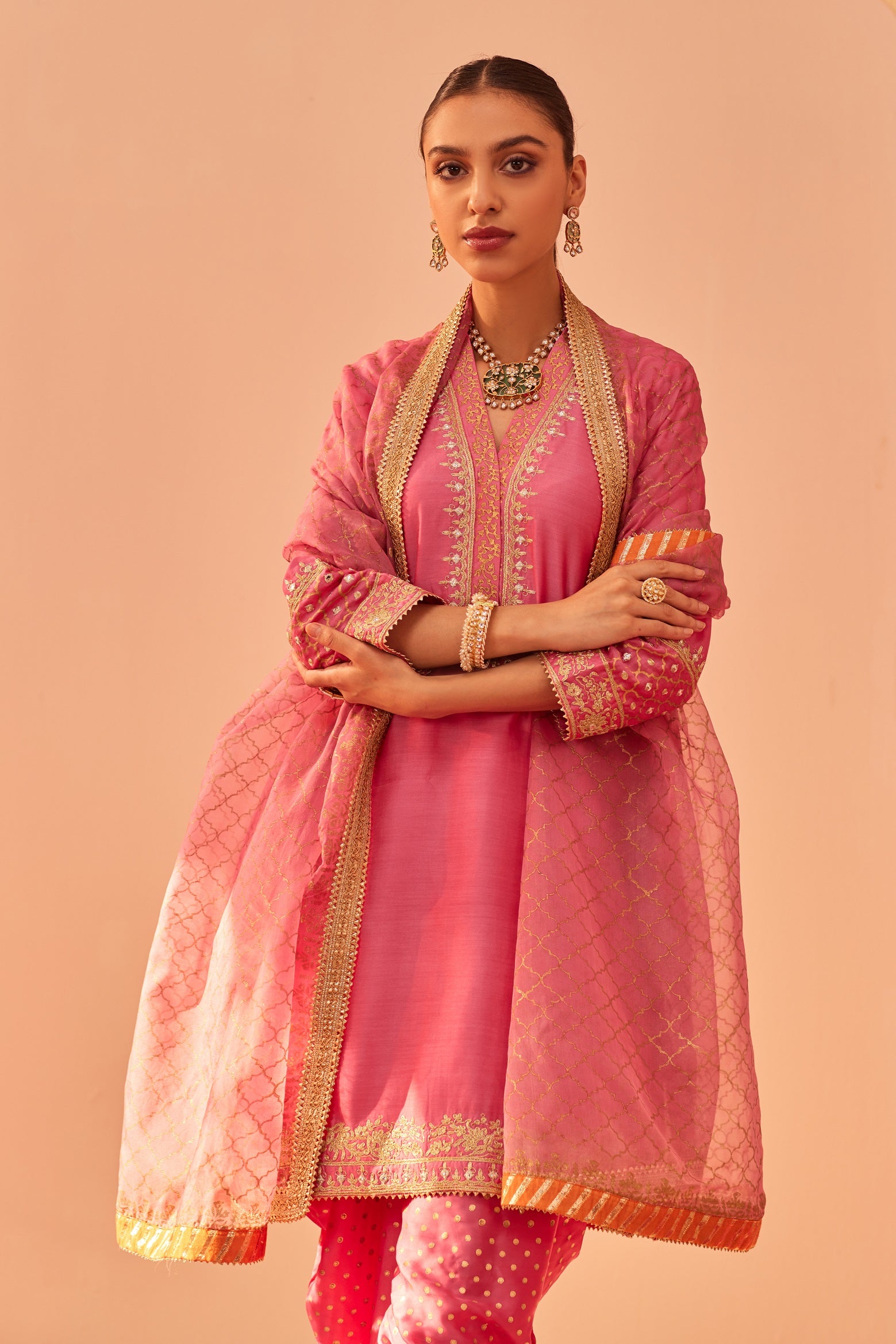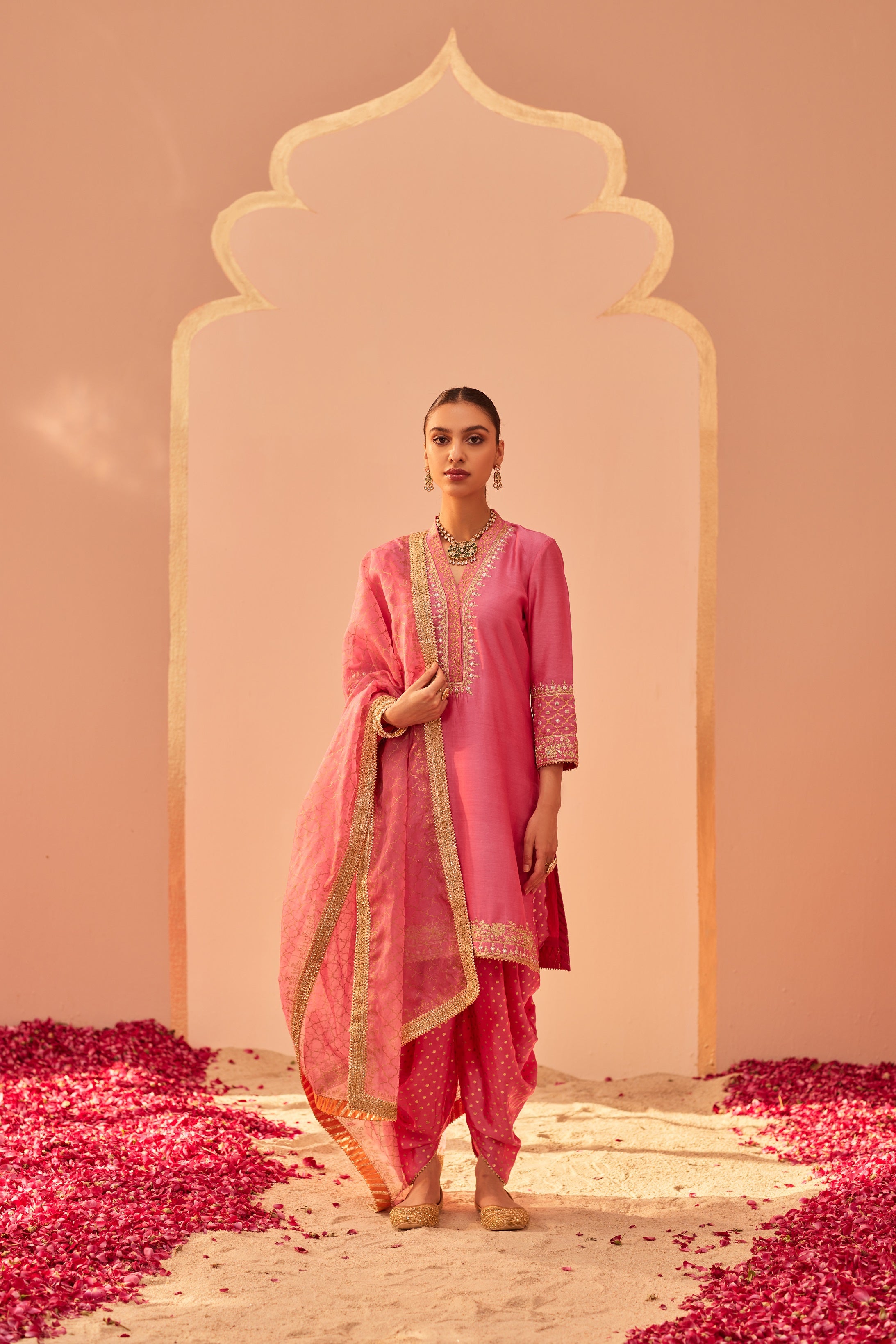 This ensemble is made in pure silk chanderi, a bamberg satin dhoti and is teamed up with a silk organza dupatta. The kurta has a zero neck with a placket and three-quarter sleeves. The outfit is adorned with a signature block print highlighted with tilla and patra embroidery. It is finished with a pure benarsi fabric and gota detailing.