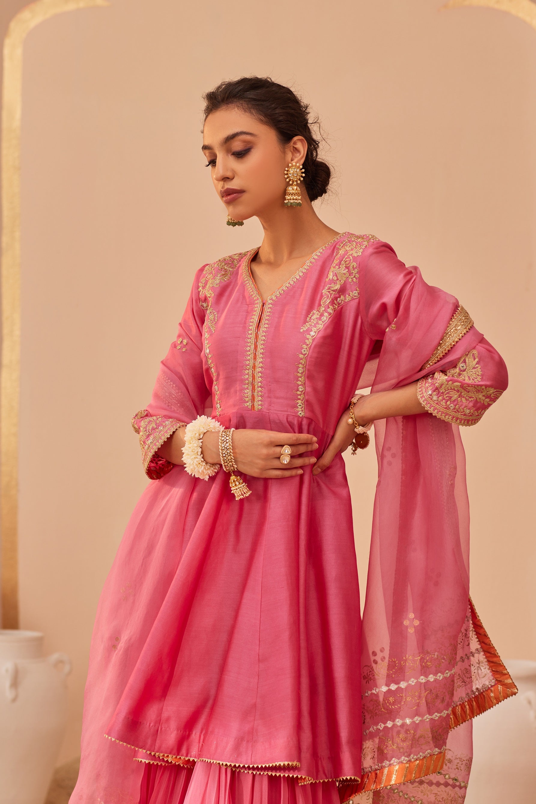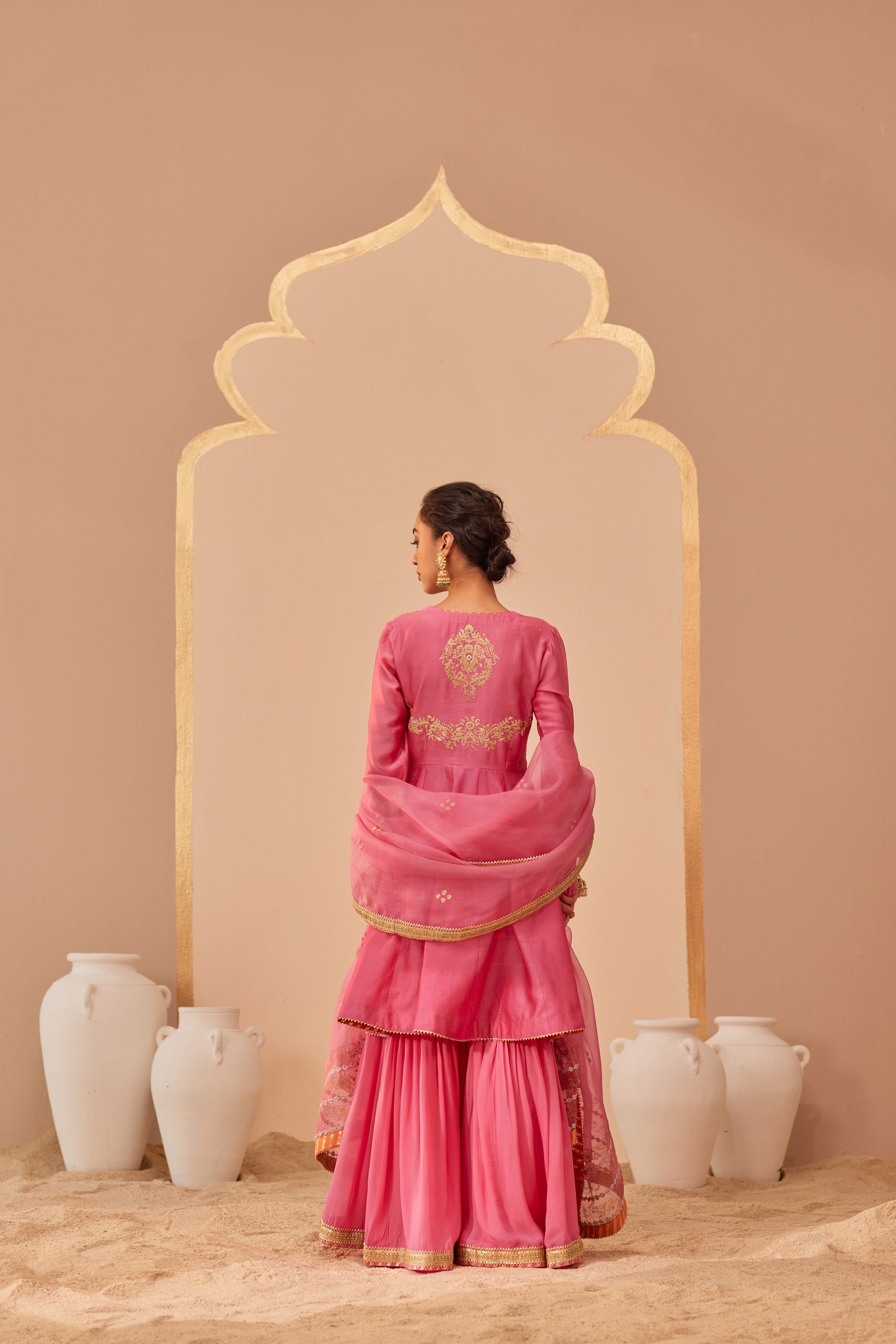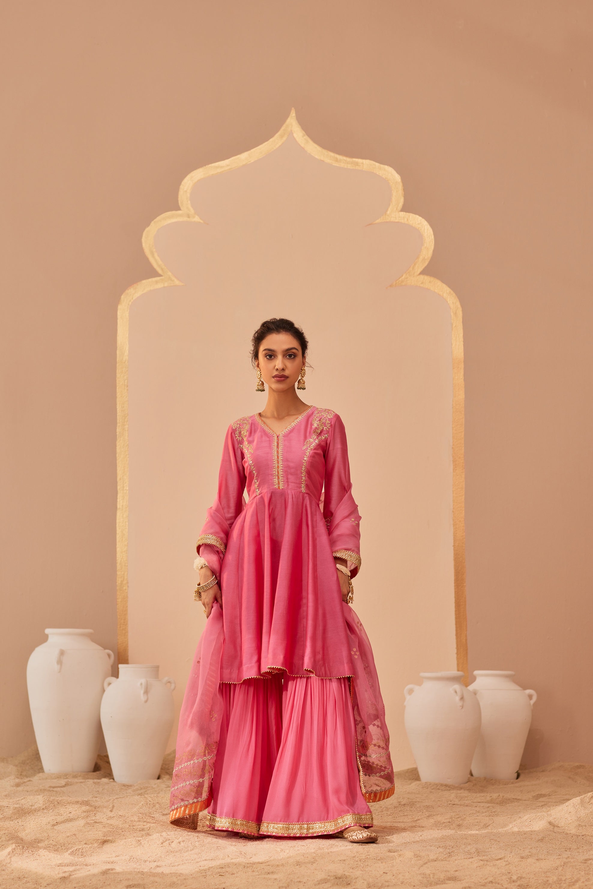 | This ensemble is made in pure silk chanderi and a georgette garara teamed up with a silk organza dupatta. The kurta has a zero neck with a slit and three-quater sleeves. The outfit is adorned with a signature block print which is highlighted with tilla and patra embroidery. It is finished with a pure benarsi fabric and gota detailing. |