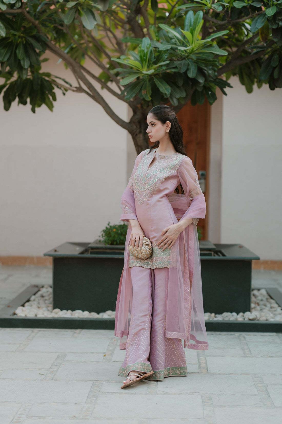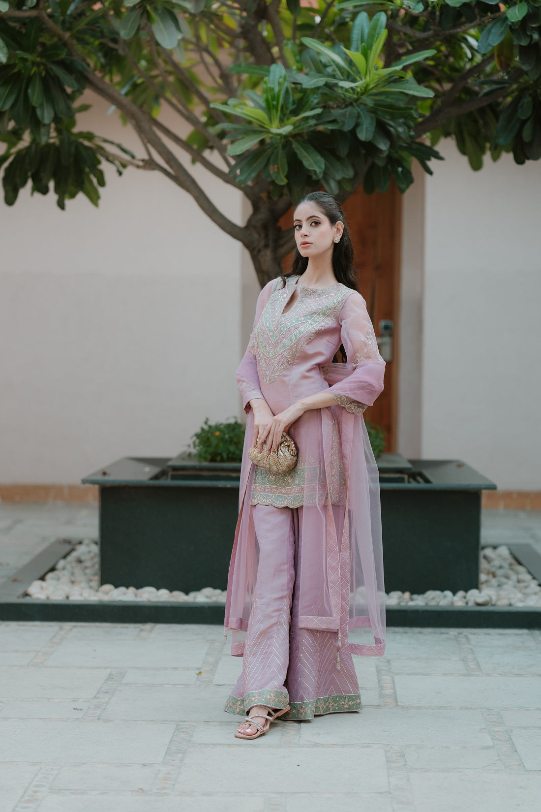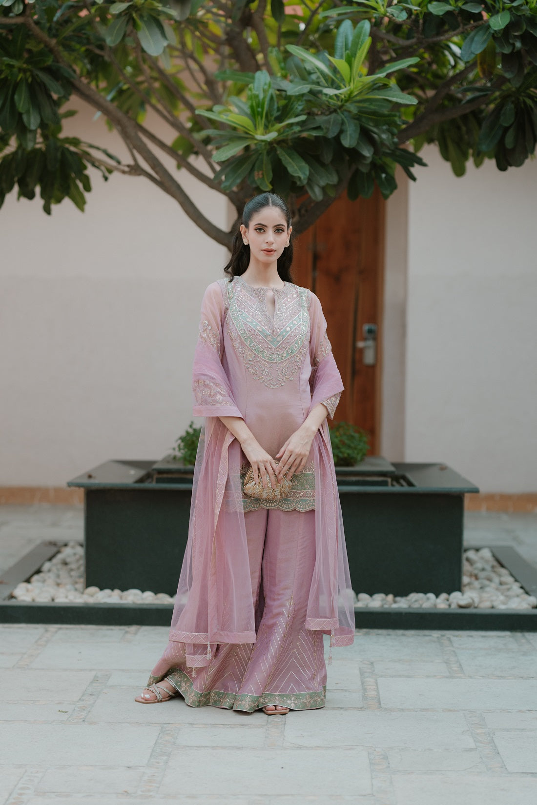 This Outfit Is A Sharara Gharara Set Crafted From Shimmer Organza Fabric In A Pastel Mauve-Pink Tone. Detailed Description Fabric: Shimmer Organza, Offering A Subtle Sheen And Fluid Drape. The Translucent Texture Gives The Ensemble A Delicate, Ethereal Look. Kurta: Straight-Cut, Lightly Flared Kurta With Intricate Thread And Zari Embroidery In Silver And Pastel Tones Across The Neckline And Hem. The Three-Quarter Sleeves Are Embellished With Zari-Lace Borders That Complement The Neckline. Sharara Pants: Matching Mauve-Pink Sharara With Chevron-Pattern Embroidery And Zari Lace On The Hem, Creating A Flowy Silhouette That Moves
