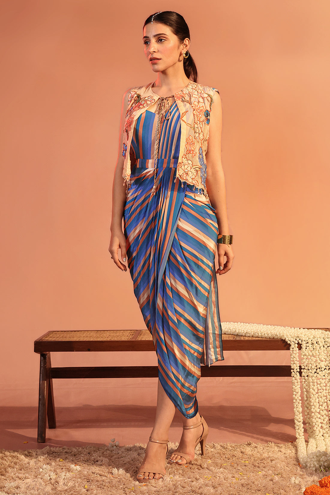 Blue Sadira appliquéd jacket in organza, paired with a saree-style draped dress in crepe.