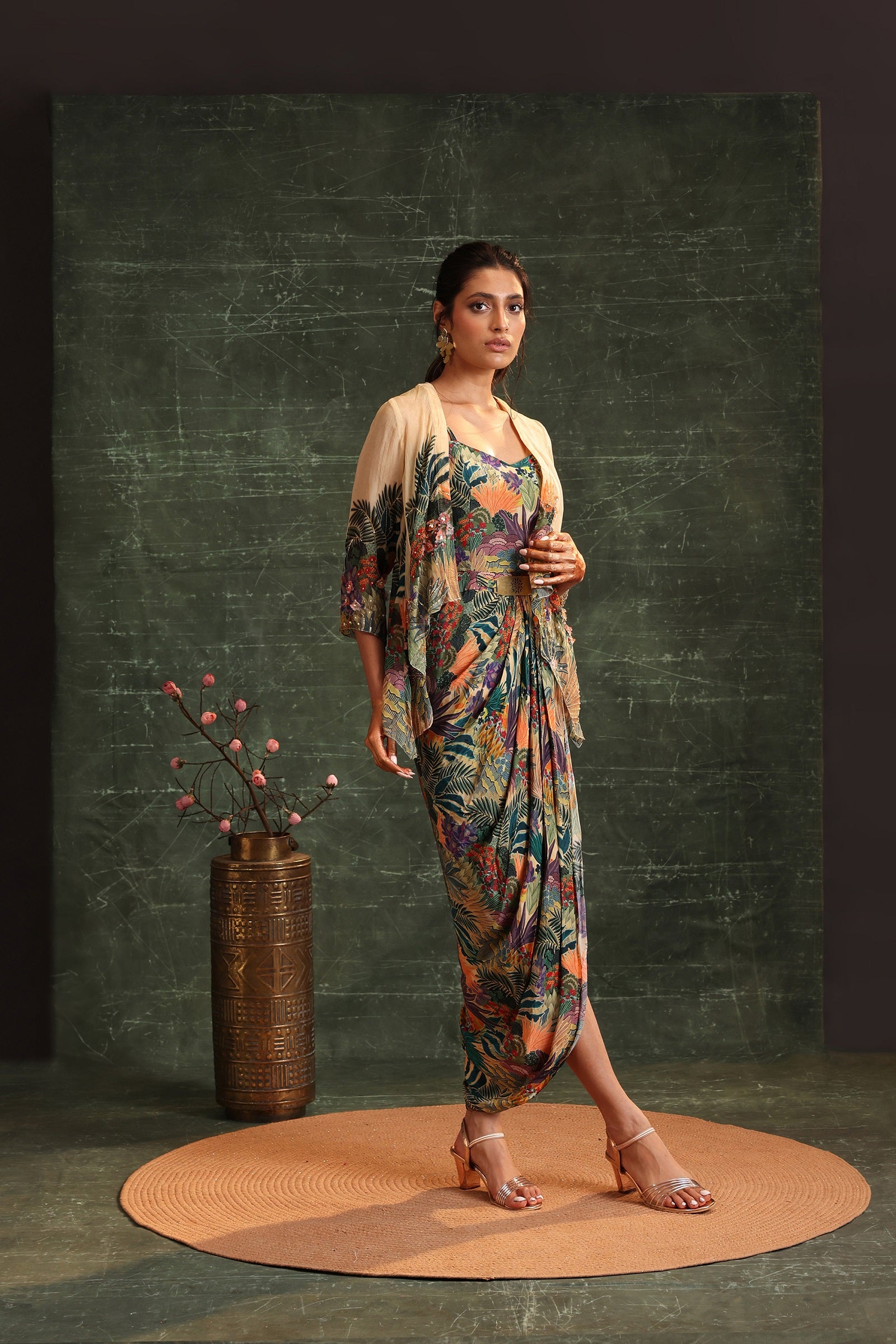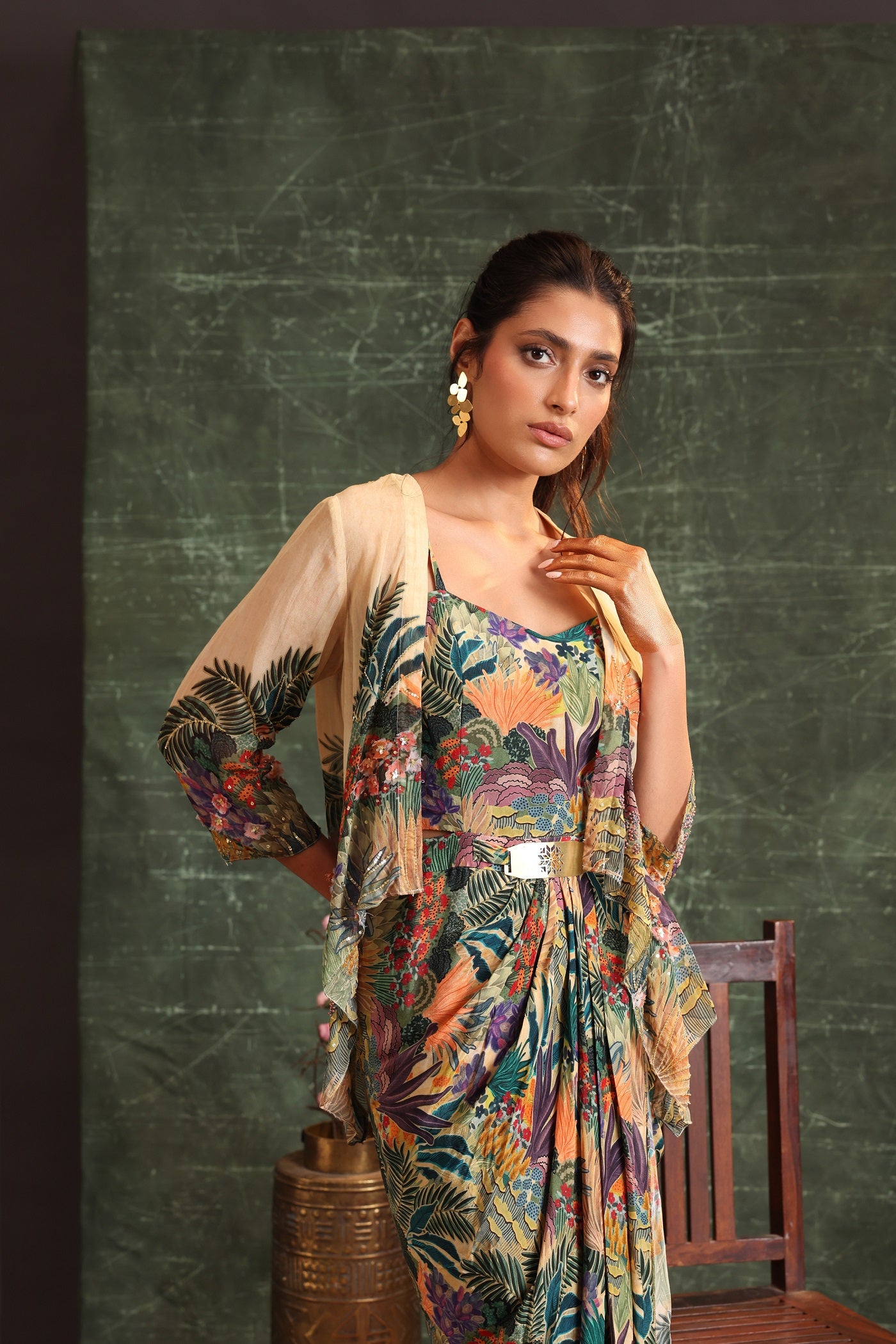 "Beige Kaira Printed Sleeveless Dress in Crepe paired with a Short Embellished Organza Jacket.
