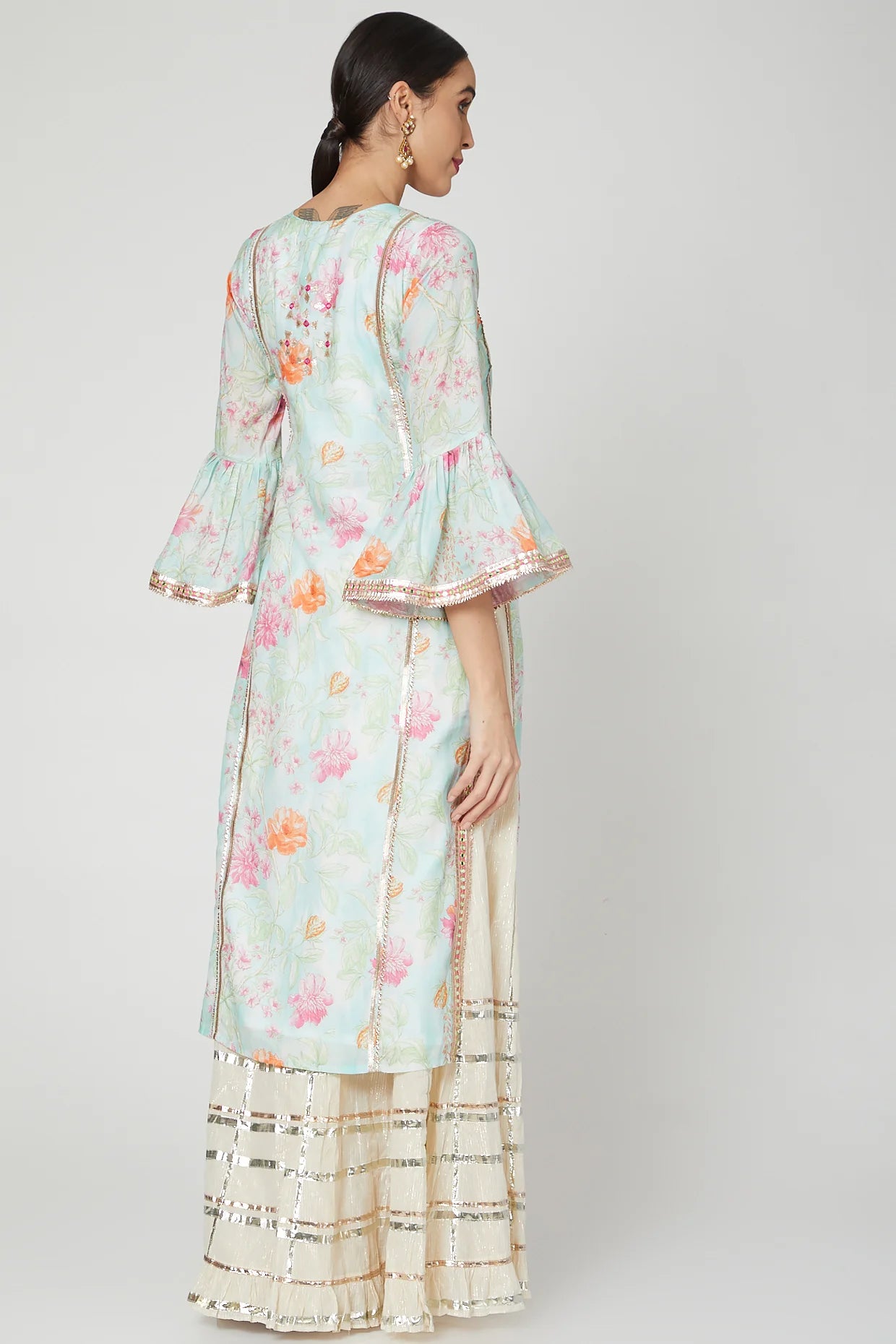 This soft floral, long tunic is embellished using gota, mirror, silk and bright threadwork, highlighting the neckline. The bell sleeves and the flowing sharara gives a softness and flow to the ensemble.