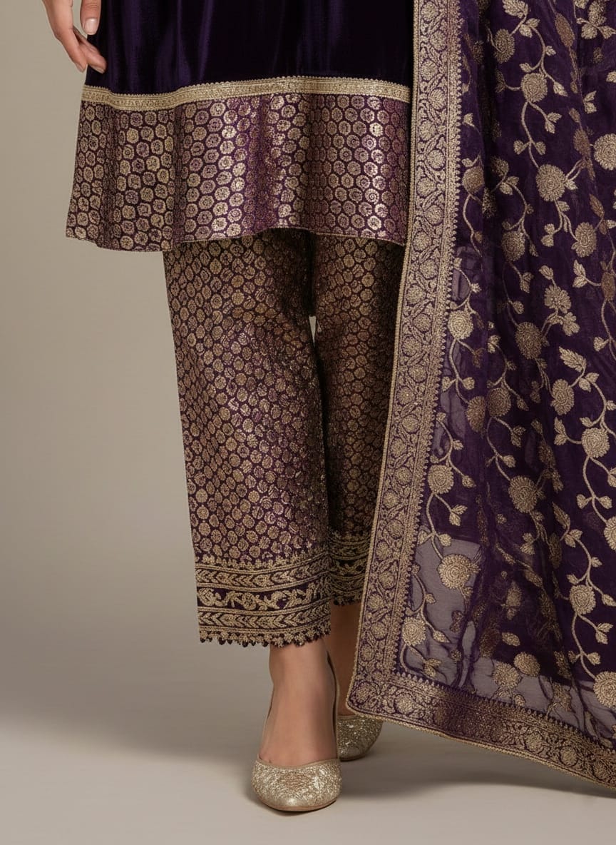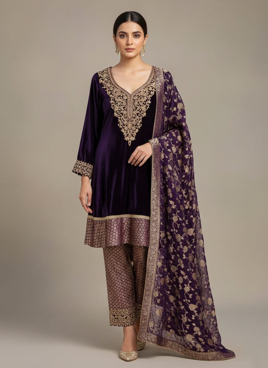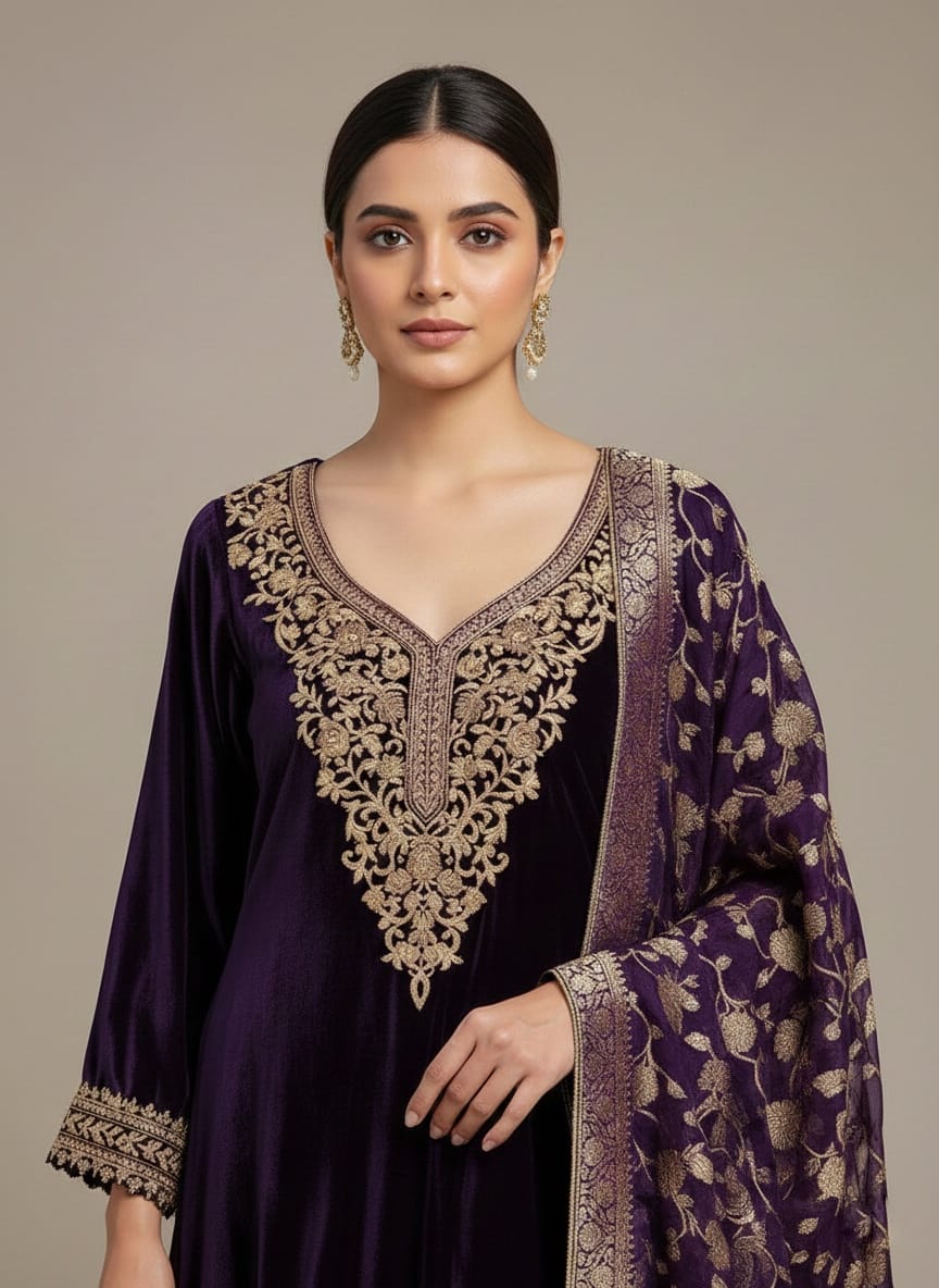 Add regal elegance to your ethnic wardrobe with this luxurious velvet embroidered kurta set in a rich royal purple shade. The kurta is crafted from premium velvet fabric and highlighted with intricate gold zari embroidery on the neckline, sleeves, and hem, giving it a refined festive appeal. Paired with printed jacquard straight pants and a beautifully coordinated purple dupatta featuring all-over floral embroidery, this ensemble blends traditional craftsmanship with timeless sophistication. Ideal for festive occasions, wedding functions, evening celebrations, and party wear.