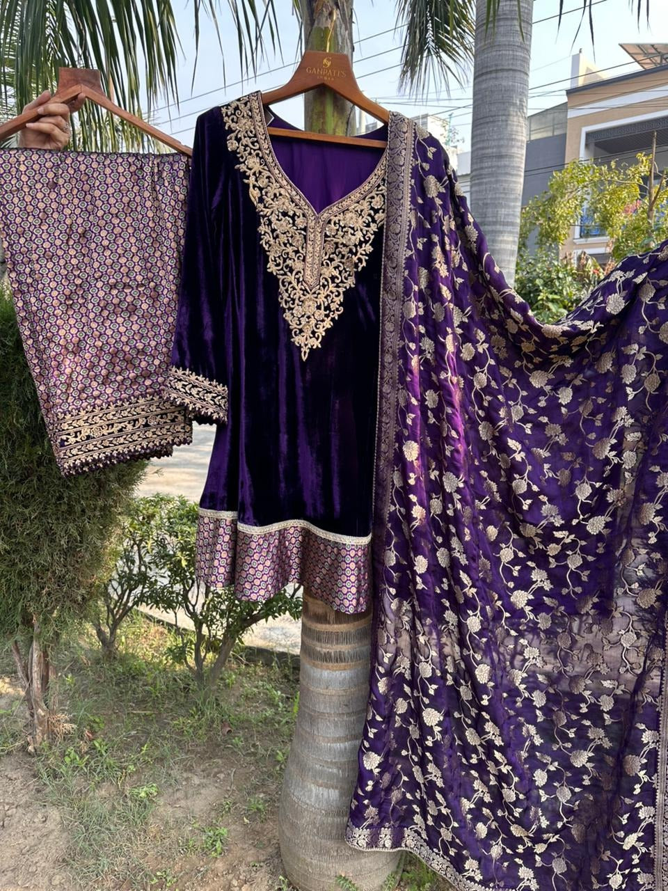 Royal purple velvet embroidered kurta set