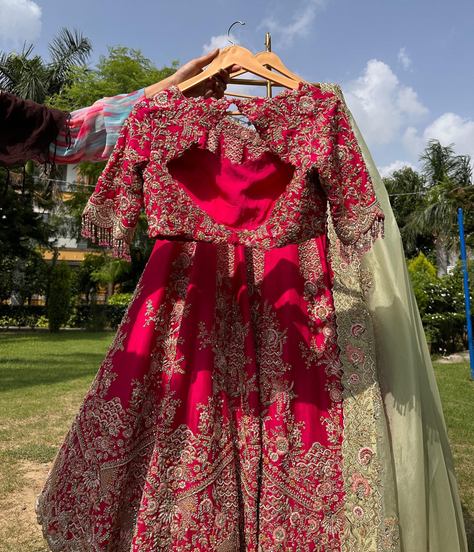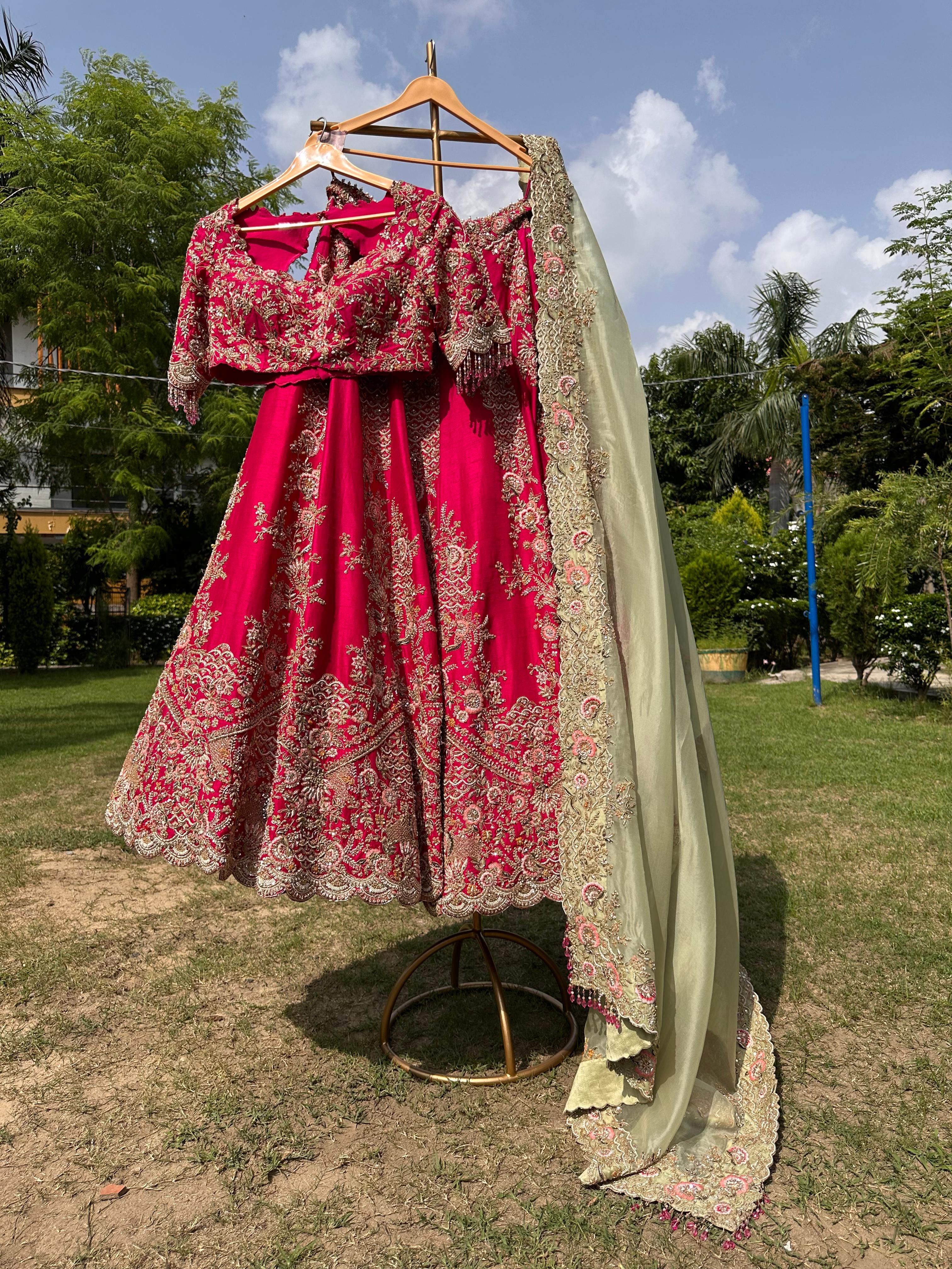 Make A Bold And Regal Statement On Your Special Day With This Stunning Bridal Lehenga Crafted In Pure Raw Silk. The Rich Cherry Color Exudes Elegance And Passion, Making It A Perfect Choice For Modern Brides Who Want To Stand Out While Embracing Timeless Tradition. The Lehenga Features Intricate Hand Embroidery With Zari, Sequins, And Resham Detailing, Adding Depth And Opulence To The Luxurious Silk Base. Paired With A Contrast Dupatta, Delicately Adorned With Borders And Motifs That Complement The Lehenga, This Ensemble Brings Together Classic Craftsmanship And Contemporary Charm. Whether It's For The Wedding Day Or A High-Profile Bridal Event, This Lehenga Promises To Leave A Lasting Impression.