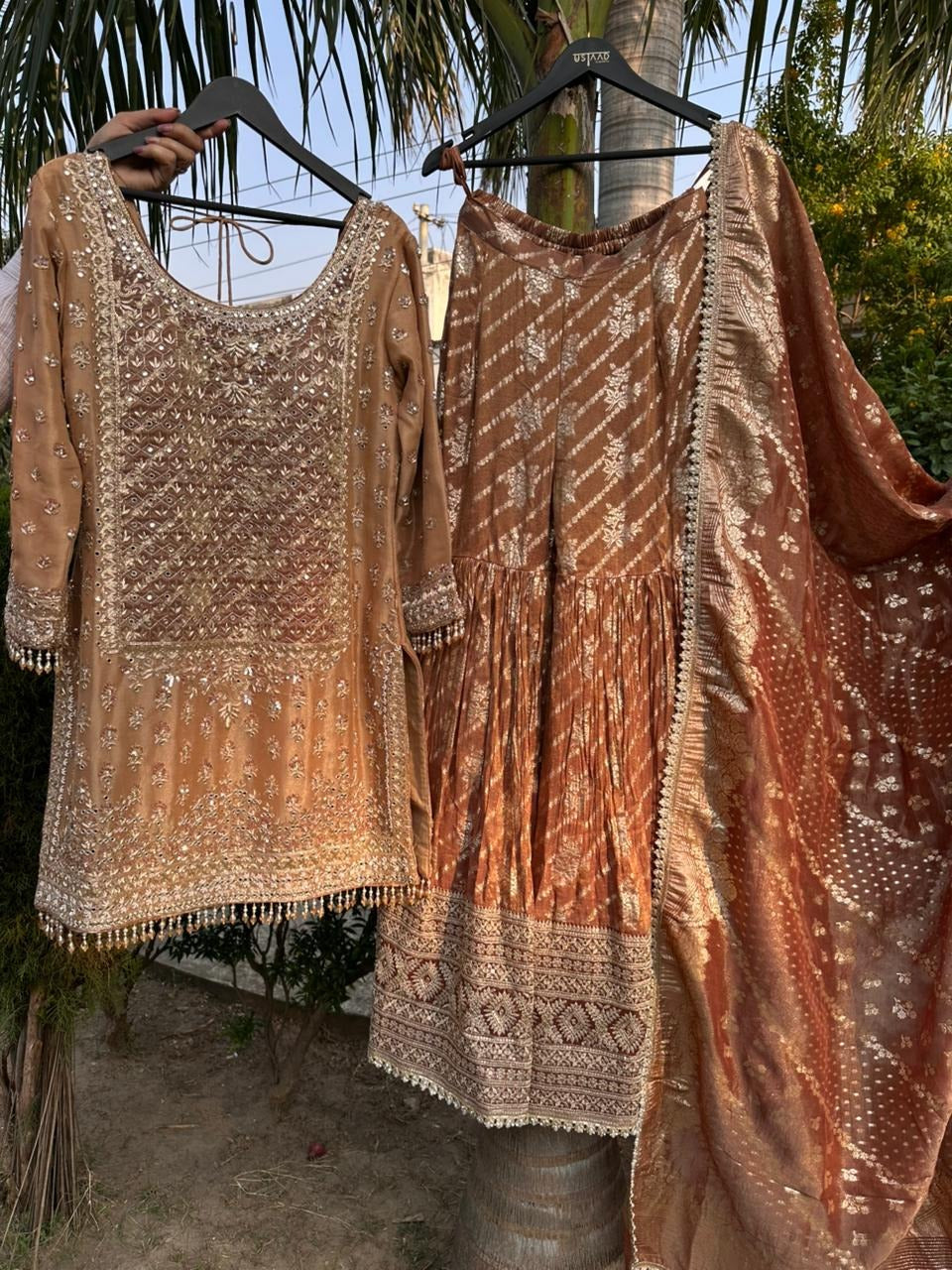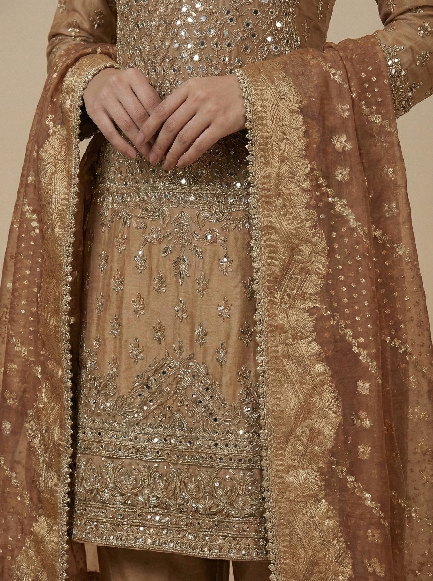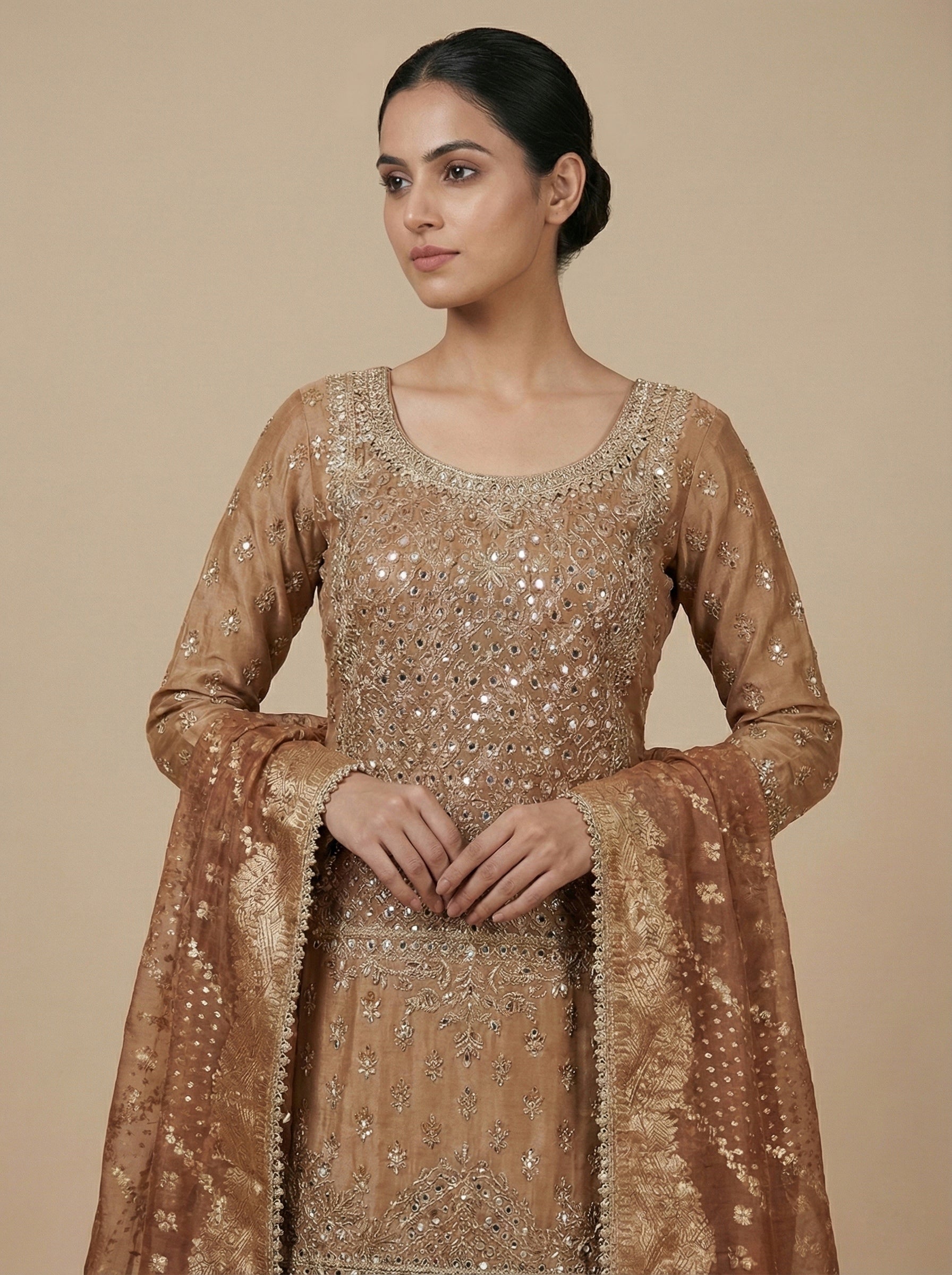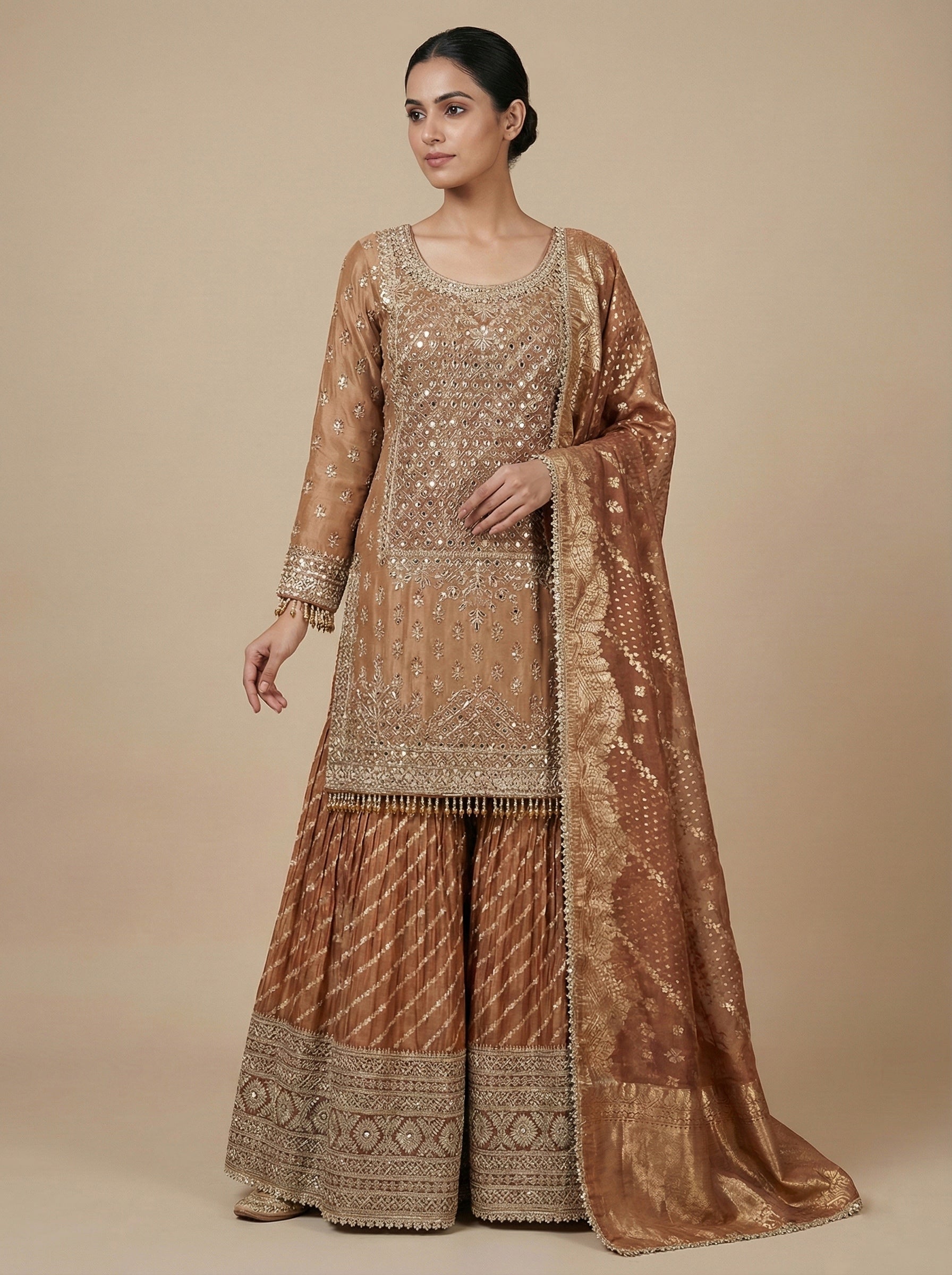 Elevate Your Festive Wardrobe With This Stunning Shimmer Silk Ensemble In A Rich Caramel–Golden Hue. The Outfit Features A Beautifully Hand-Embellished Shimmer Silk Shirt, Adorned With Intricate Embroidery And Delicate Beadwork For A Luxurious, Radiant Finish. Paired With A Traditional Banarsi Garara Bottom, The Fabric Showcases Classic Motifs And Opulent Zari Detailing, Adding Timeless Charm And Graceful Volume To The Silhouette. Completing The Look Is A Matching Banarsi Dupatta, Crafted With Elegant Patterns And A Soft Metallic Shine, Perfectly Tying The Entire Outfit Together With Sophistication And Cultural Richness. This Outfit Is Ideal For Weddings, Festive Events, And Celebrations Where You Want To Make A Refined, Graceful Statement.