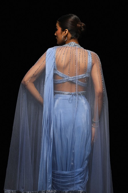 | Celesti is a drape saree with a cape enclosed at the neck. There is a belt like band attached from the center front of the blouse. The bouse has a sweetheart neckline. |