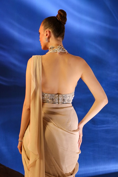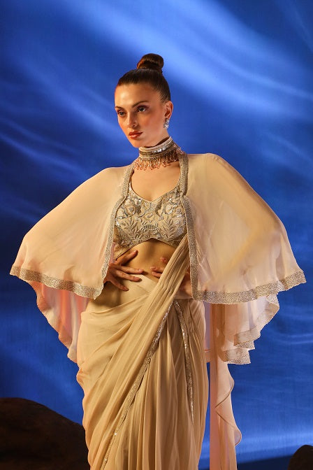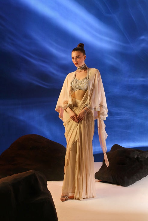 | A saree but make it Ceto! Captivating and chic, this ensemble is our interpretation of a modern-day saree that stands apart from the crowd. It features a delicately embroidered halter neck blouse with double draped saree and high-low hemline cape to refine the look further. |