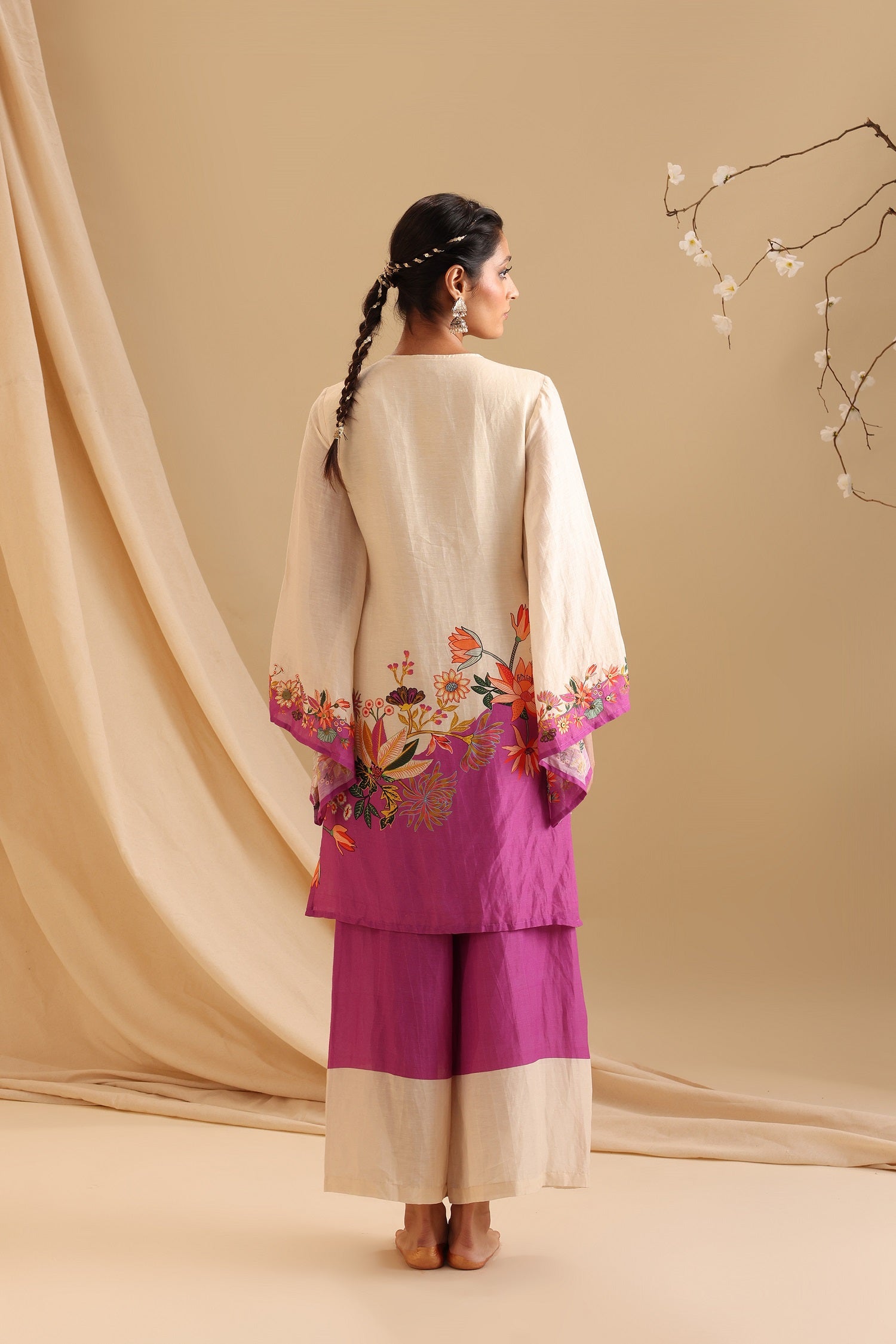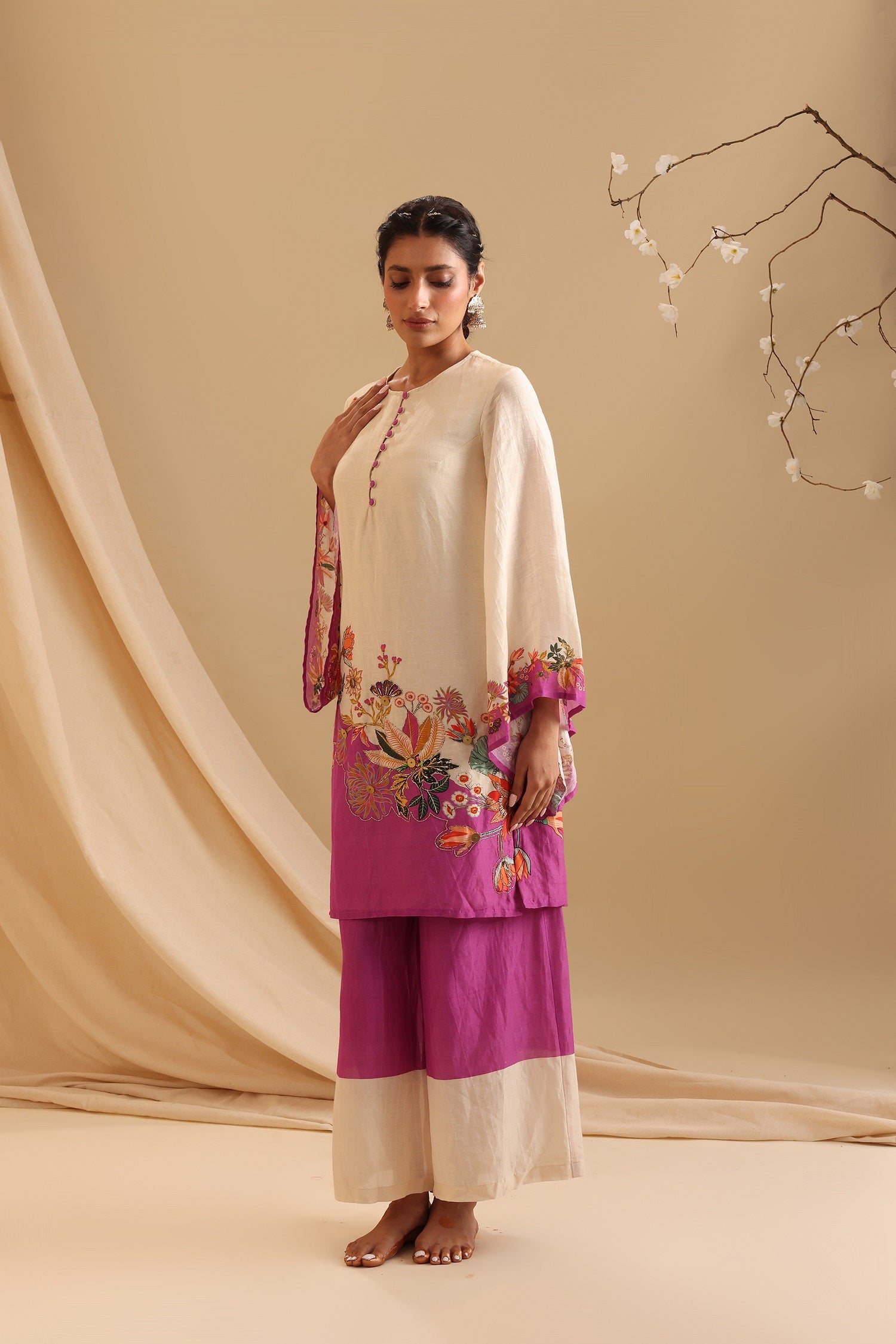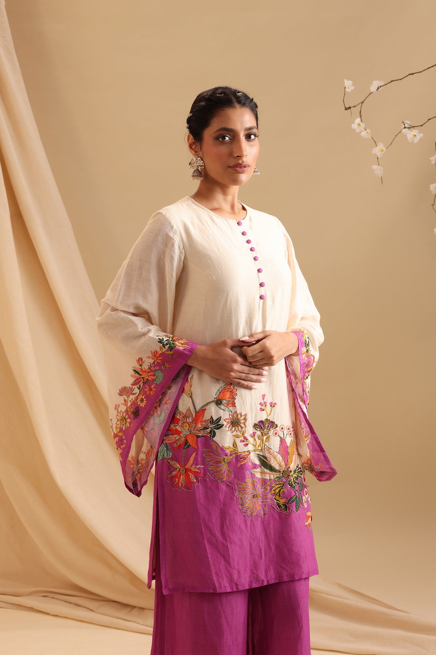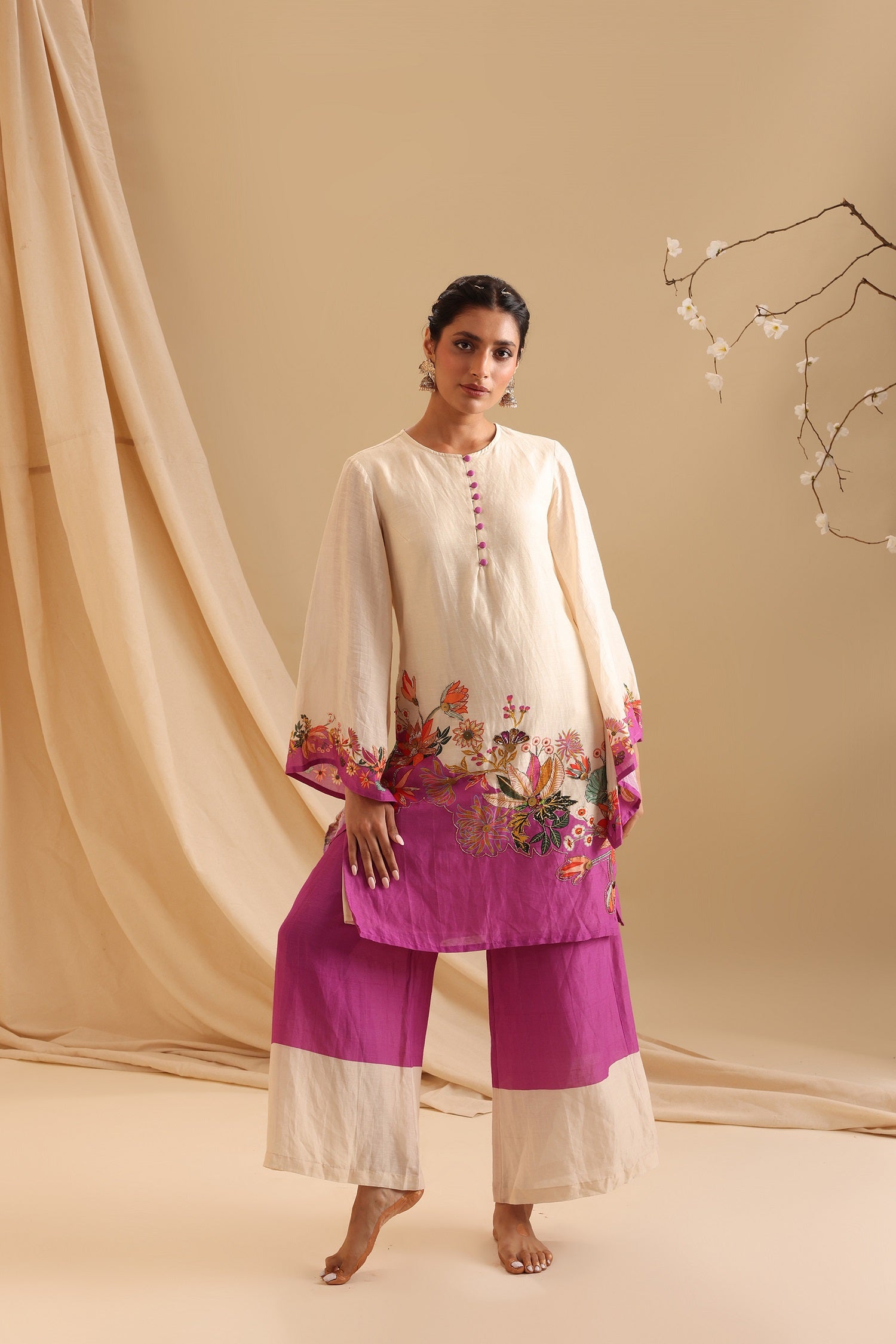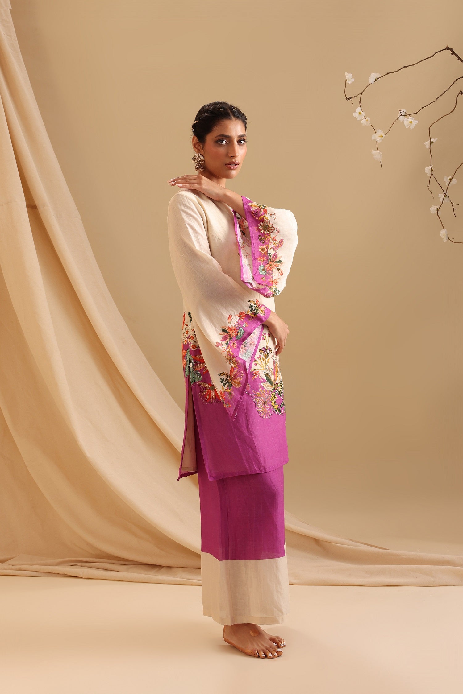 "Cream Aarani embellished colourblock kurta with pants in malaysian silk