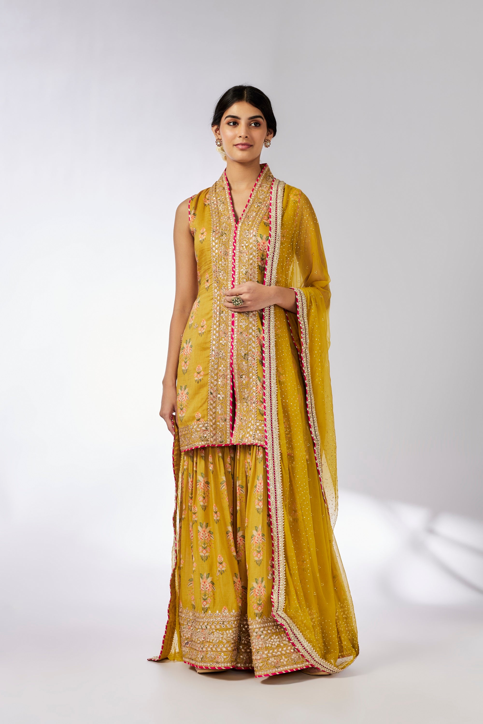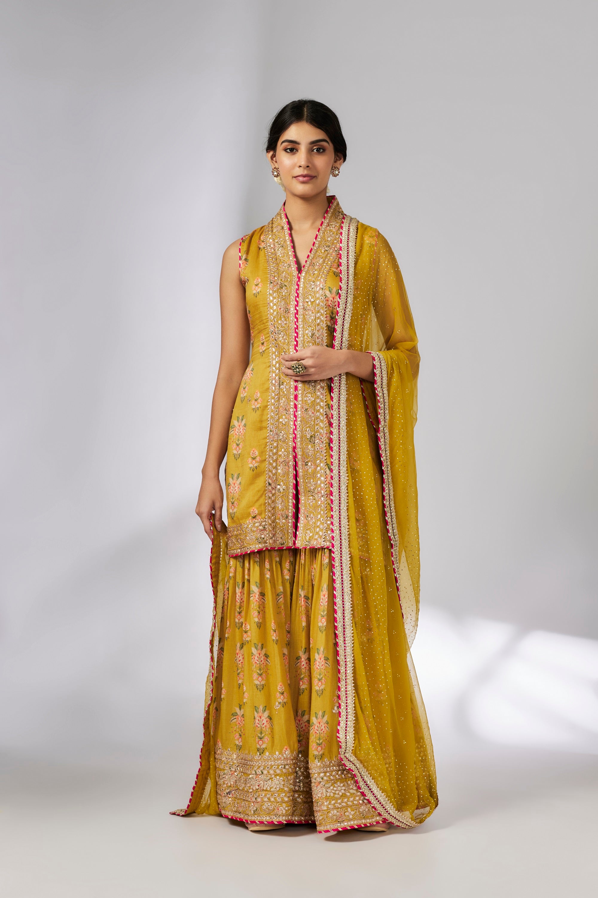 | This pretty ensemble of floral jaal , with an intricate border embroidery. The sleeveless kurta is embellished all the way down the front, and tried with a smart pleated magzi to finish the neckline and armhole. The flowing Sharara bottom with gota embroidery still has a lot of flounce and flow. |