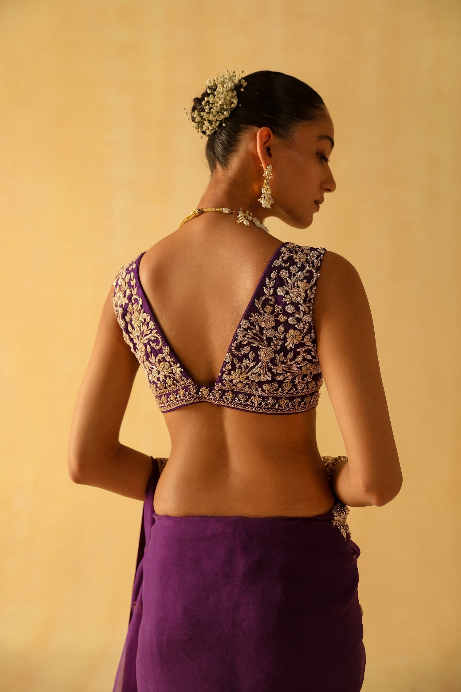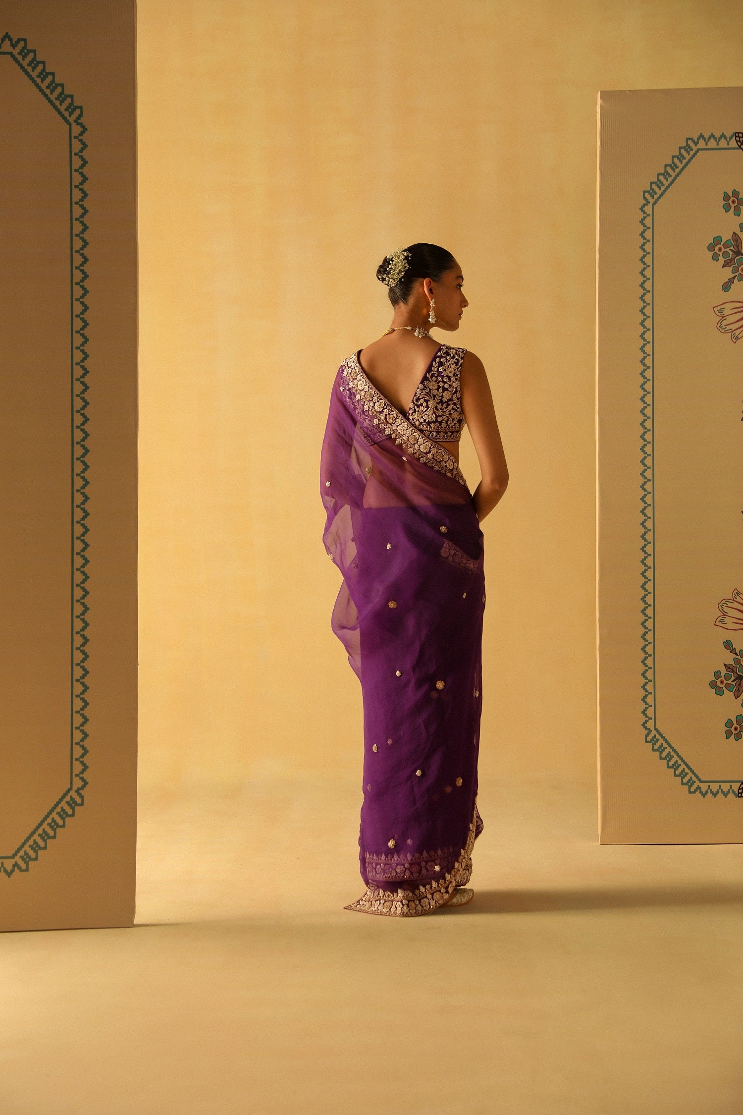 "Our Hannah Saree is crafted from luxurious Silk Organza threads, adorned with detailed Dabka Zardozi embroidery. It comes with a matching Raw Silk blouse, also intricately embroidered.