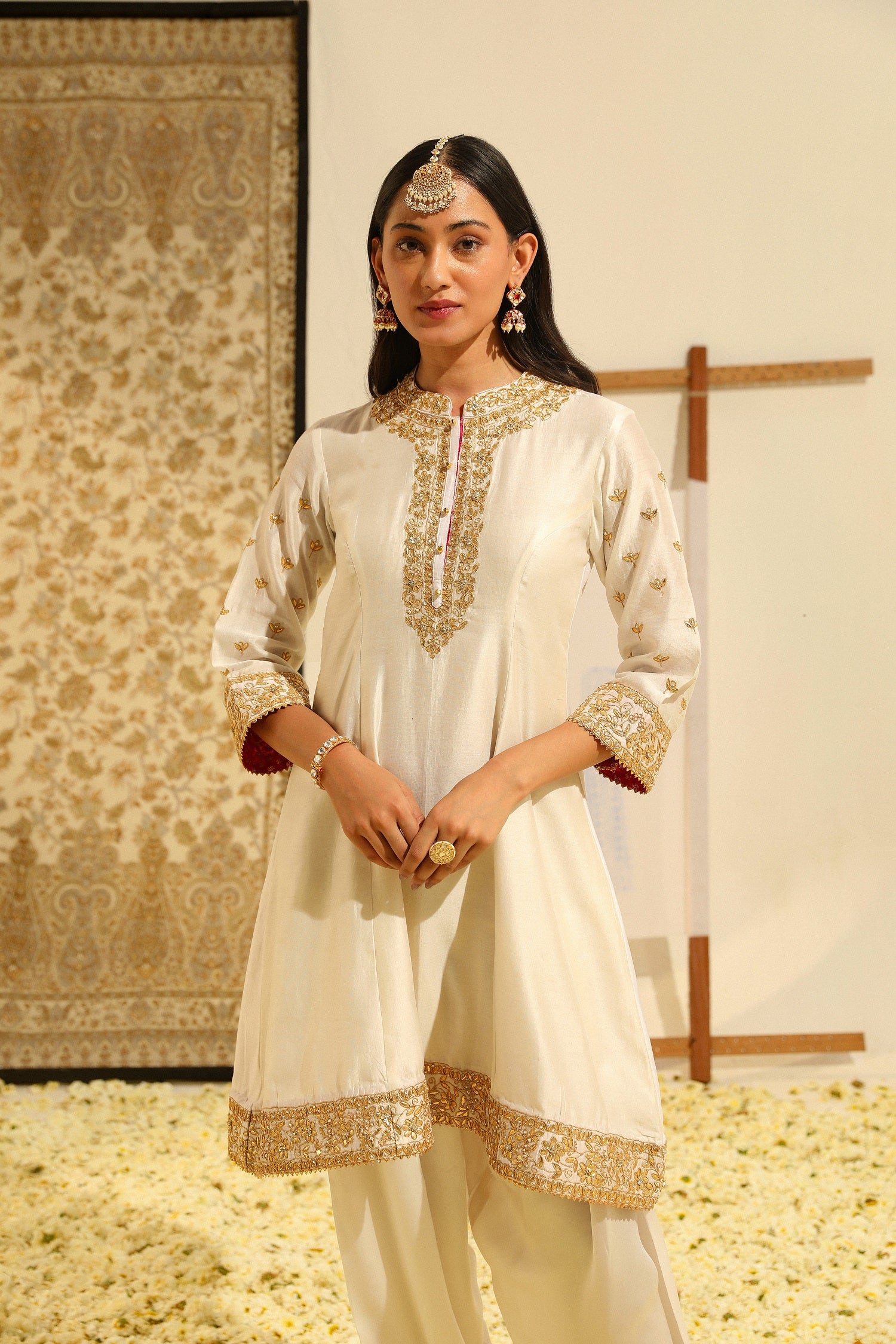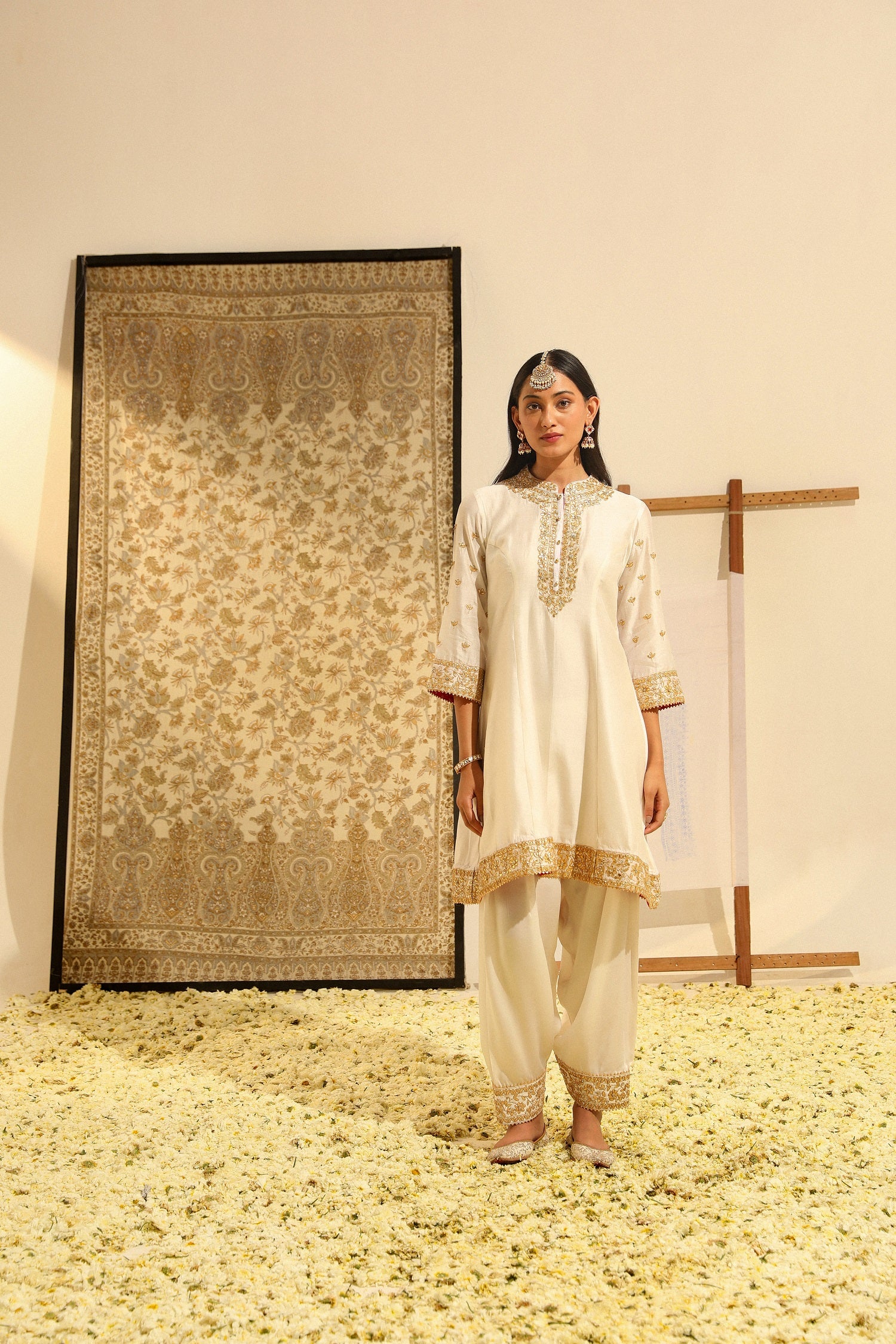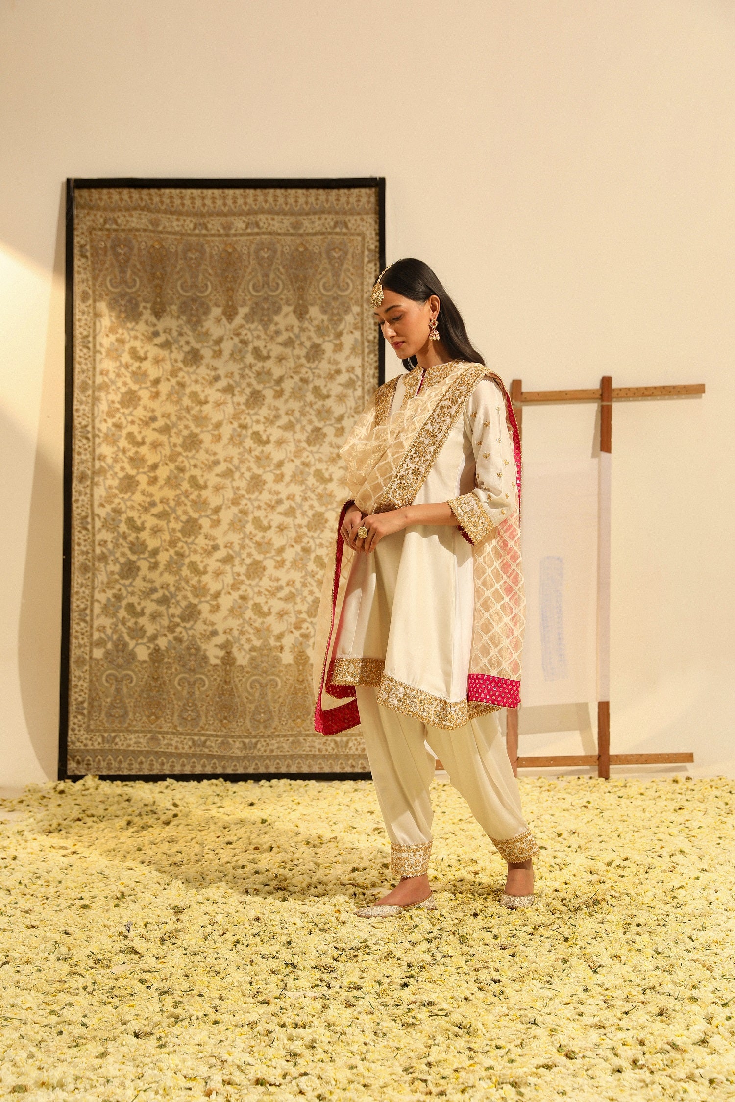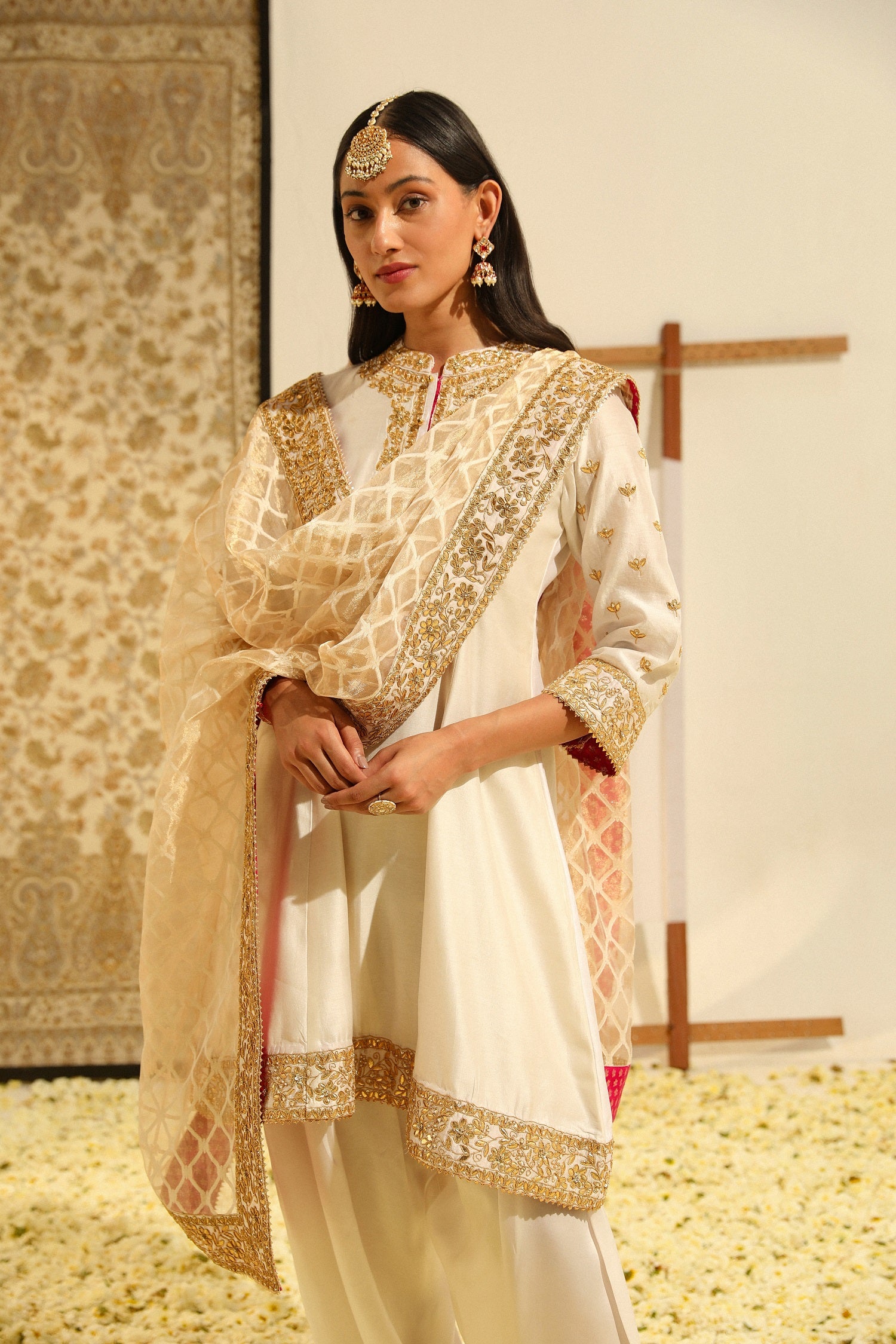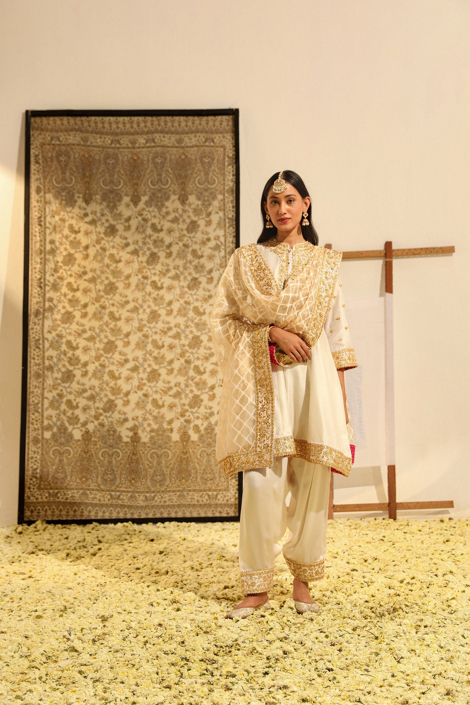 "The Intezaar ensemble showcases intricate hand work on a princess-cut silhouette. This luxurious and comfortable fabric is embellished with heritage Gota Patti and Dabka Zardozi Embroidery. It features a Mandarin collar with a placket and three-quarter sleeves. The look comes together with a salwar & a silk organza tissue dupatta. The ensemble is accented with gota and finished with an exclusive Chanderi Silk Banarsi fabric.