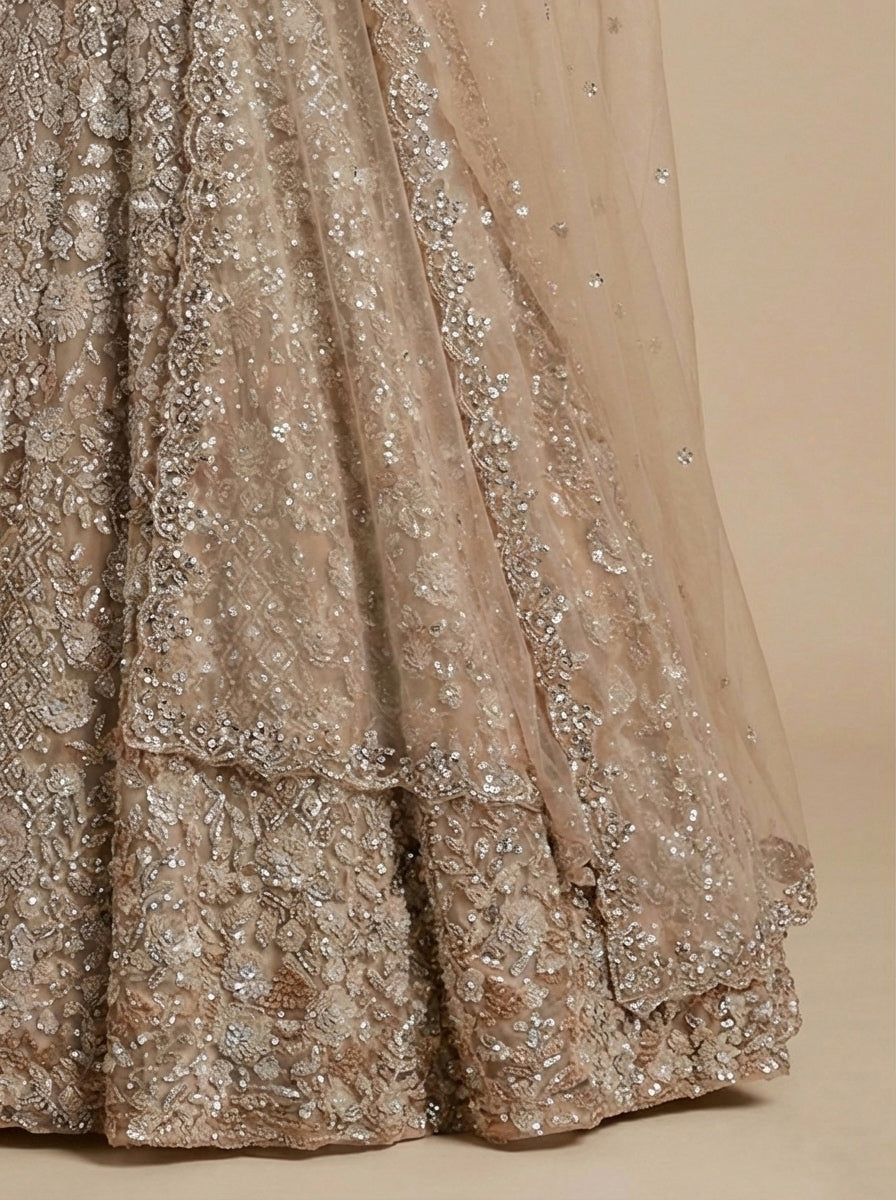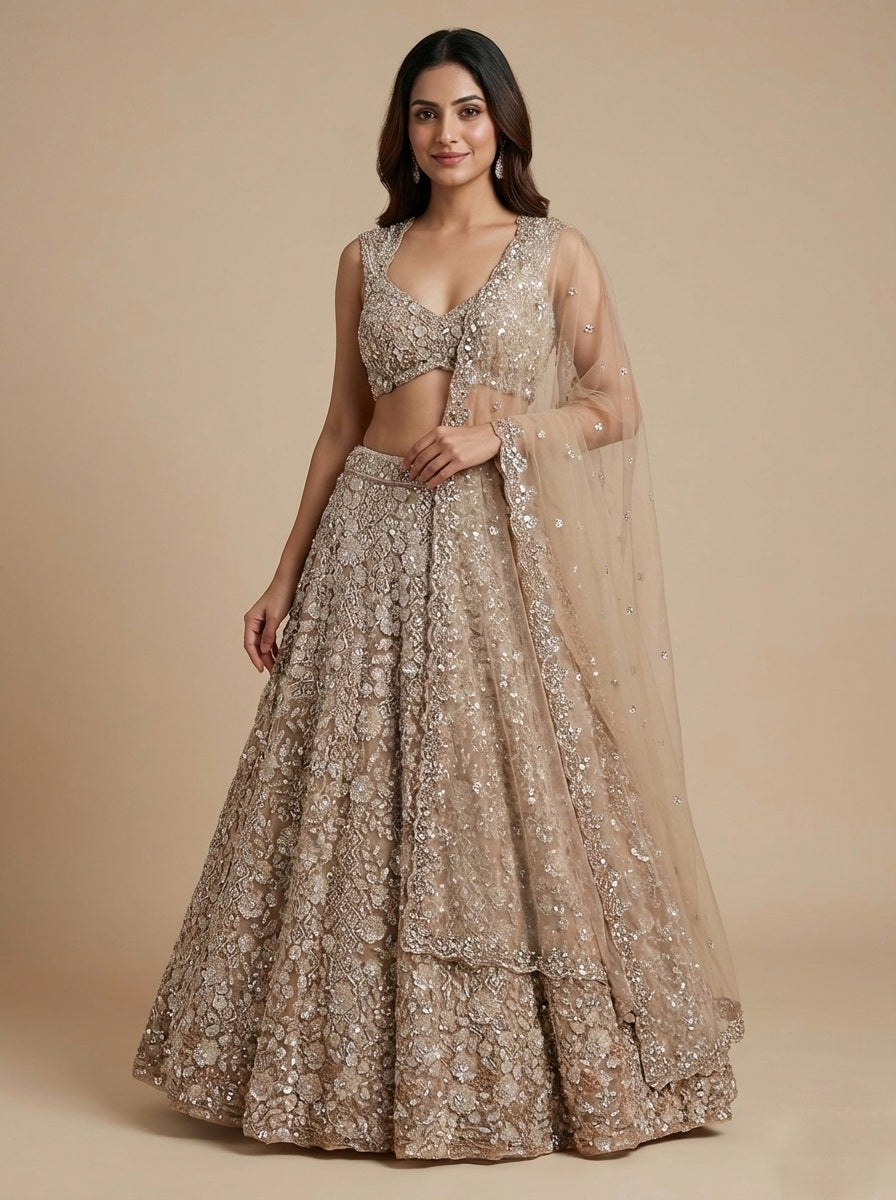 Step into elegance with this luxury champagne-gold lehenga set, crafted to make you shine at every celebration. The outfit features a heavily embellished flared lehenga adorned with intricate sequin, zari, and thread embroidery that catches the light beautifully from every angle. The matching hand-embroidered blouse is richly detailed, offering a glamorous and perfectly coordinated look. Completing the ensemble is a soft net dupatta in a matching champagne tone, decorated with a delicate sequin border for an extra touch of sparkle. Made from premium net and silk-blend fabric, this lehenga ensures both comfort and grandeur—perfect for weddings, engagements, receptions, sangeet nights, or any event where you want to stand out.