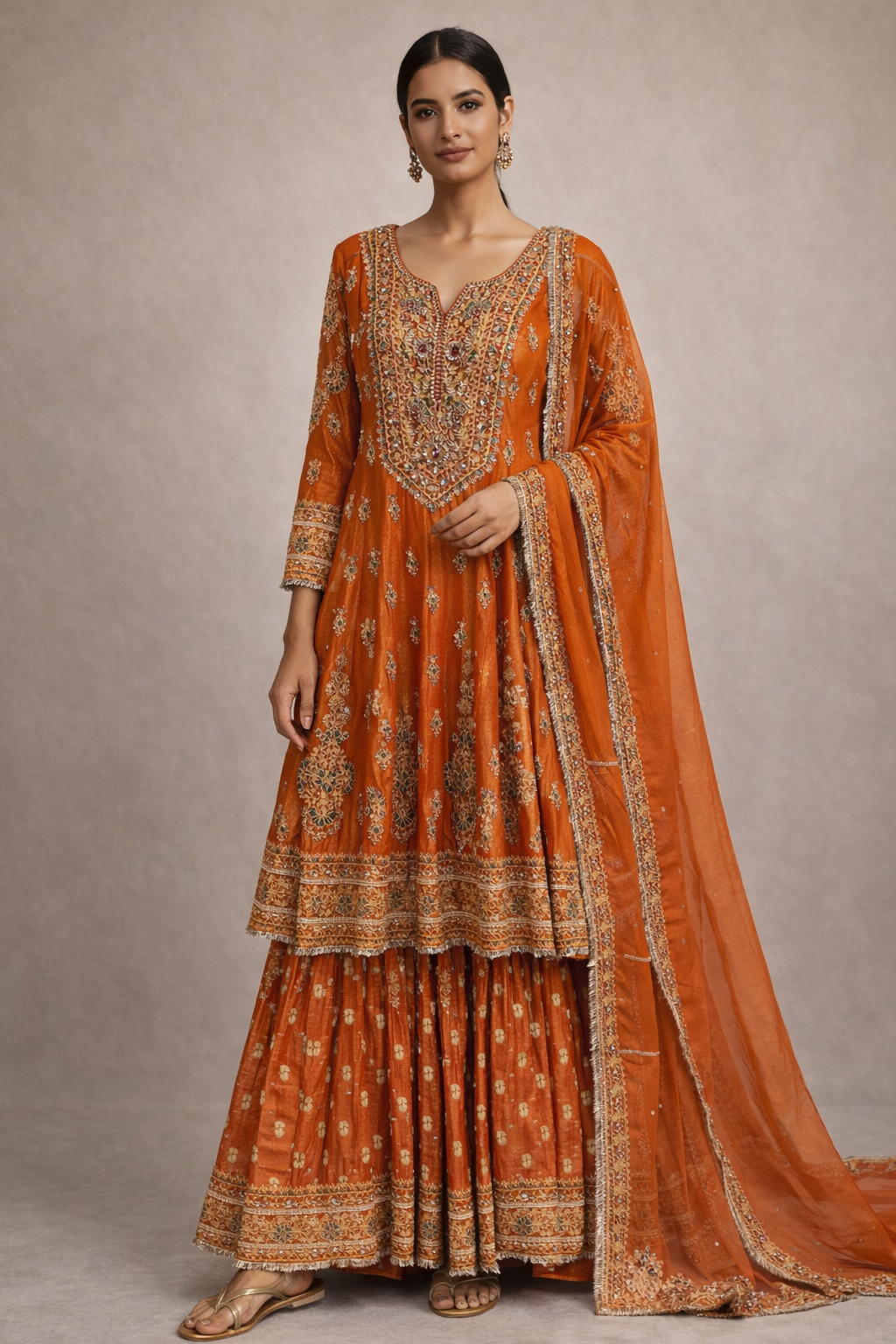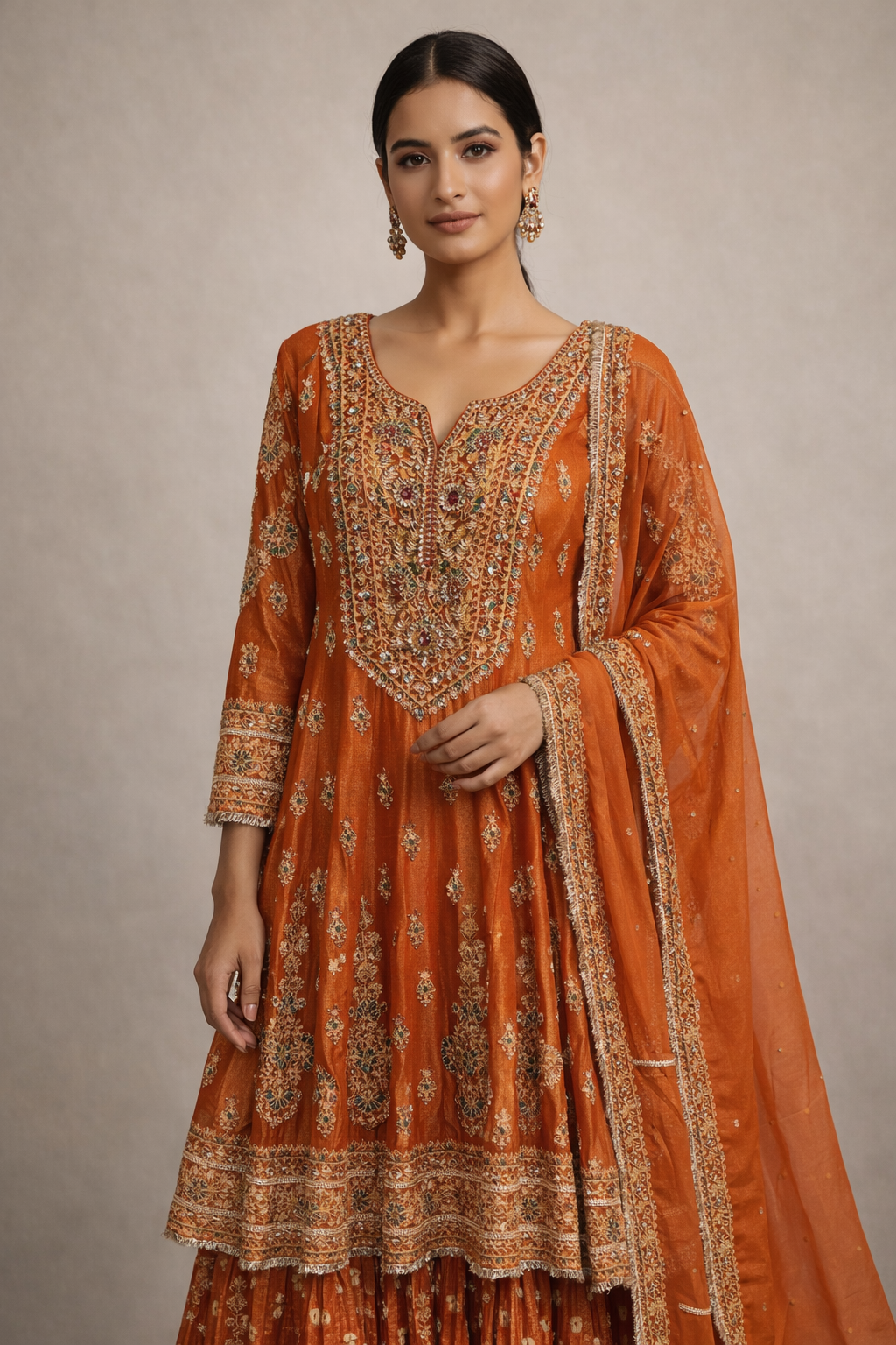 Elevate your festive wardrobe with this exquisite orange shimmer tissue suit set, crafted to exude elegance and traditional charm. The kurta features intricate hand-embroidered detailing with rich zari and thread work on the neckline, sleeves, and hem, adding a luxurious touch. Paired with a beautifully flared matching bottom adorned with delicate motifs, the set offers both comfort and style. Completing the look is a lightweight shimmer tissue dupatta with an embellished border, enhancing its festive appeal. Perfect for weddings, festive celebrations, and special occasions, this suit set effortlessly blends timeless craftsmanship with contemporary elegance.