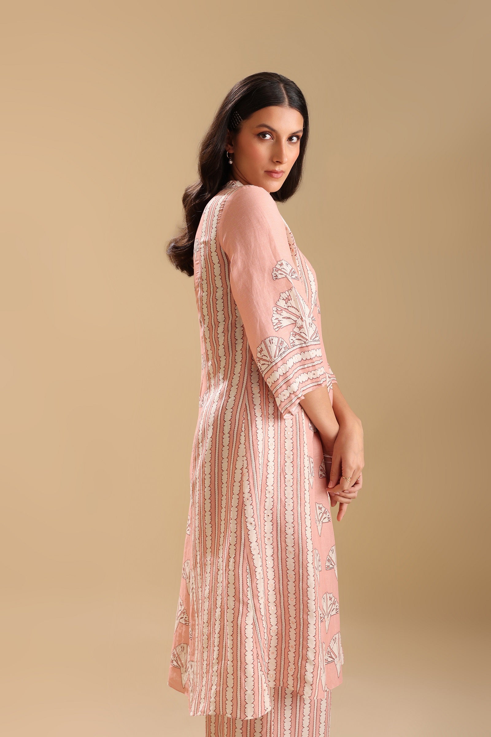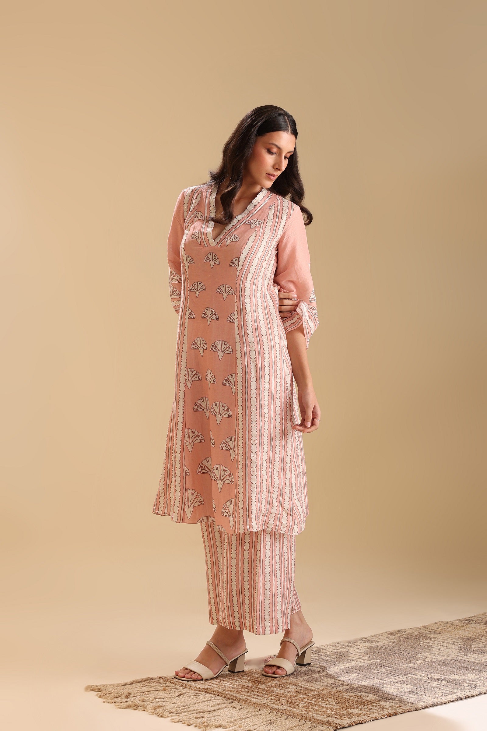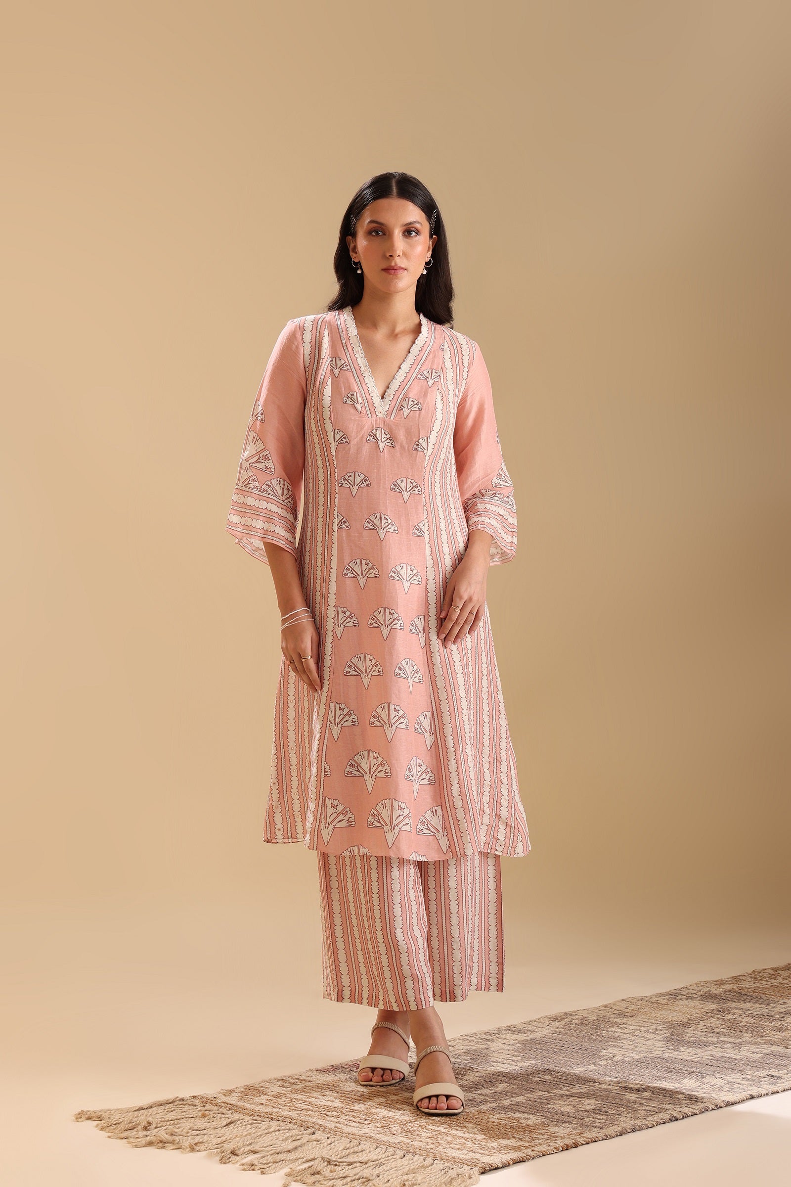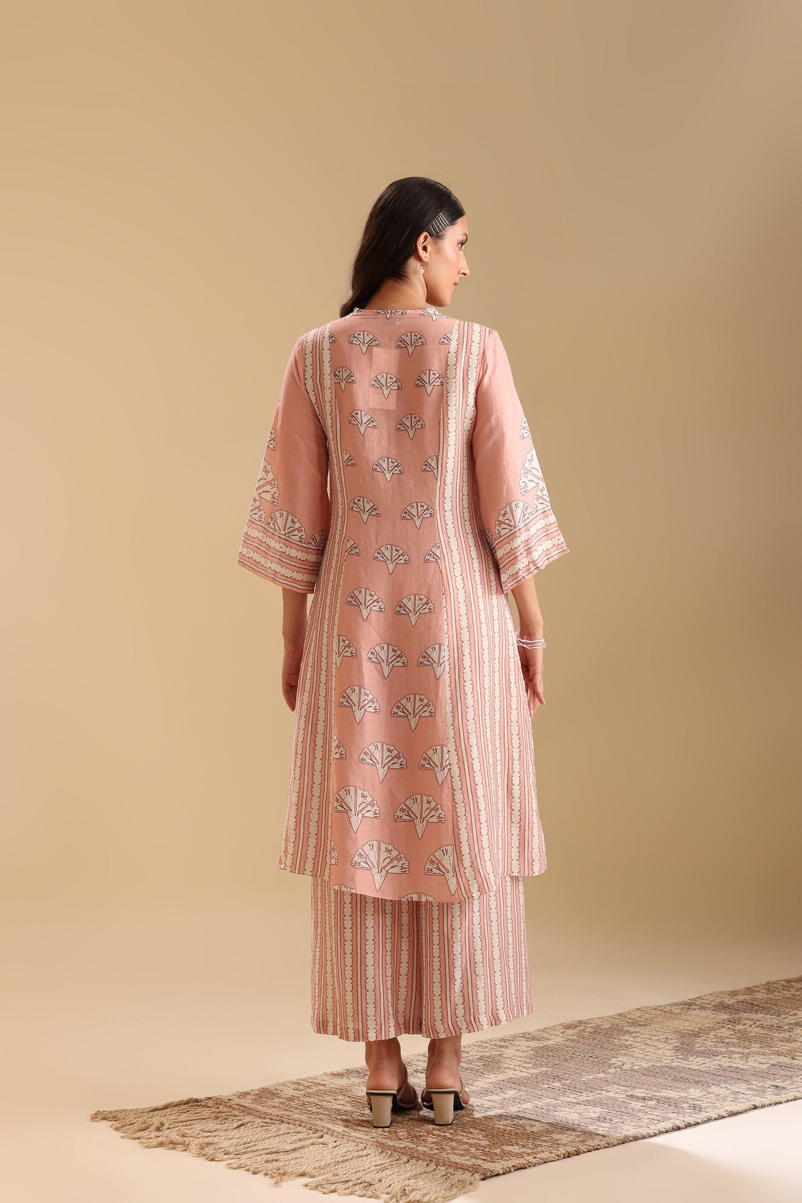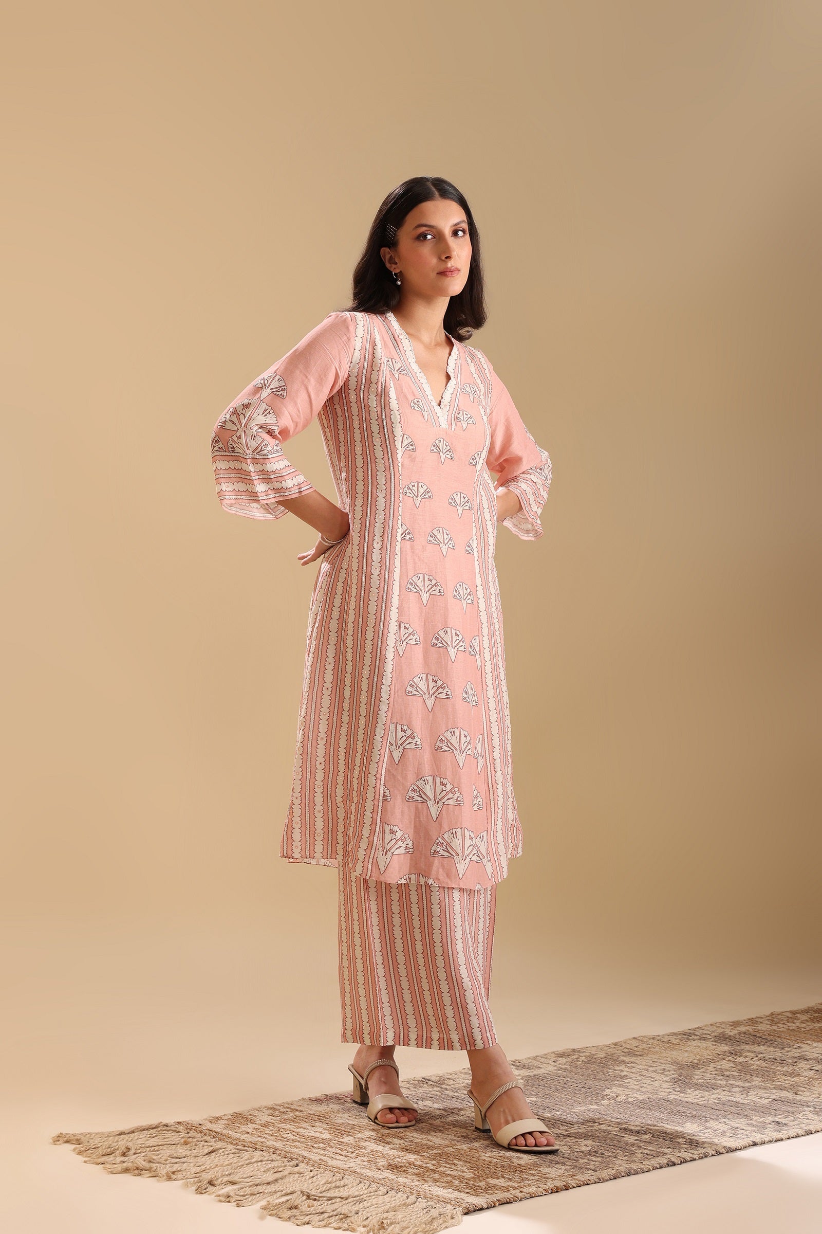 "Peach Naqsh embellished Straight kurta paired with Pants in linen cotton