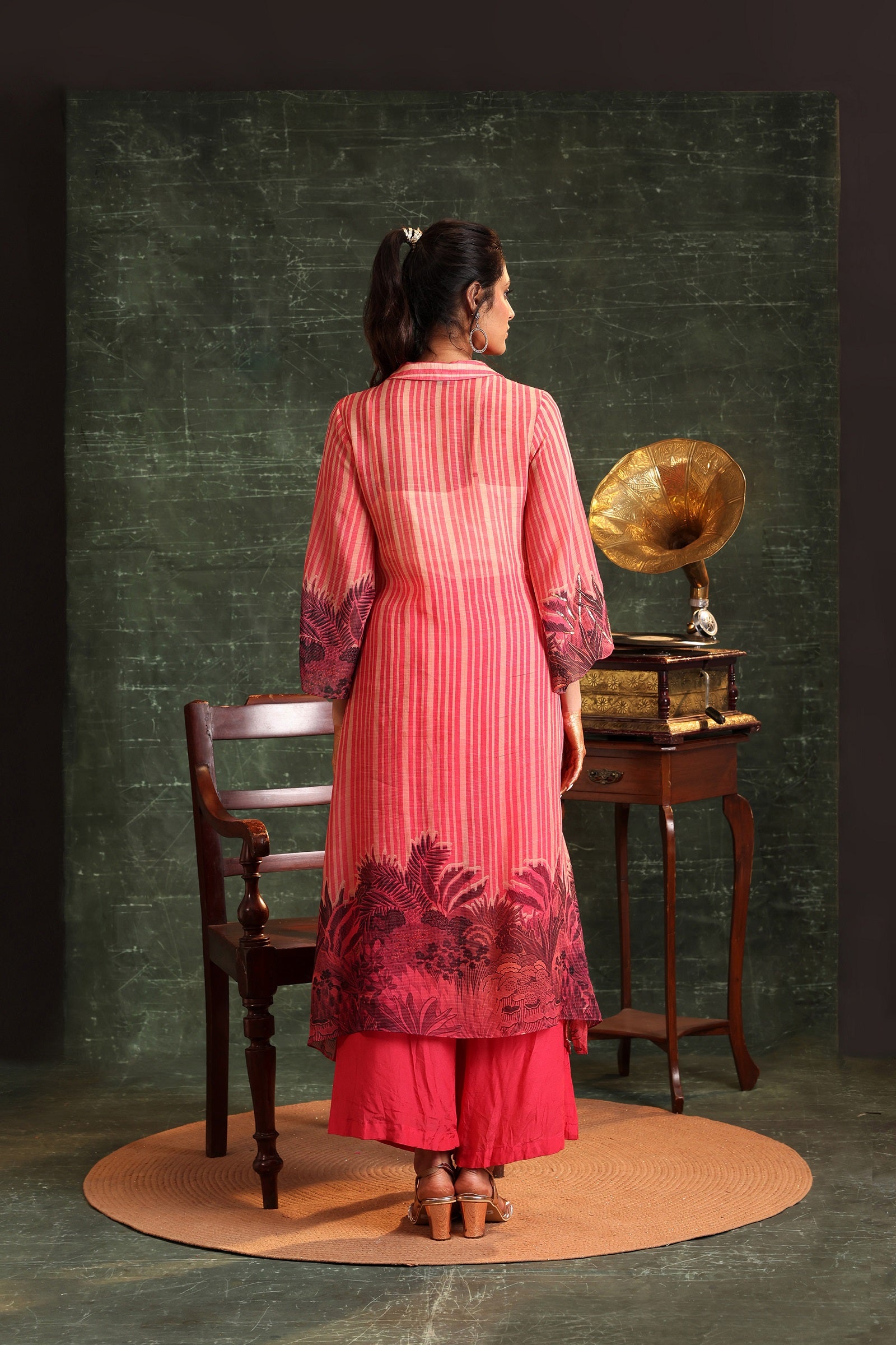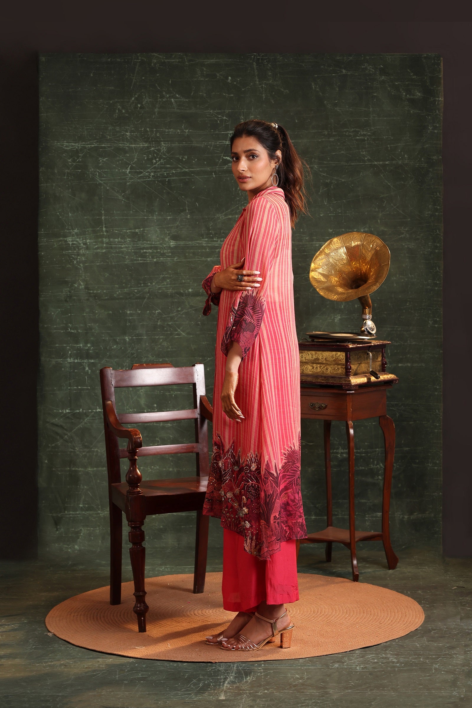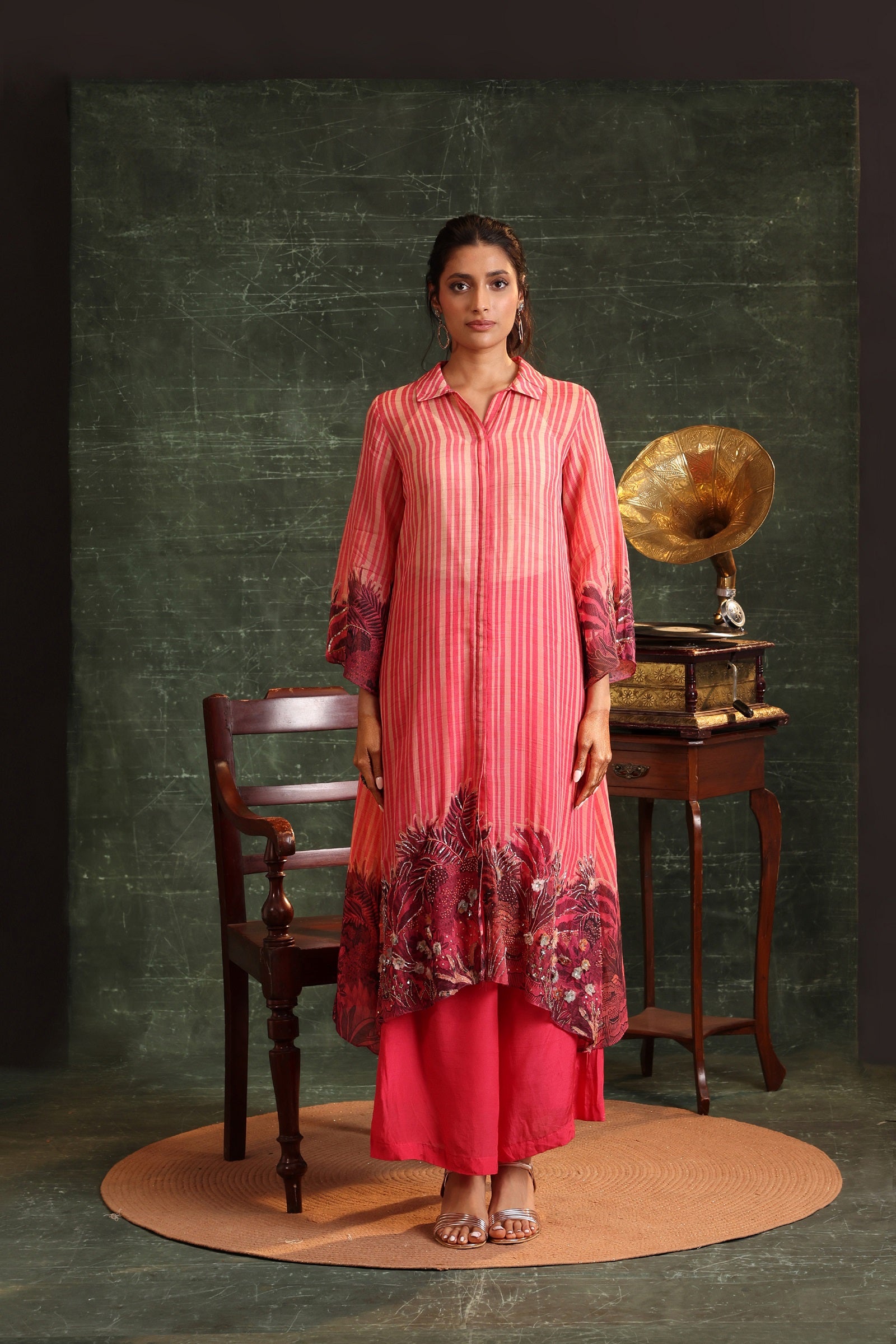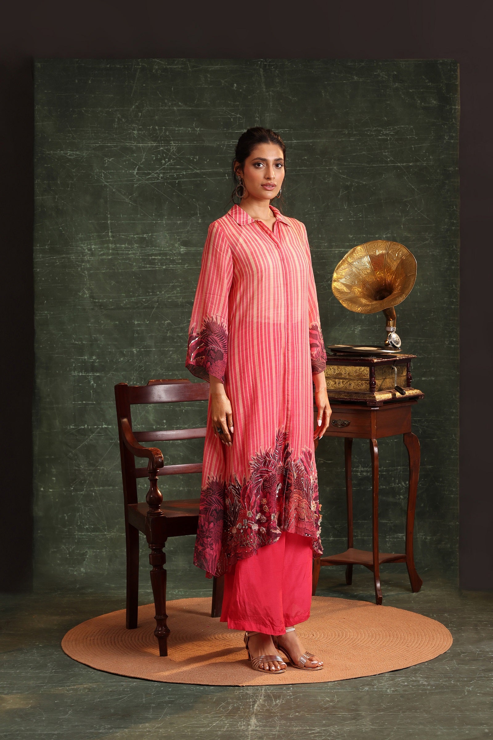 "Pink Kaira Embellished Shirt Kurta in Organza paired with solid Chanderi pants.