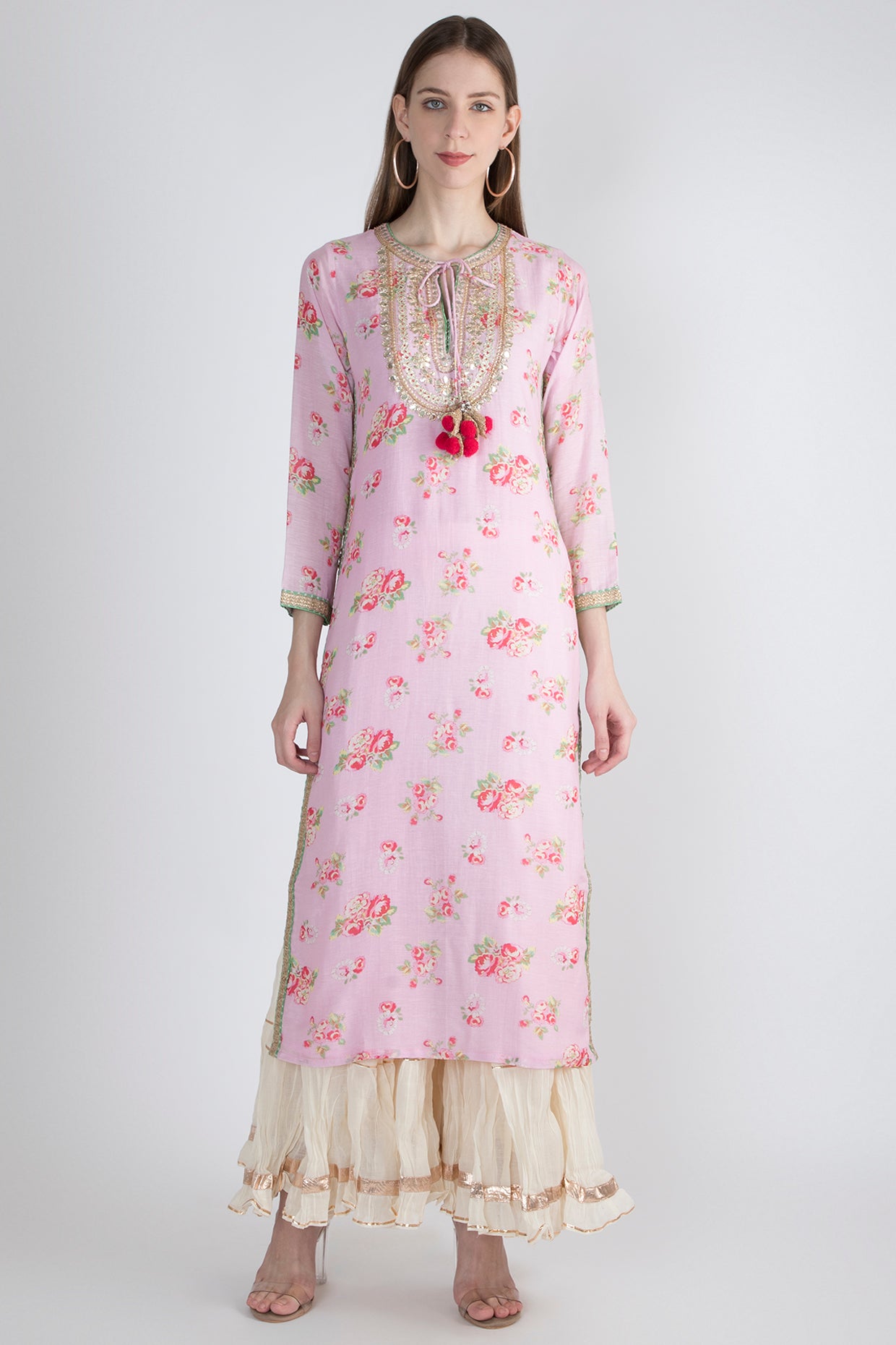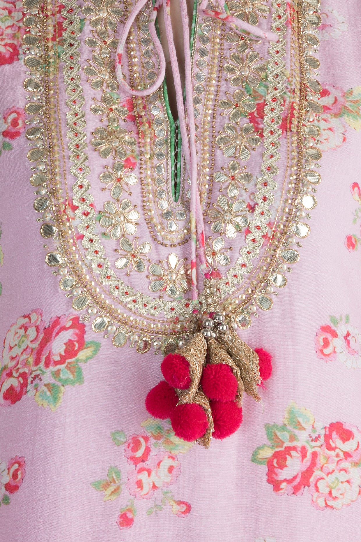 Featuring A Pink Kurta In Linen Georgette Base With Print. It Has Hand Embroidered Gota Work Neckline And Slit Detail.