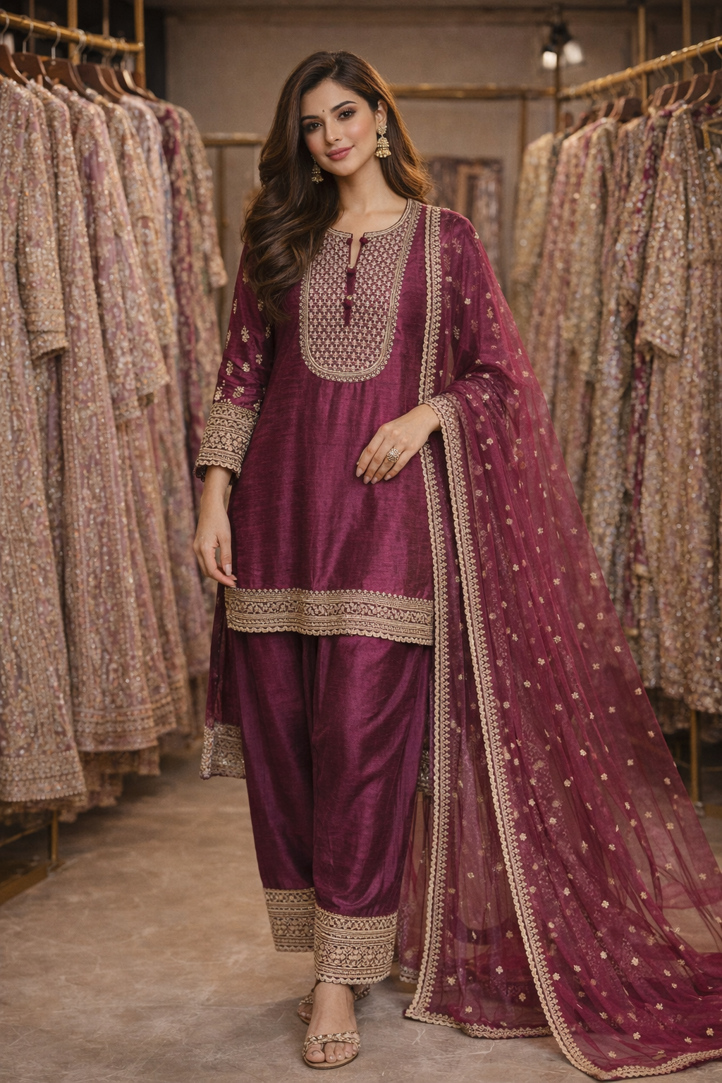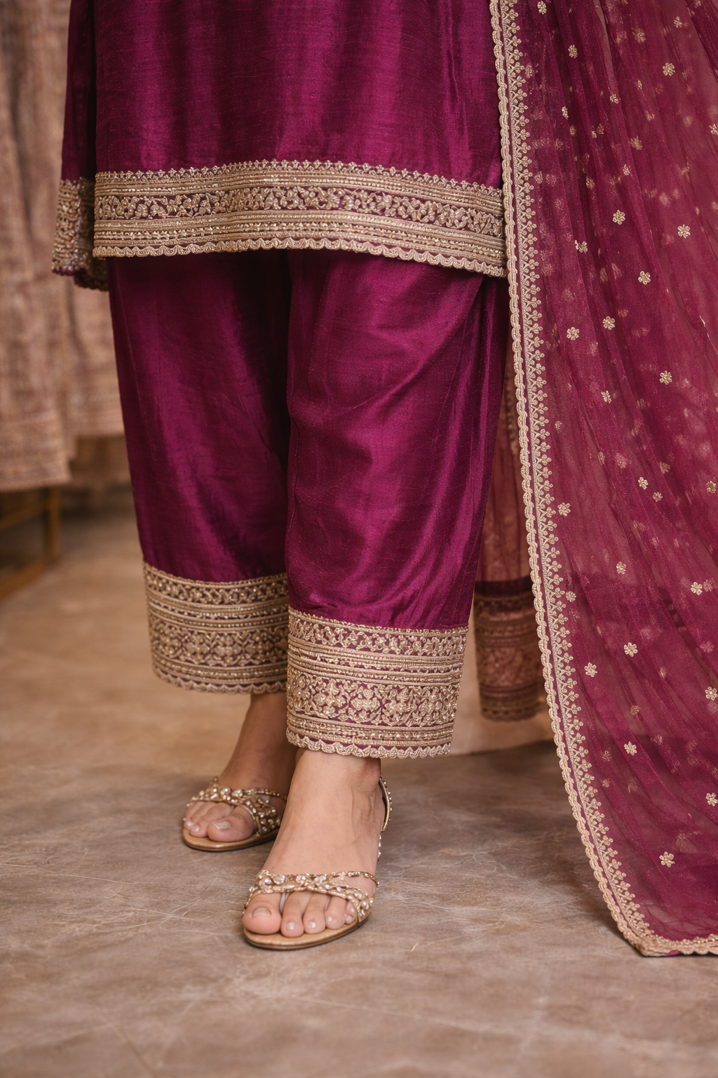Make a refined statement with this elegant Pure Raw Silk Kurta Palazzo Set, designed for timeless festive and occasion wear. The kurta is crafted from premium pure raw silk in a rich wine purple hue, featuring intricate gold embroidery on the yoke, sleeves, and hem that reflects traditional craftsmanship with a contemporary silhouette. Paired with matching raw silk palazzo pants, the ensemble offers both comfort and graceful flow. The look is completed with a lightweight, sheer dupatta adorned with delicate gold motifs and an ornate embroidered border, adding a regal finishing touch. Perfect for weddings, festive gatherings, celebrations, and special occasions, this outfit blends luxury fabric, classic colour, and fine detailing for an effortlessly sophisticated appearance.