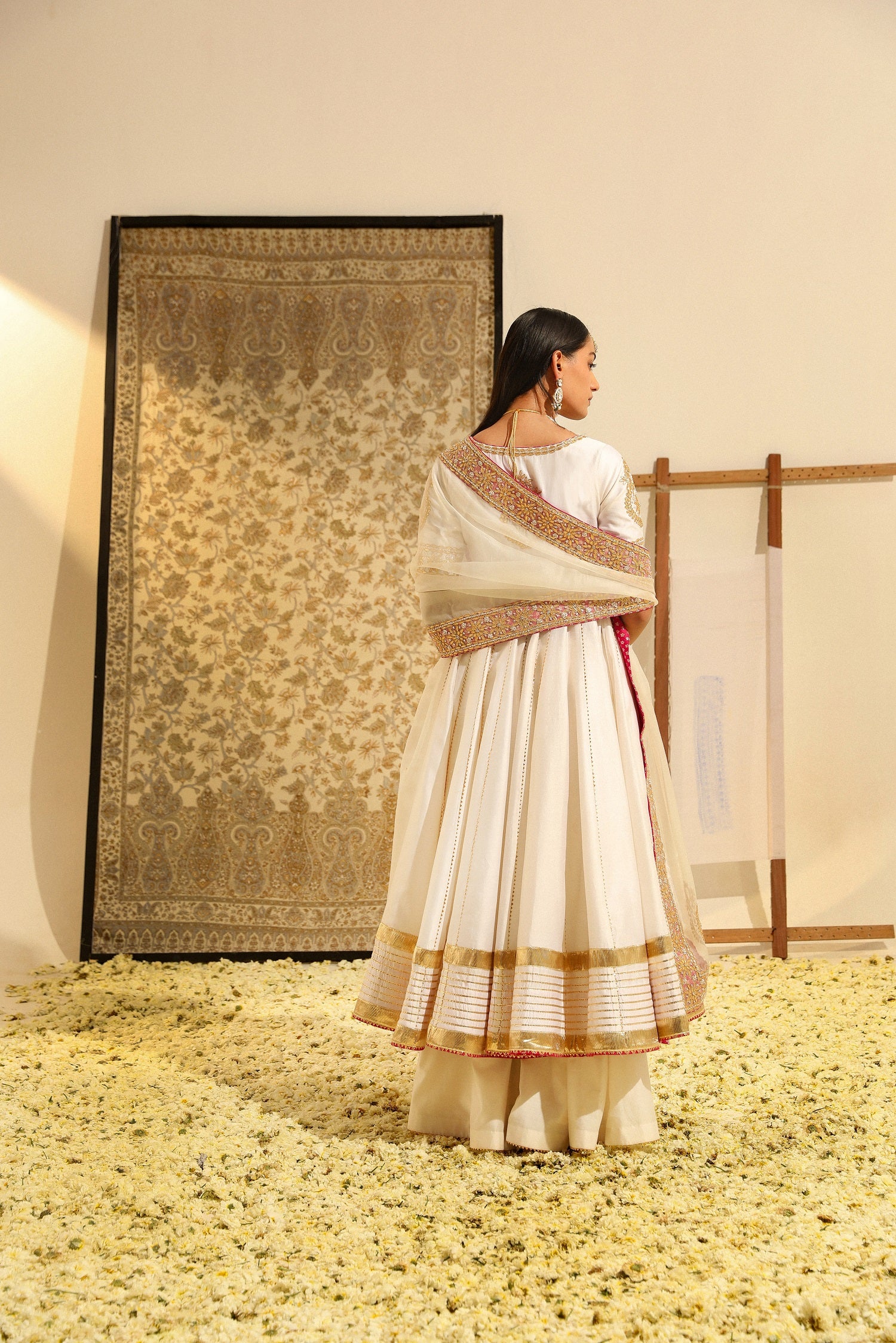 "The Shaiz ensemble showcases intricate hand work on an ankle-length kalidaar anarkali, made in pure Silk Chanderi fabric. This luxurious and comfortable fabric is embellished with heritage Gota Patti and Dabka Zardozi Embroidery. The ensemble is teamed up with a skirt and a silk organza dupatta. The look features a broad V neck on the front, a zero back and elbow sleeves. The outfit is highlighted with Barsa Moti's and finished with an exclusive Chanderi Silk Banarsi Fabric.