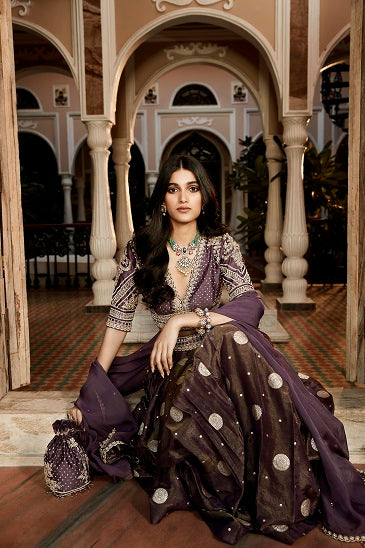The Kashi lehenga for the 22-23 season is crafted on tissue banarasi with a silken chanderi blouse. Hand dyed in our Burnt Lavender colour, introduced this season. The lehenga is adorned with Matsya's signature kachi dori & zardozi. The dupatta is in a georgette organza, light weight & flowy with detailed corners in couture embroidery.