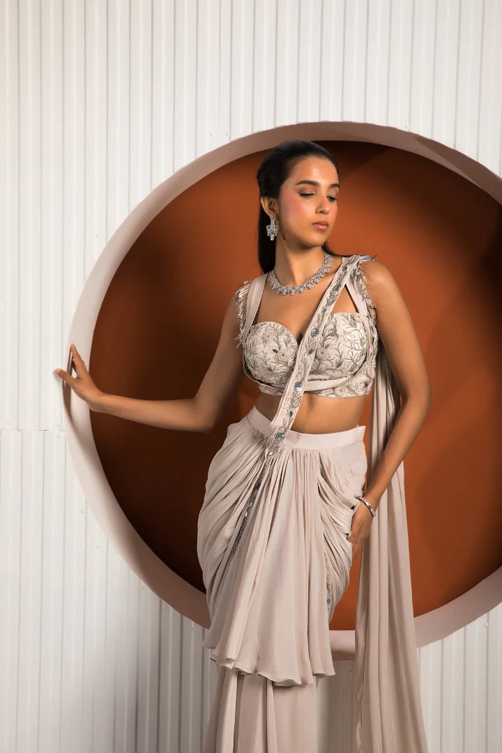 | A magnificent blend of lovely pink gray hues and exquisite design is this gorgeous drape for your next soiree look. Featuring a 3-tiered ruffle layered on the body with equally complementary Bralette blouse, this creation is bound to fetch you compliments wherever you go. |