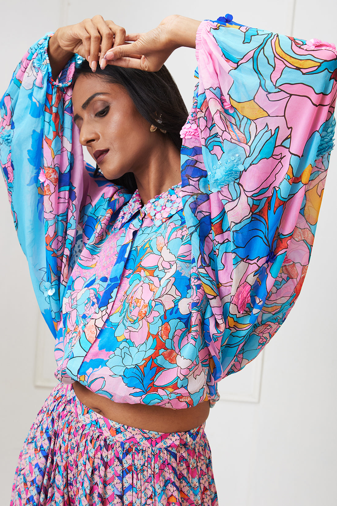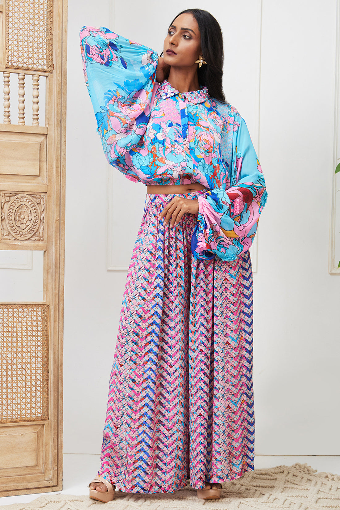| Zaynab Embellished Co-Ord Set Crafted With Meticulous Attention To Detail, This Set Is Designed To Make A Statement And Turn Heads Wherever You Go. The Star Of This Ensemble Is The Floral-Printed Shirt Top Made From Luxurious Crepe Fabric. The Floral Motif Adds A Touch Of Natural Beauty And Grace To Your Look. Complementing The Shirt Top Are The Chevron-Printed Flared Pants, Which Offer Both Trendiness And Comfort. The Flared Design Adds A Sense Of Movement And Drama To Your Outfit, Making It Perfect For Various Occasions. Whether You'Re Attending A Casual Brunch, A Daytime Event, Or A Special Gathering, This Ensemble Allows You To Make A Lasting Impression With Its Impeccable Design And Attention To Detail. |