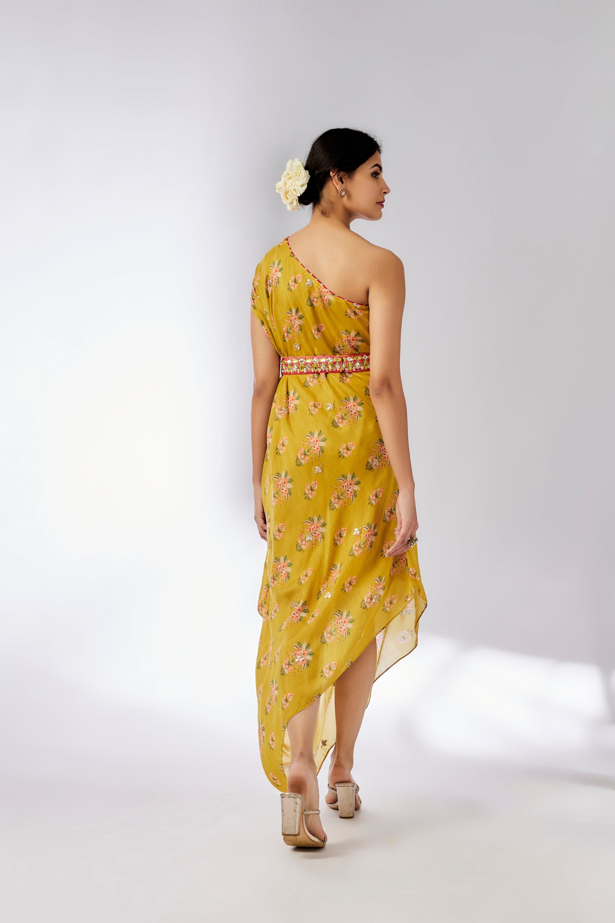 Using bold floral in happy colours, is the perfect choice for any day! This one shoulder gown is stylish and comfortable, with drape and enhanced neckline that gives a feminine feel. with waist belt.