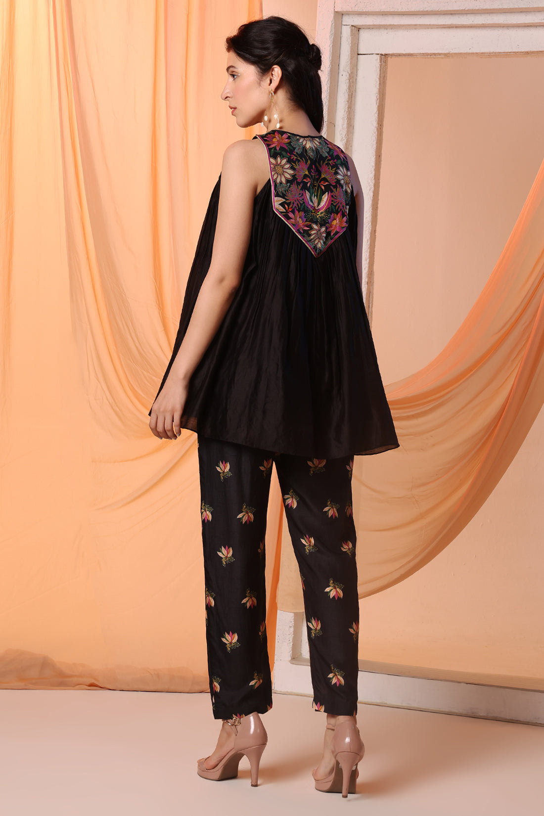 Black Aarani Gathered Top with Embroidered Neck Yoke in Chanderi, Paired with Printed Malaysian Silk Pants.