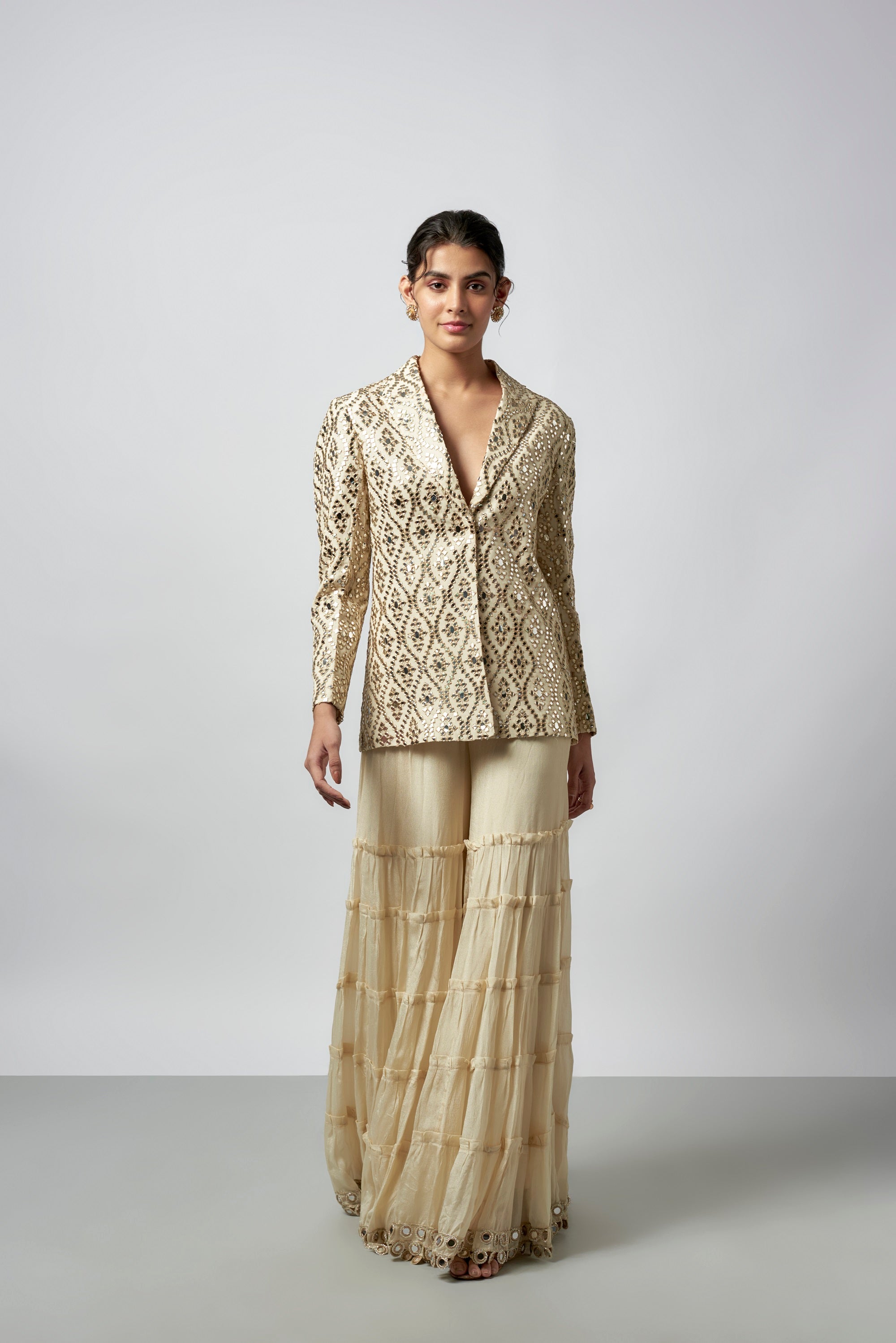 This Striking Fusion Of Traditional And Contemporary Design Features A Structured, Mirror-Embellished Jacket With Geometric Patterns. Paired With Flared, Layered Sharara-Style Pants With Subtle Pleated Detailing And Mirror-Accented Hems. Perfect To Make A Bold Fashion Statement .