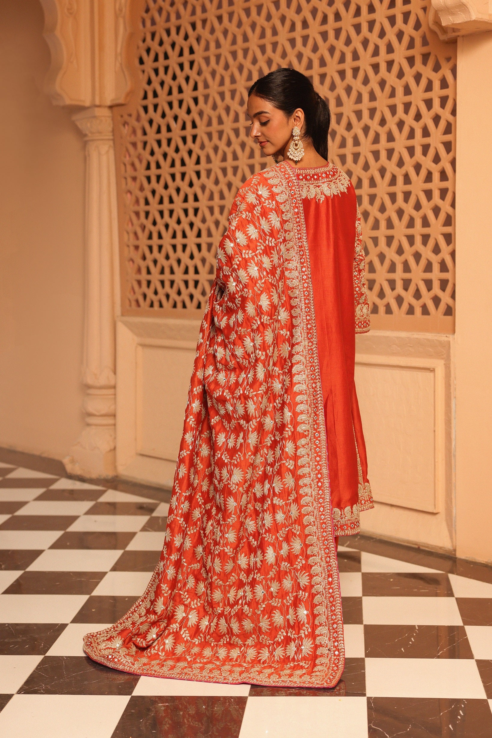 Aiman - burnt orange short knee length chauga with salwar and khada dupatta