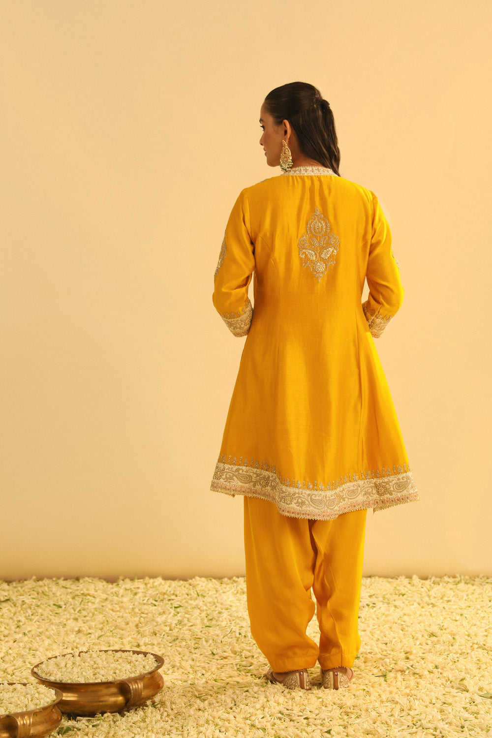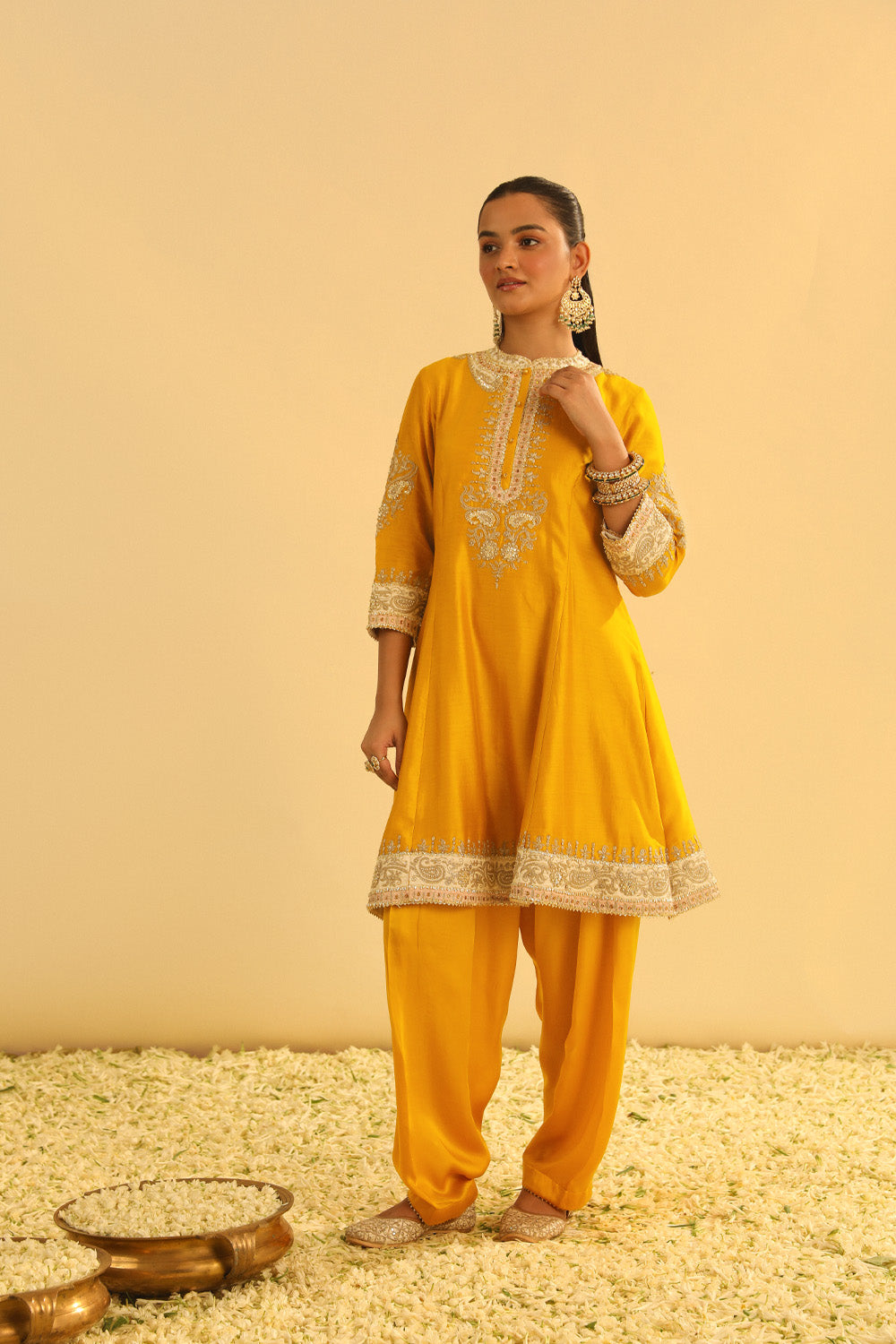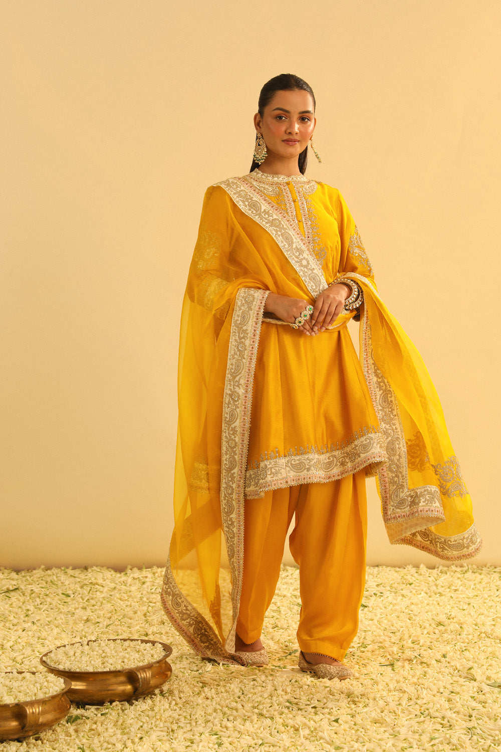 The Amani ensemble, crafted from luxurious Silk Chanderi, features our signature heritage Kashmiri Tilla embroidery. It is meticulously adorned with Appliqué, Gota and Kundan work. It features a zero neck with collar-placket, three quarter sleeves and is paired with a Salwar and dupatta. It makes use of Chanderi Silk Banarsi fabric for the final touch.